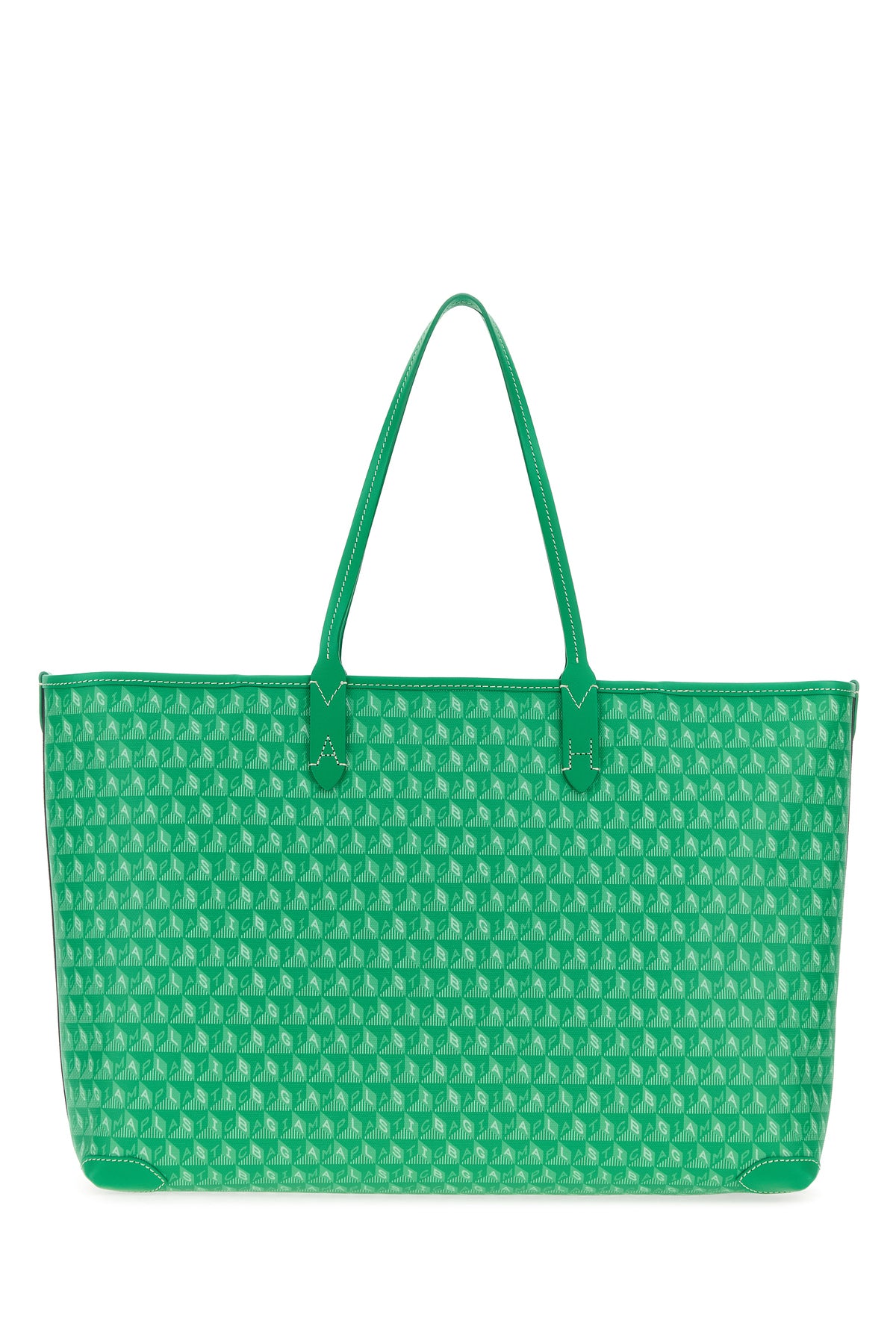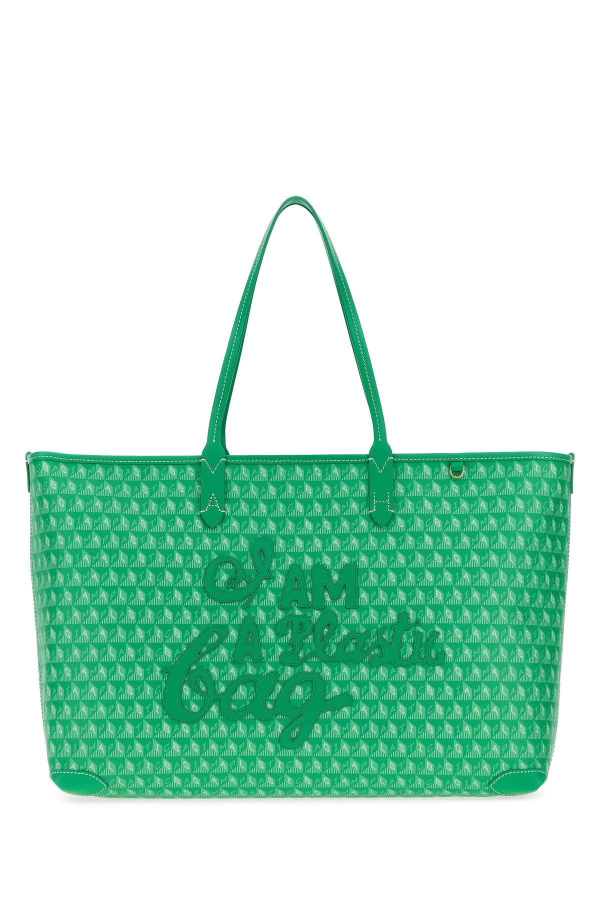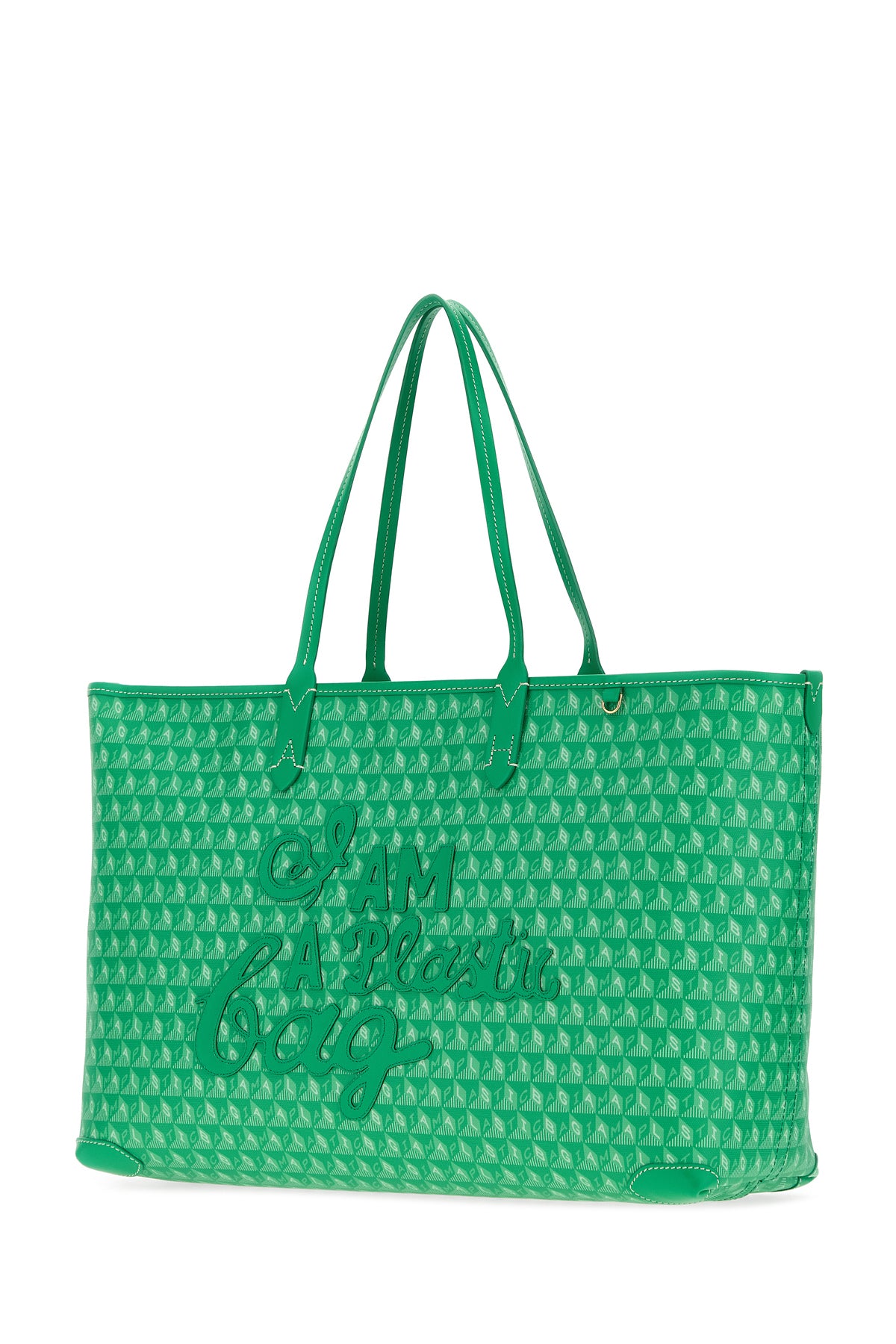 Shopping bag realized in coated canvas with leather trimmings enriched by I am a Plastic Bag patch at the front.