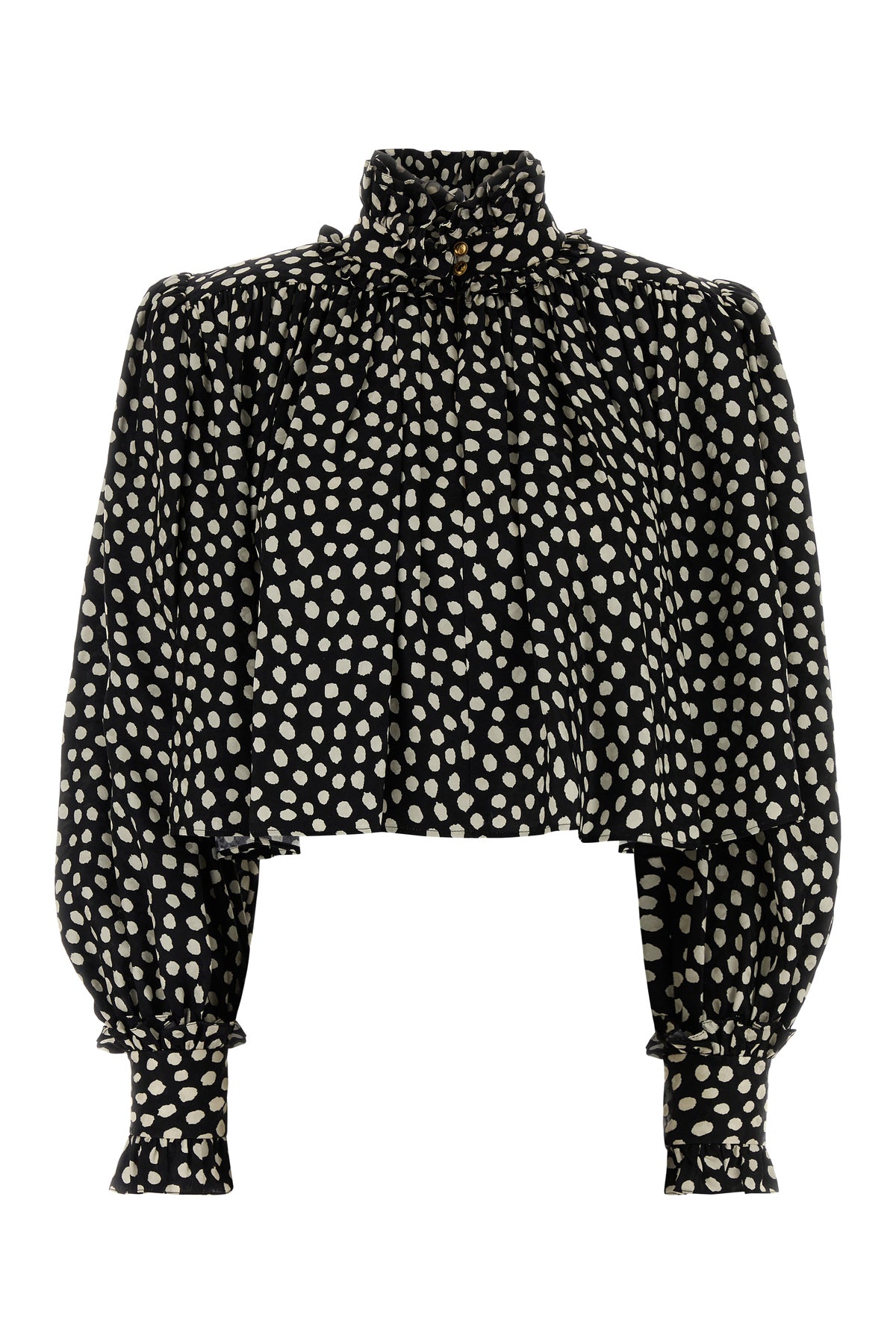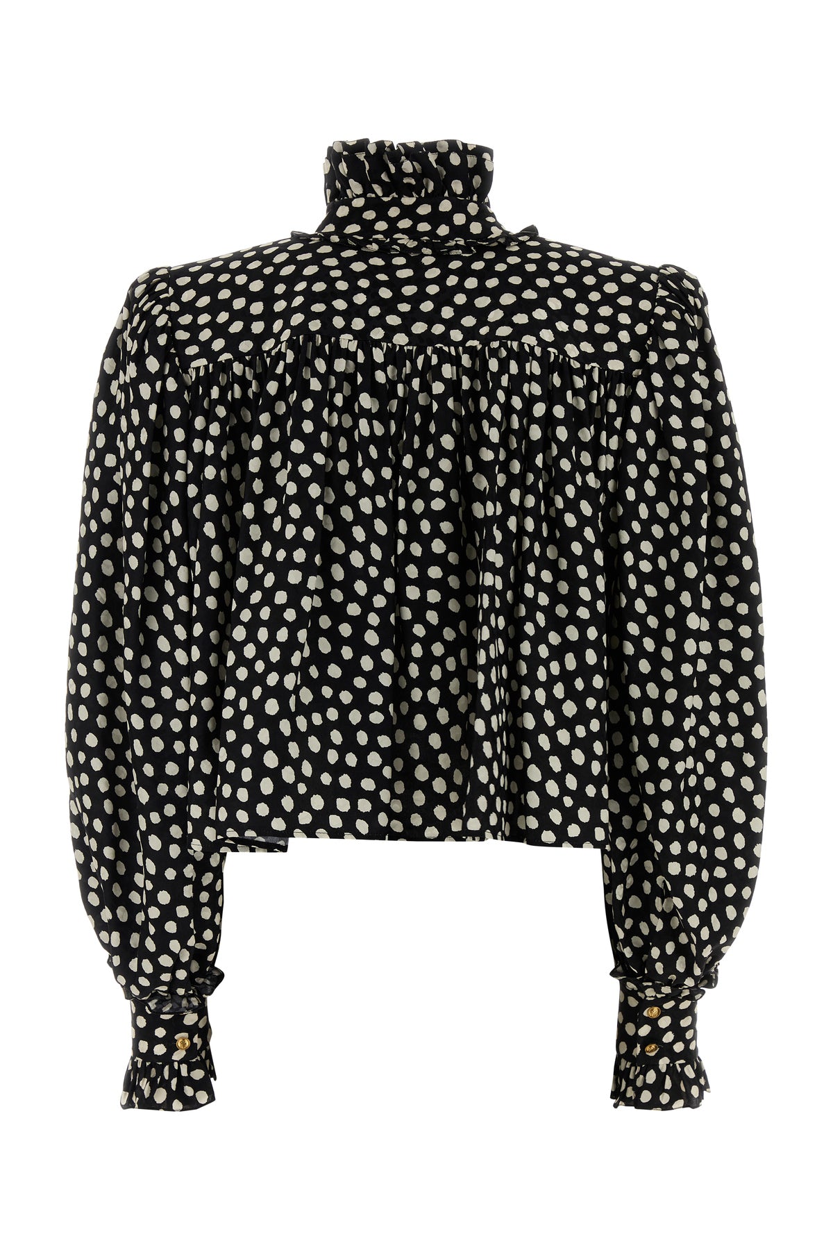Top realized in pure silk characterized by polka-dots print on the entire surface enriched by ruches at the neck and on the cuffs.