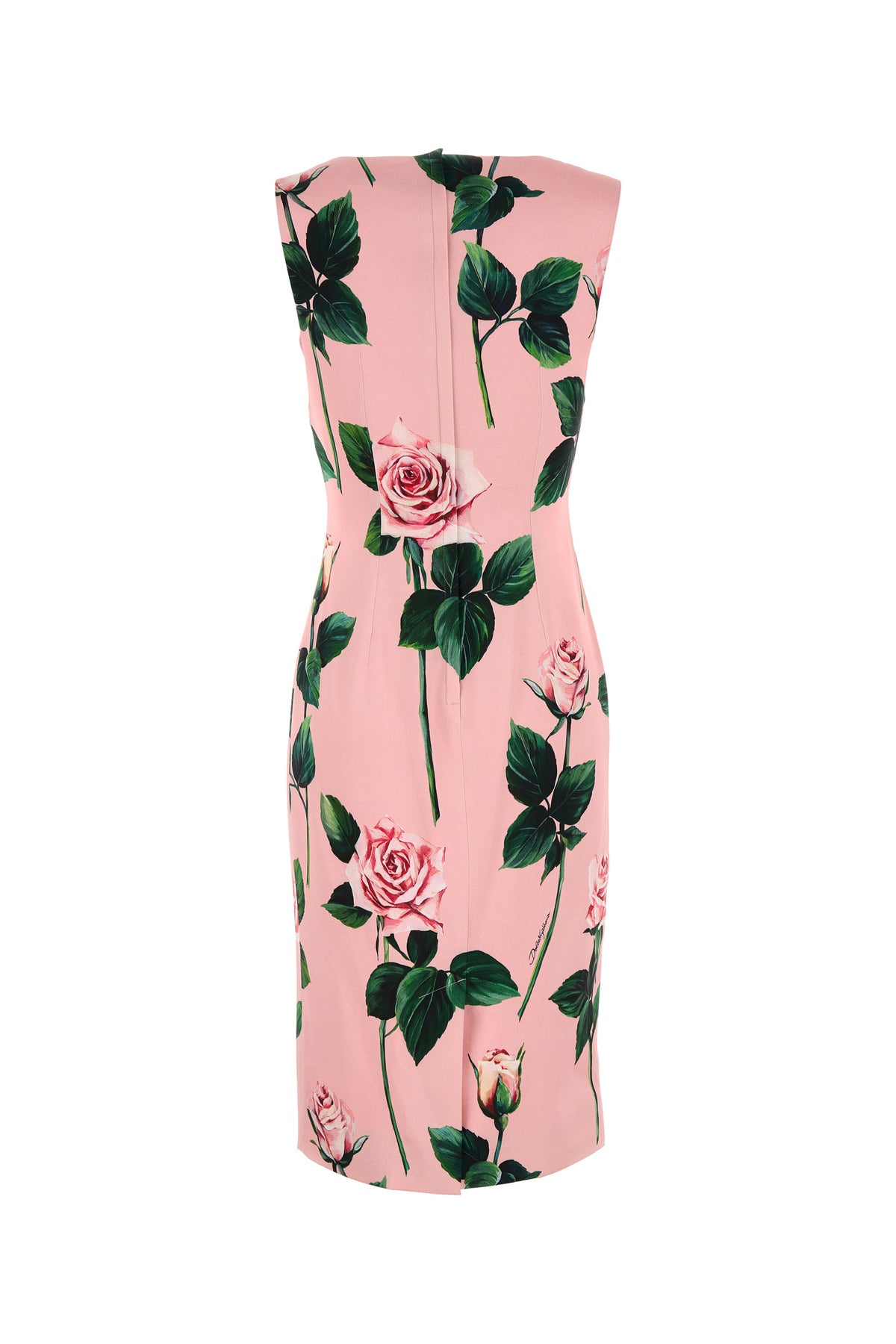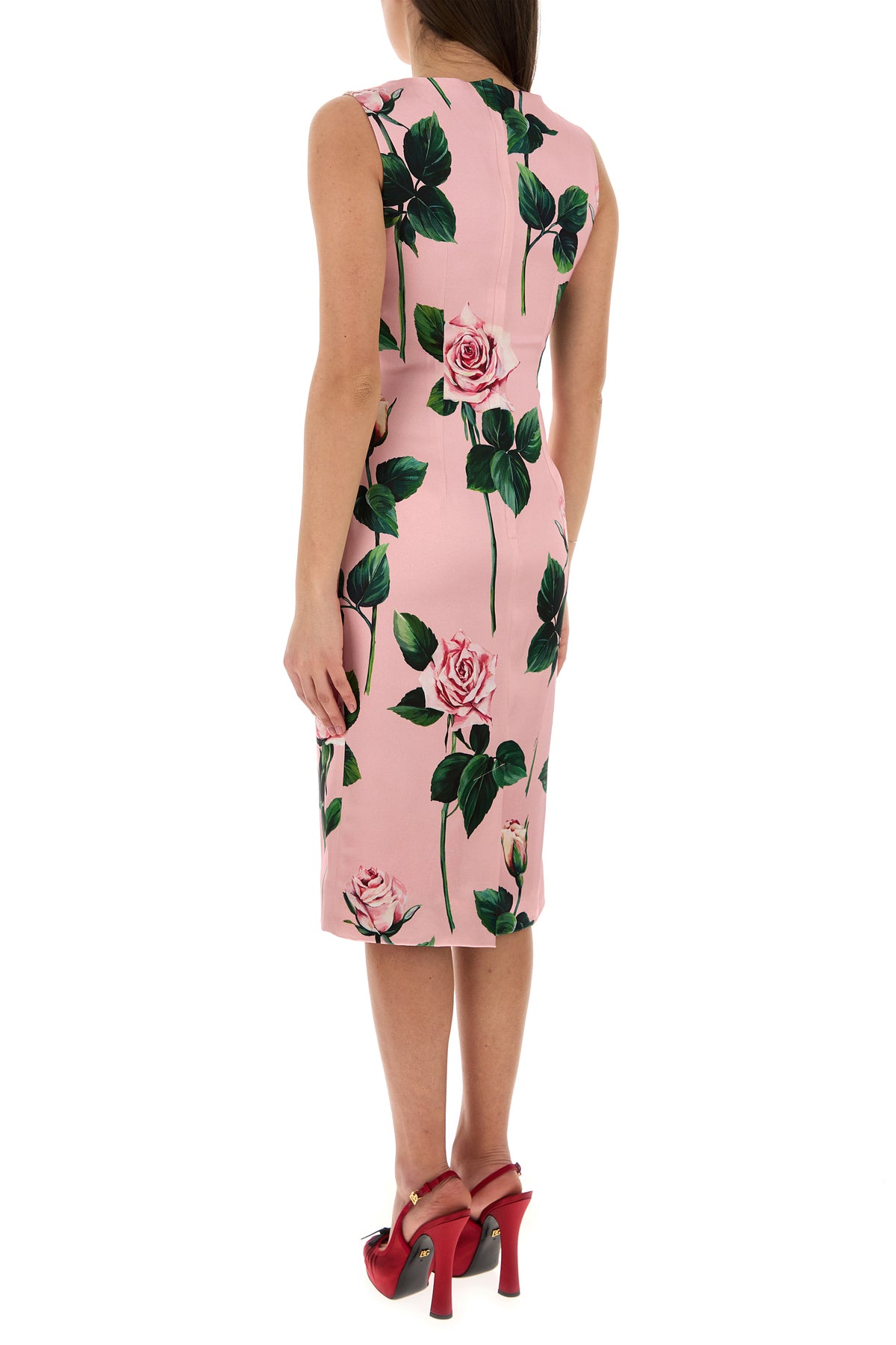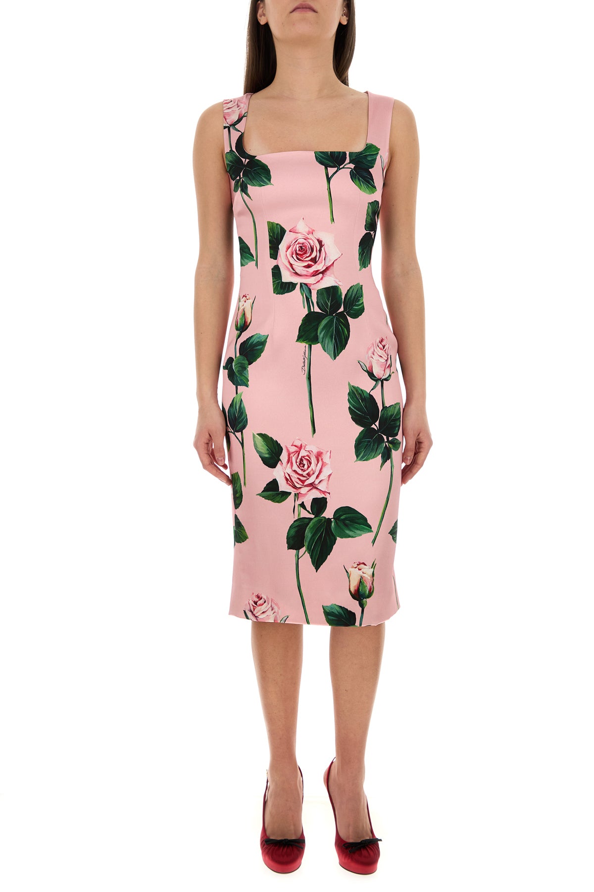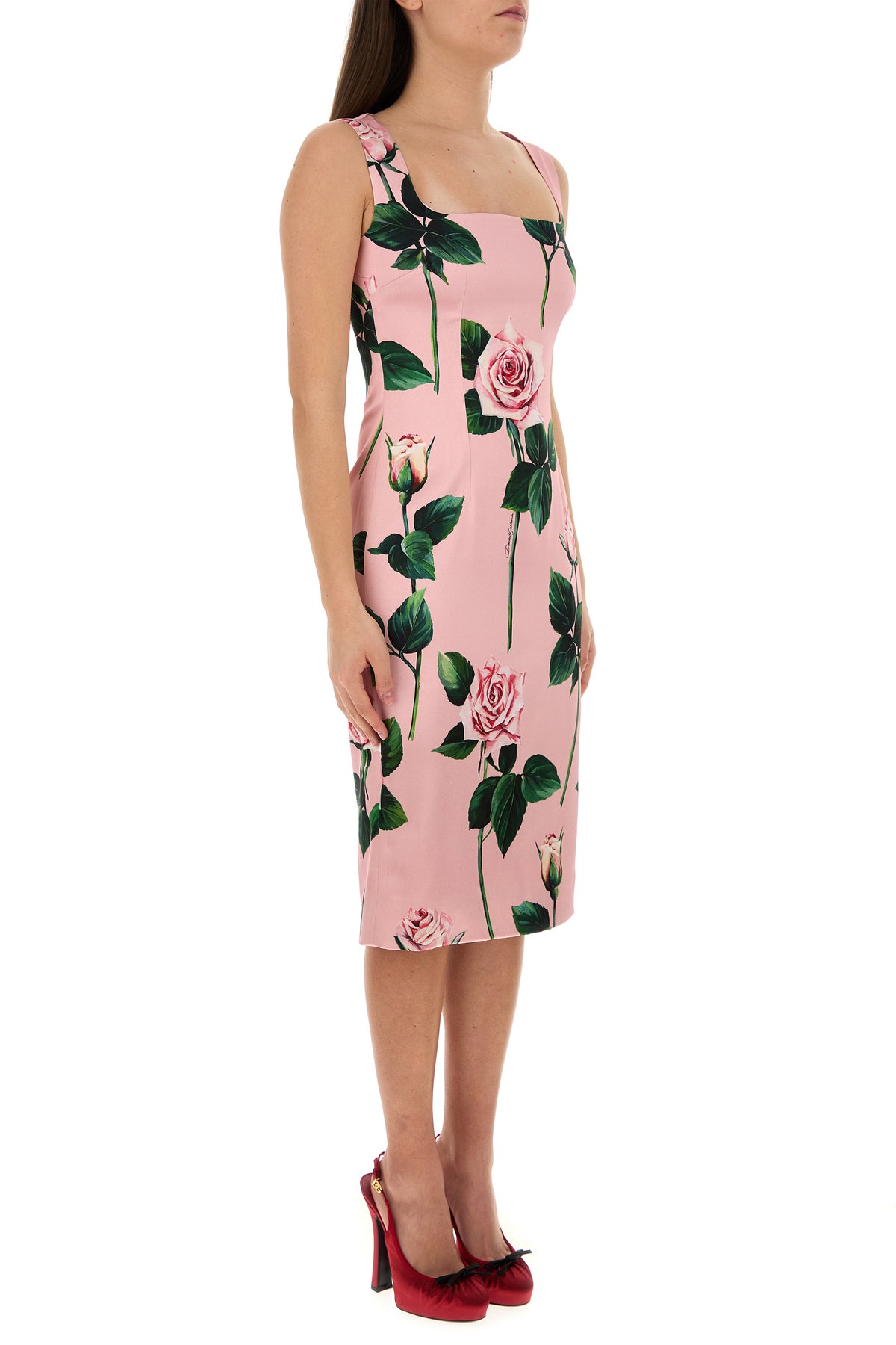 Fitted dress realized in stretch satin characterized by floral print on the entire surface.