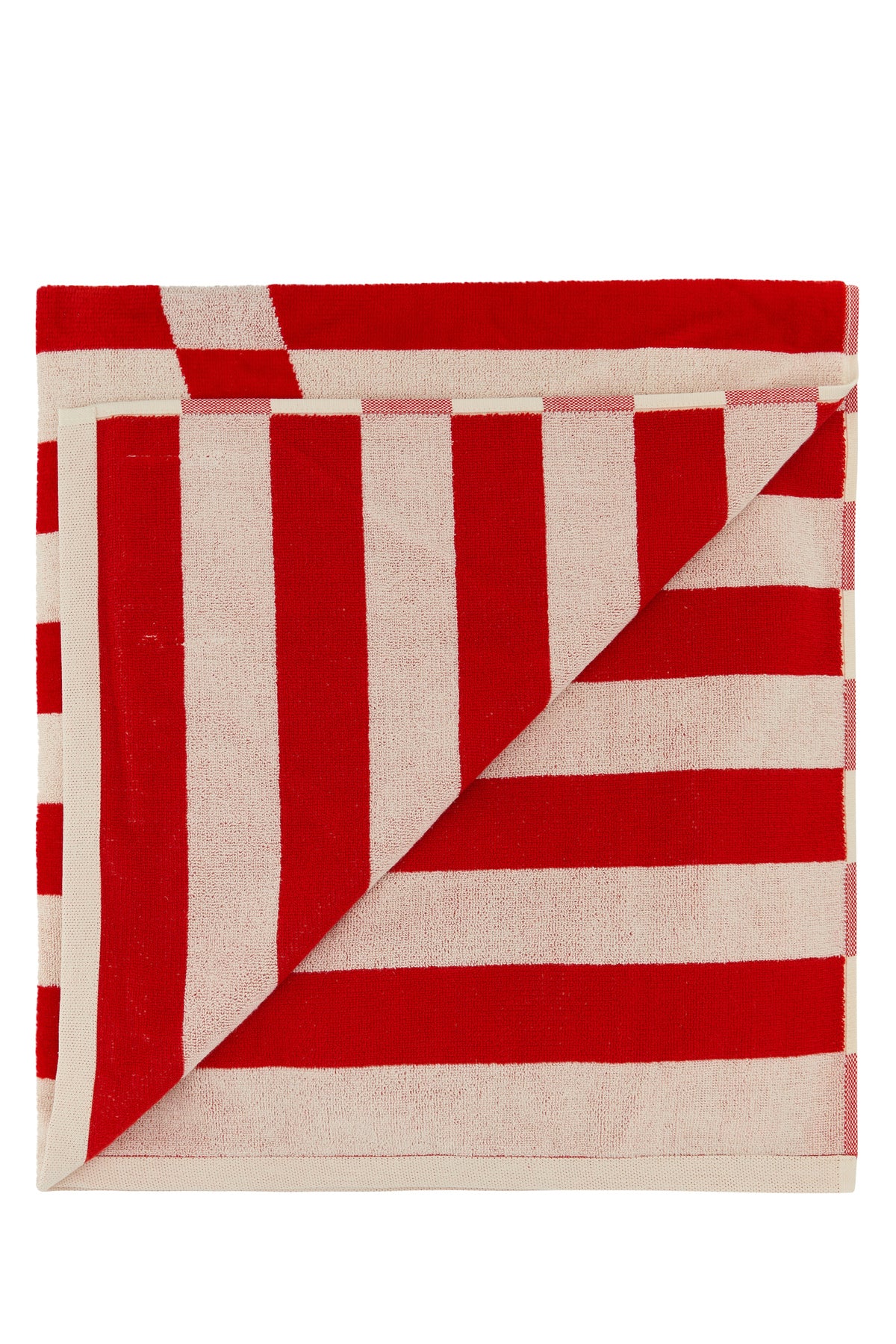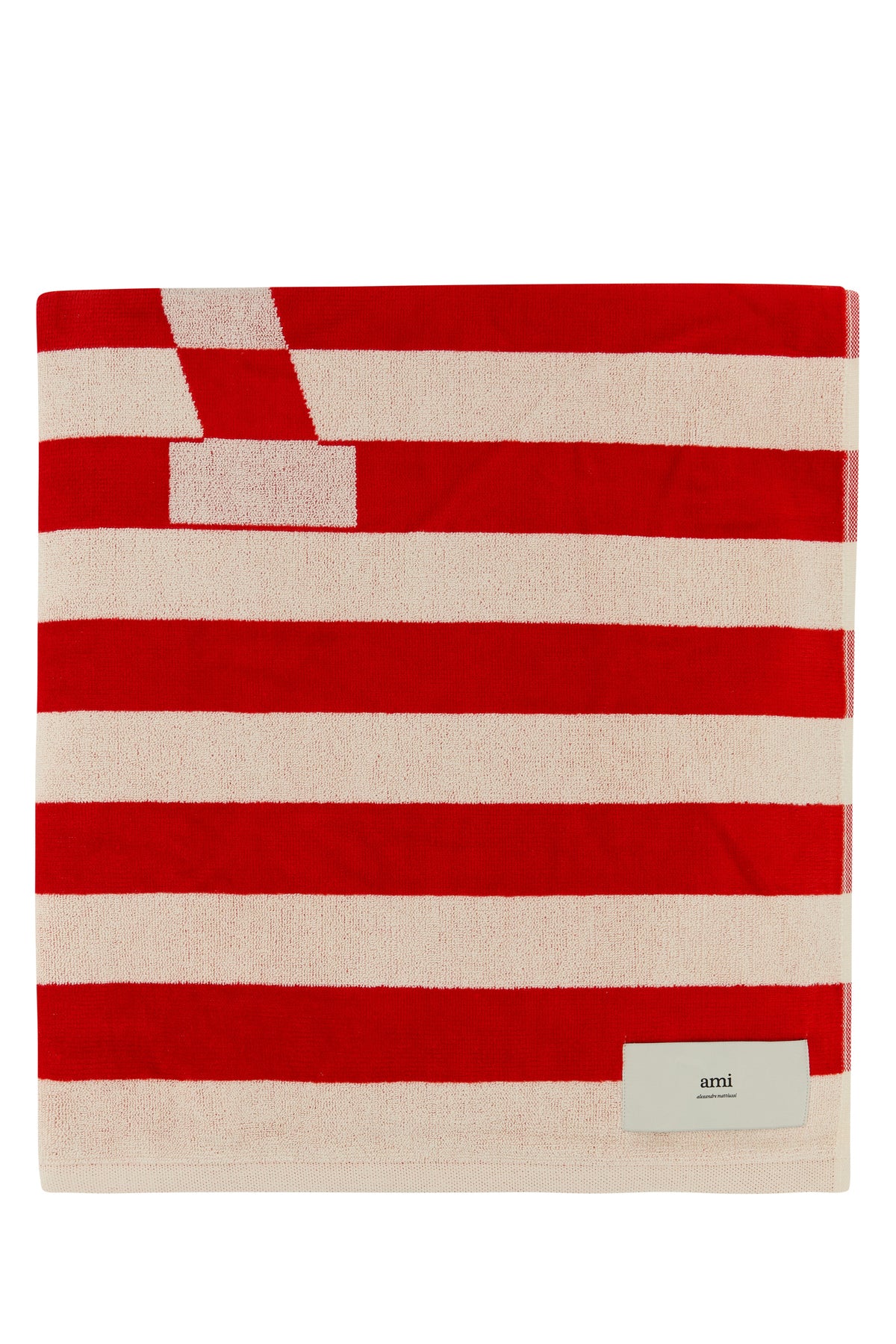 Beach towel realized in pure cotton terry fabric characterized by striped embroidery on the entire surface and iconic Ami De Coeur print.