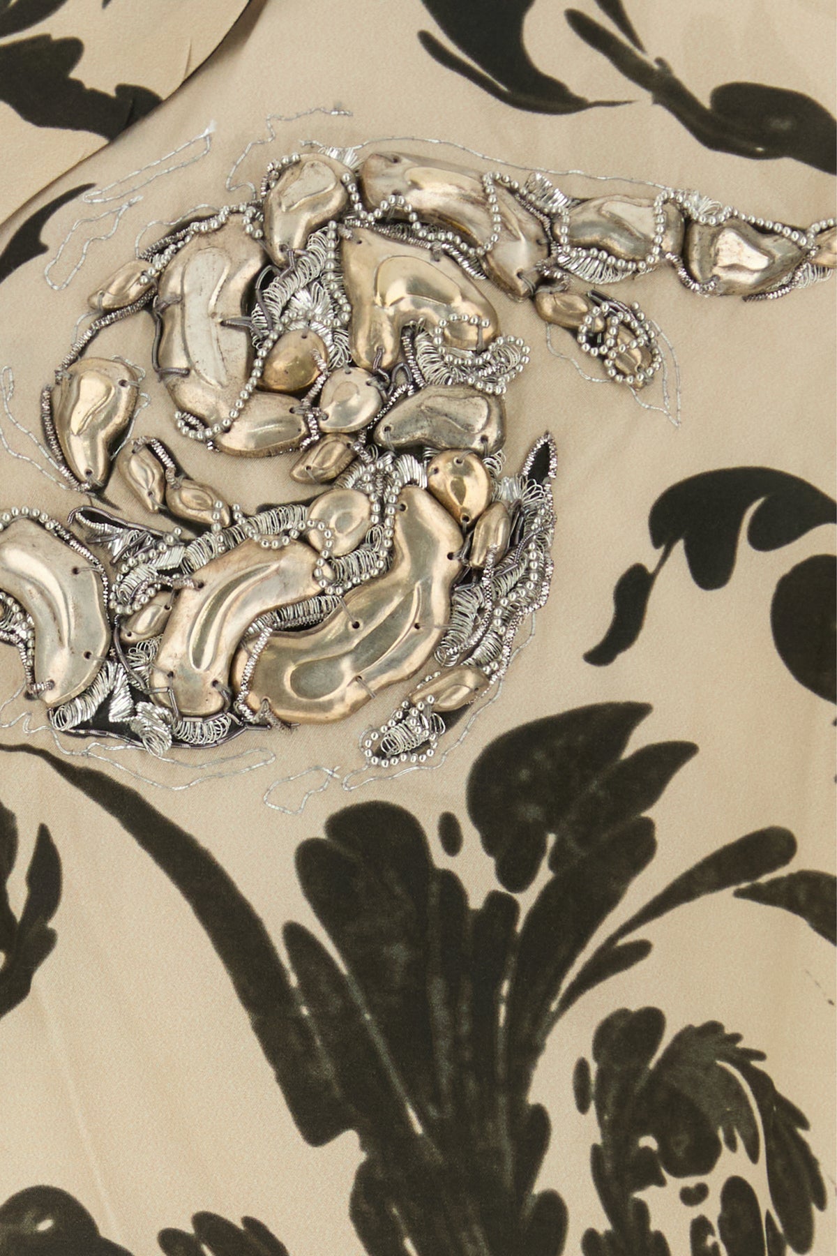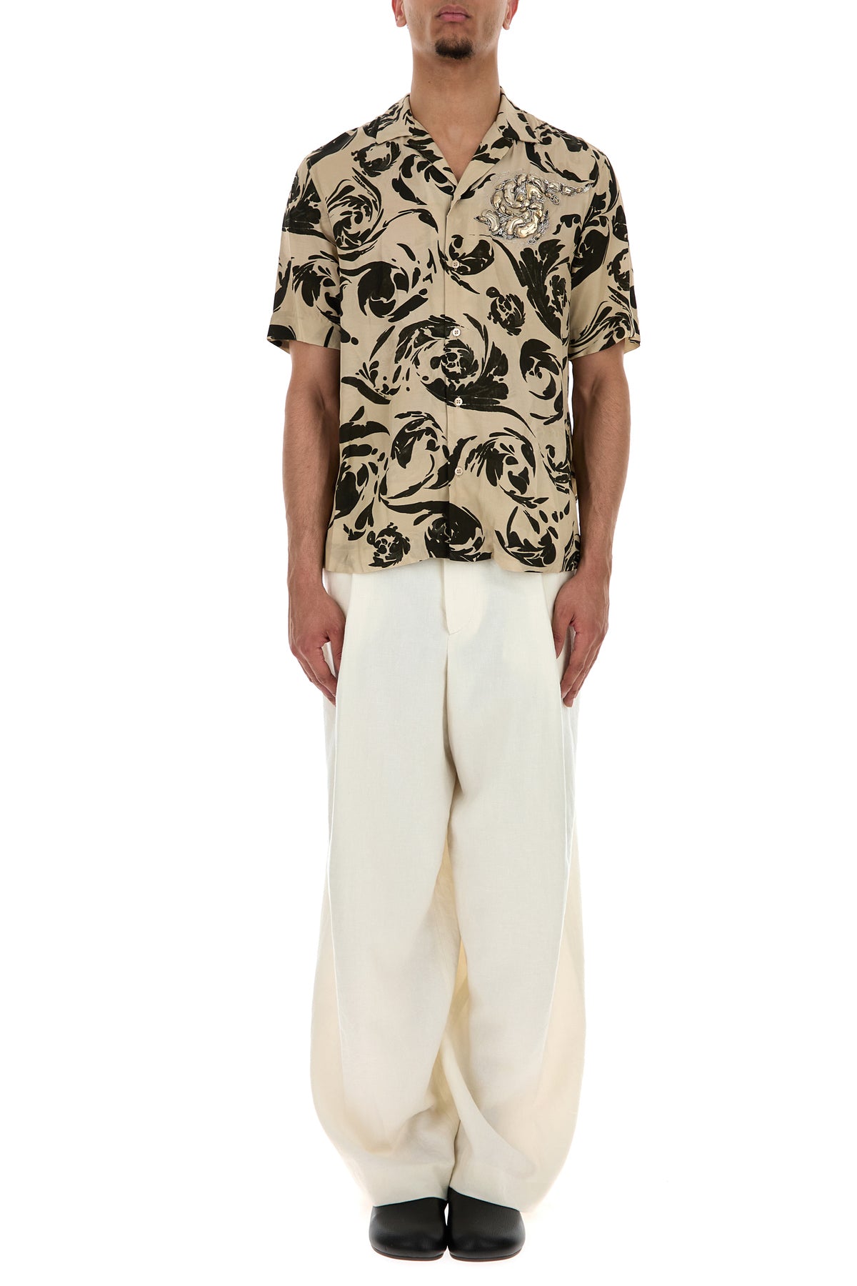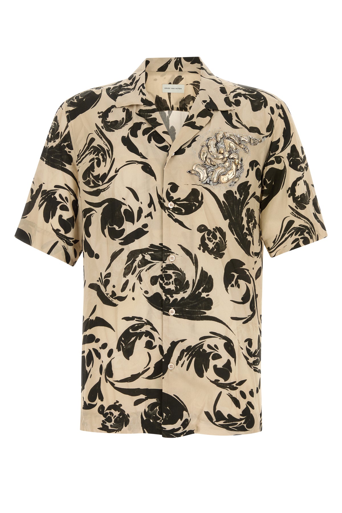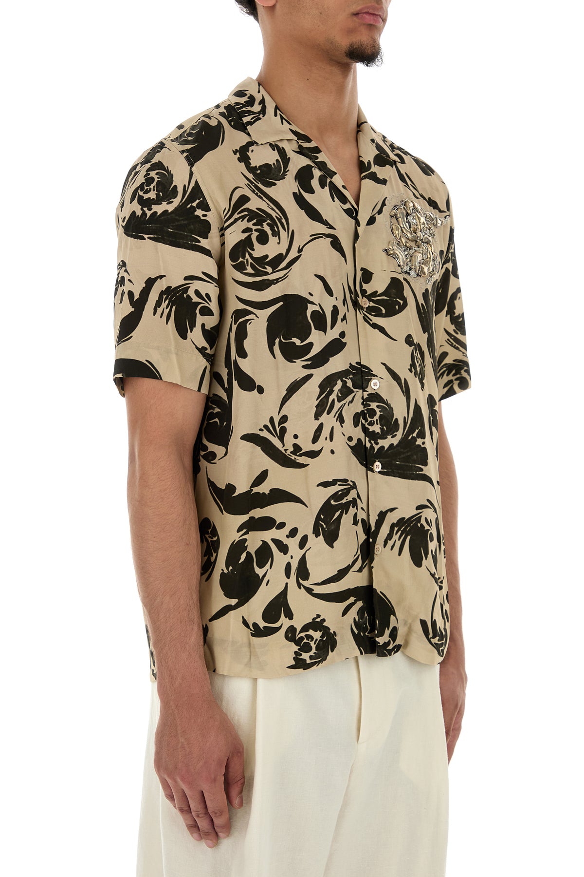 Short-sleeve shirt realized in viscose characterized by peculiar print on the entire surface enriched by peculiar embellishment on the chest.