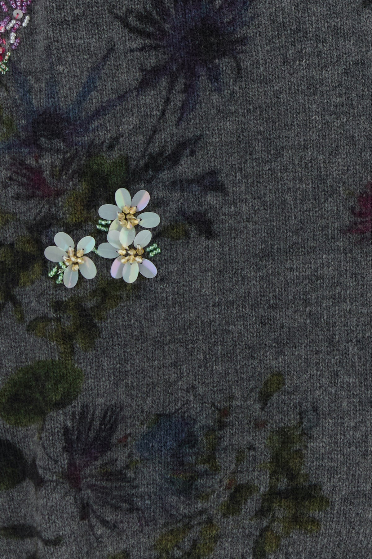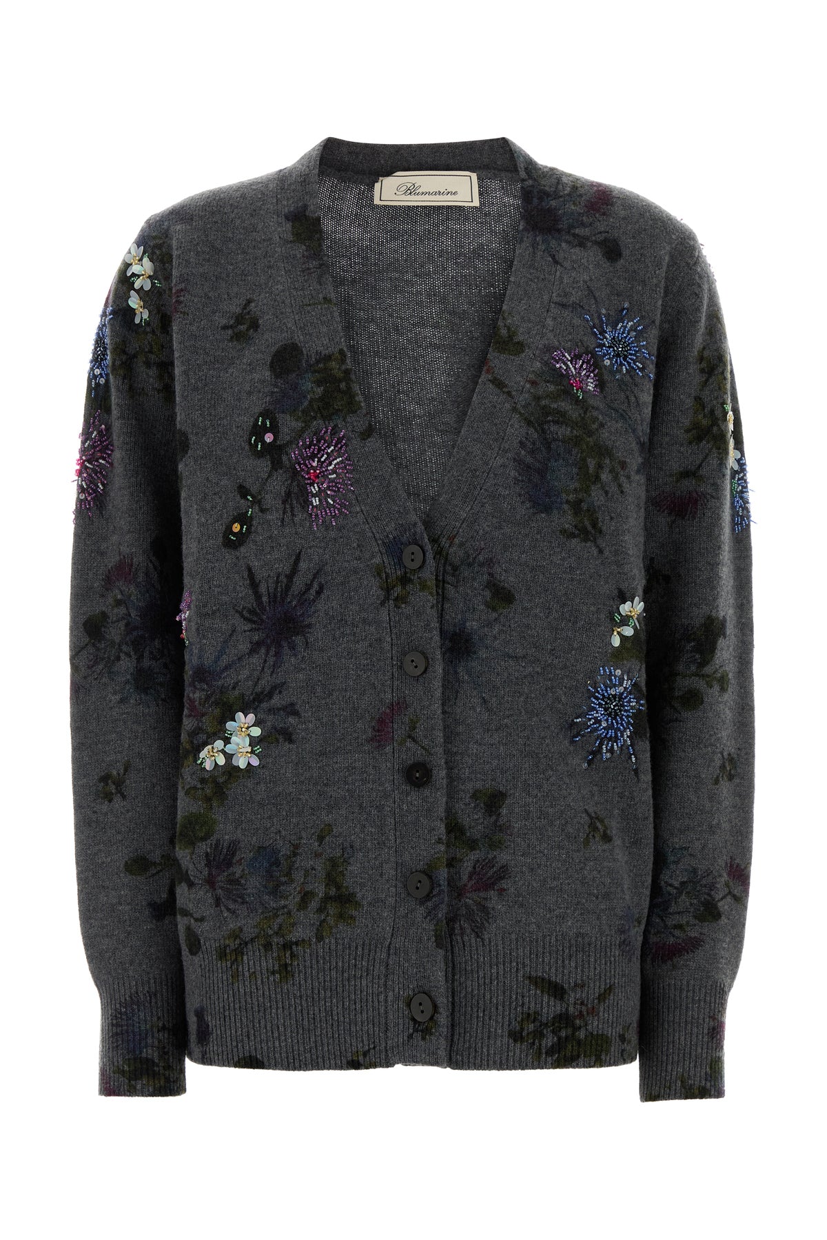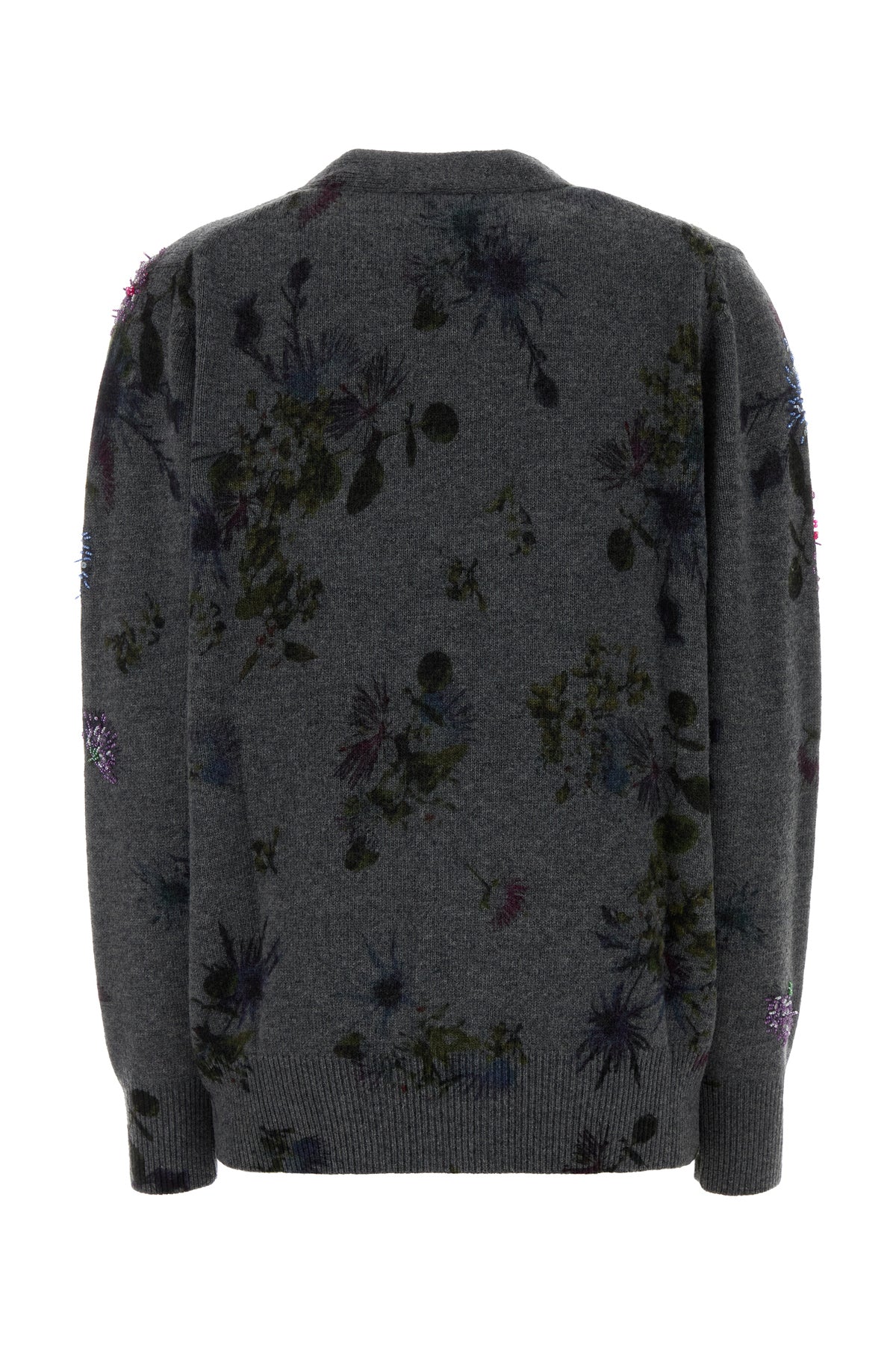 Oversize cardigan realized in wool and nylon characterized by floral print on the entire surface enriched by jewel embellishments at the front.