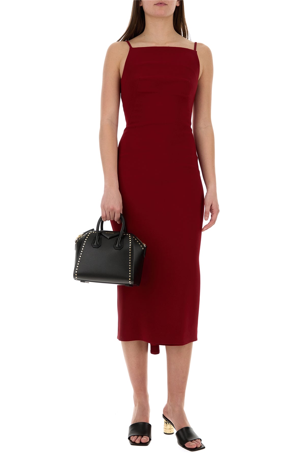 Midi-length dress realized in cady characterized by drape at the back.