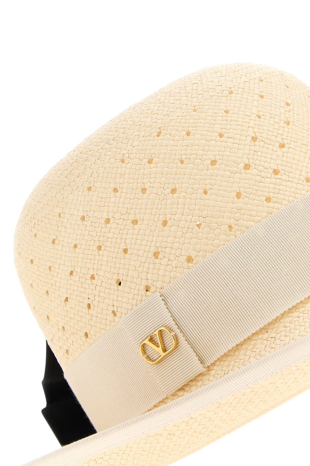 Hat realized in perforated straw enriched by fabric ribbon with metal VLogo detail and decorative bow on the sides.