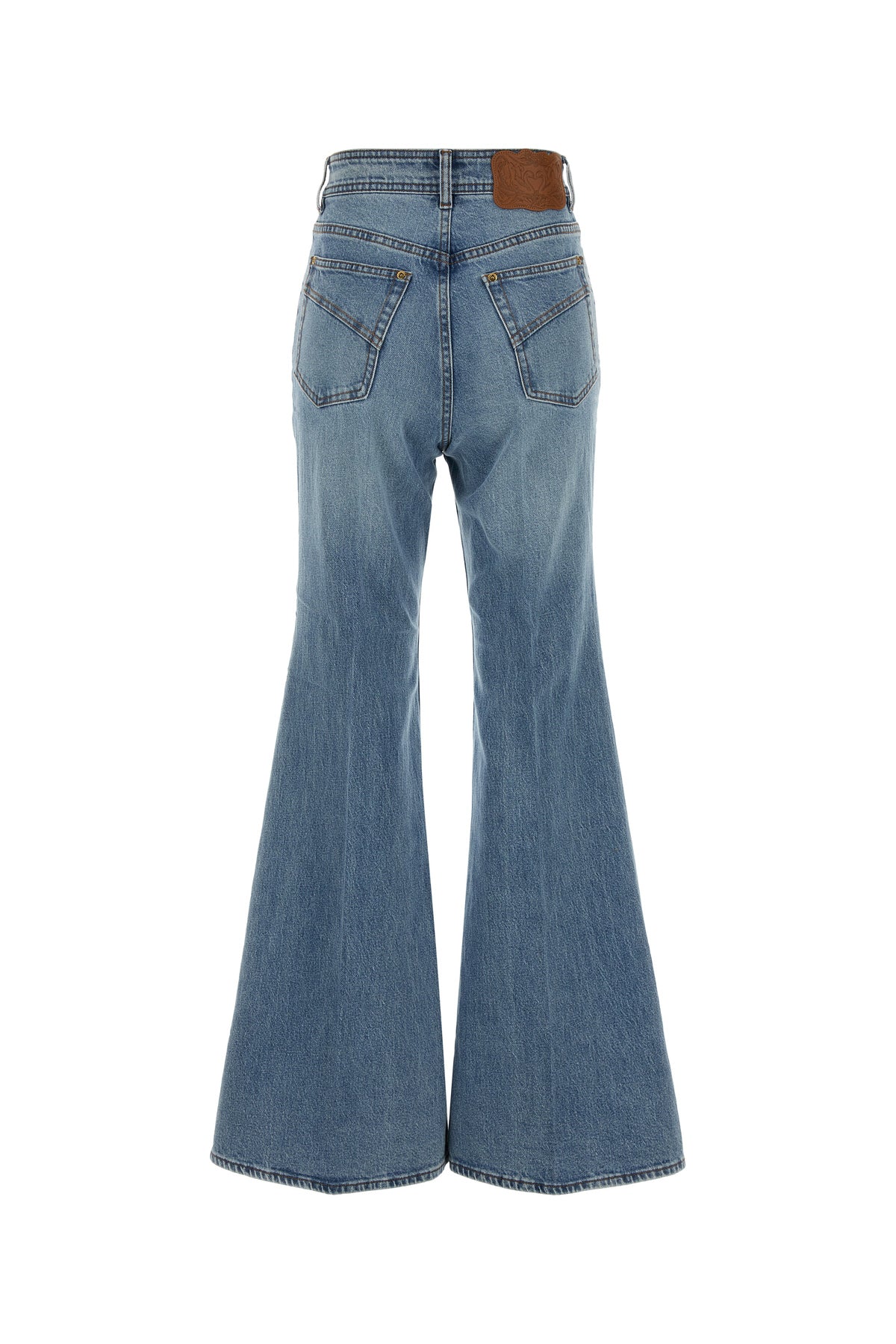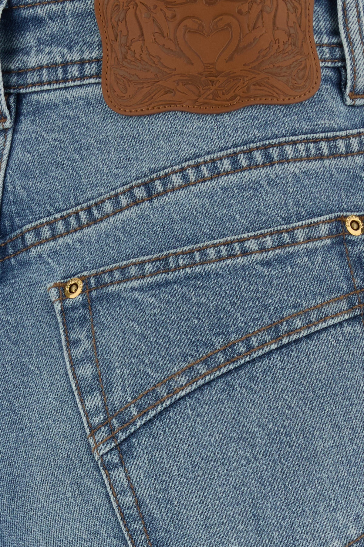 Flared leg jeans realized in stonewashed stretch cotton denim enriched by detachable metal detail at the front.