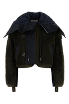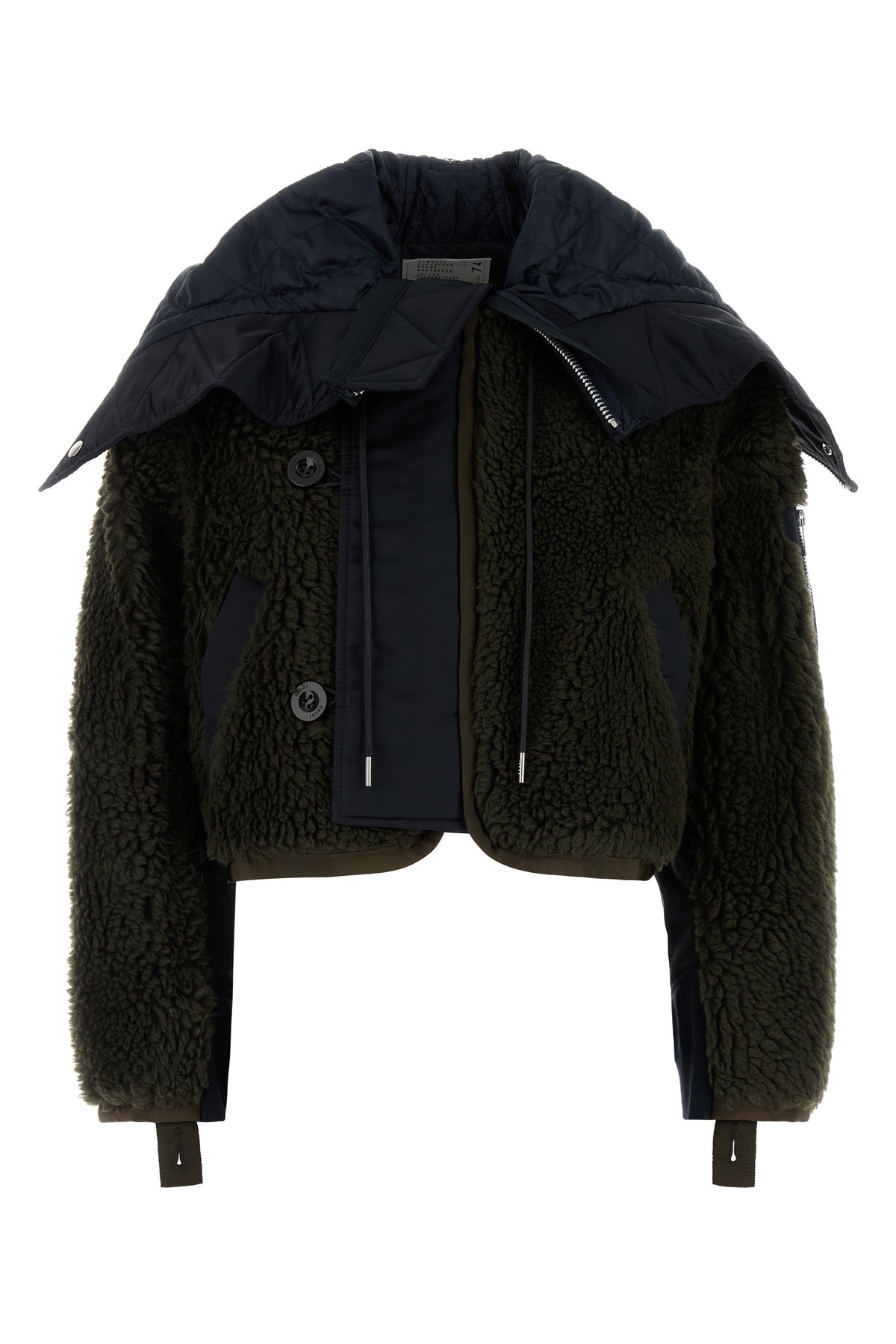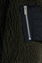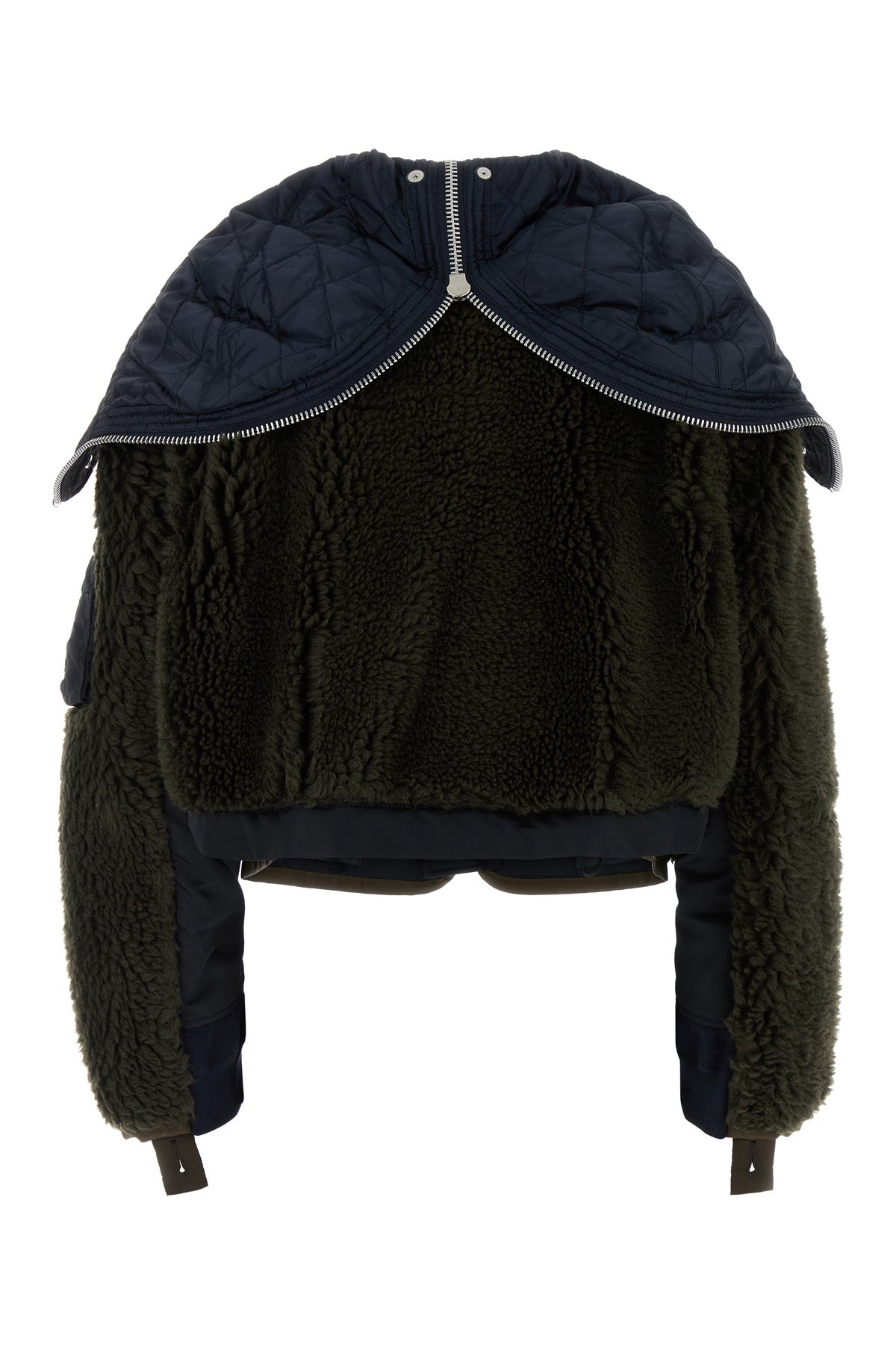 Bomber jacket realized in teddy and nylon characterized by concealed zip with visible buttons closure.
