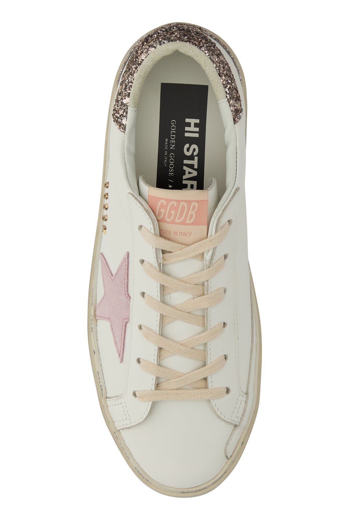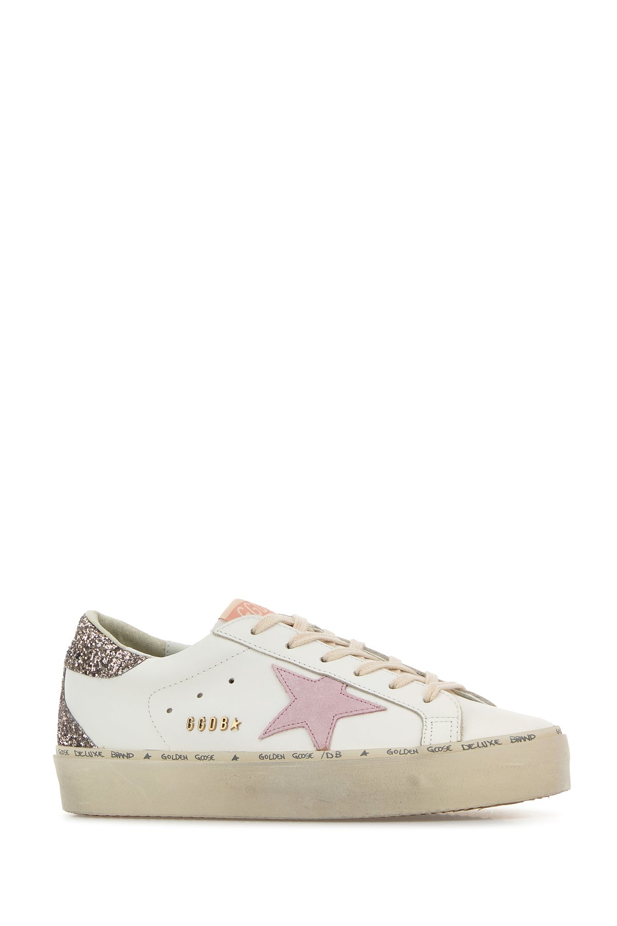 Sneakers realized in smooth leather characterized by embroidered logo on the glittered heel enriched by iconic contrasting Star patch and metal lettering logo on the side.