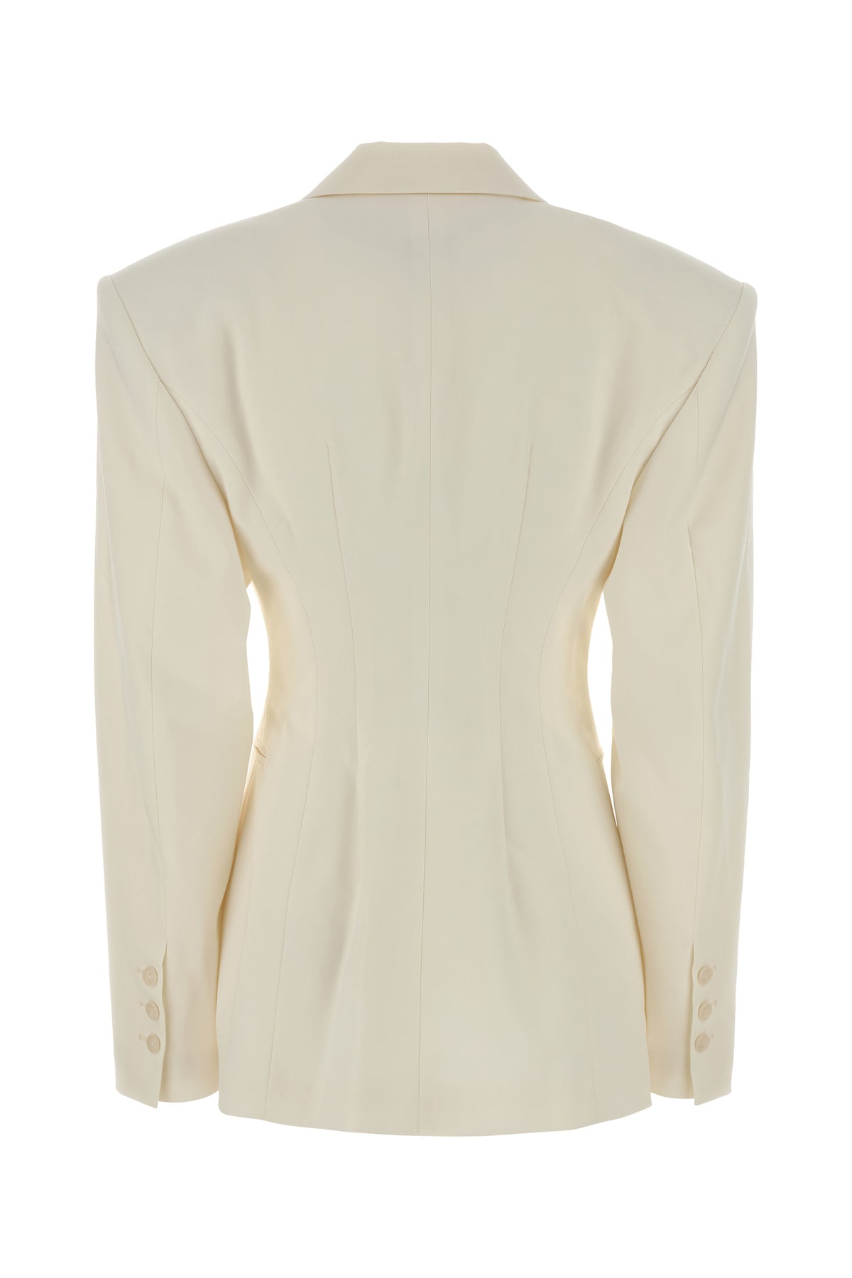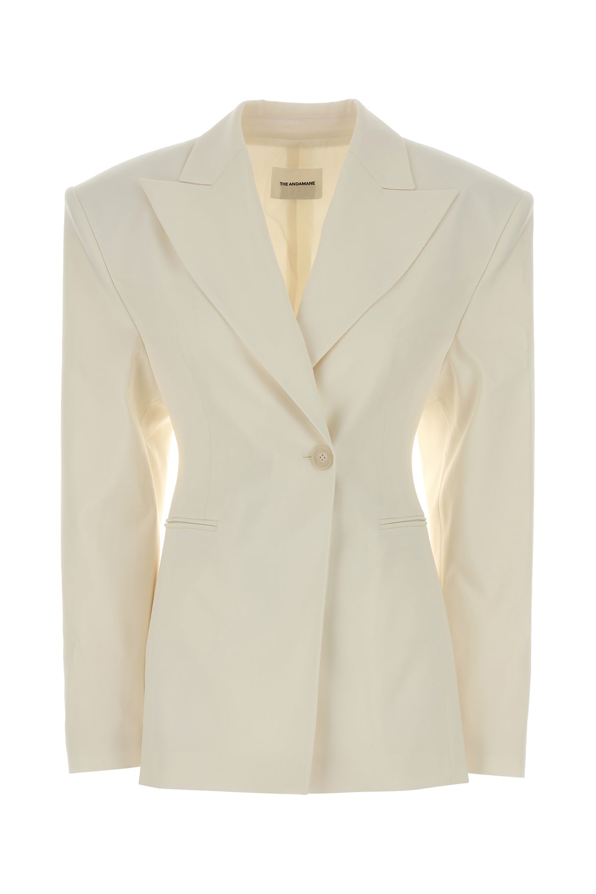 Blazer realized in stretch polyester blend characterized by peak lapels.