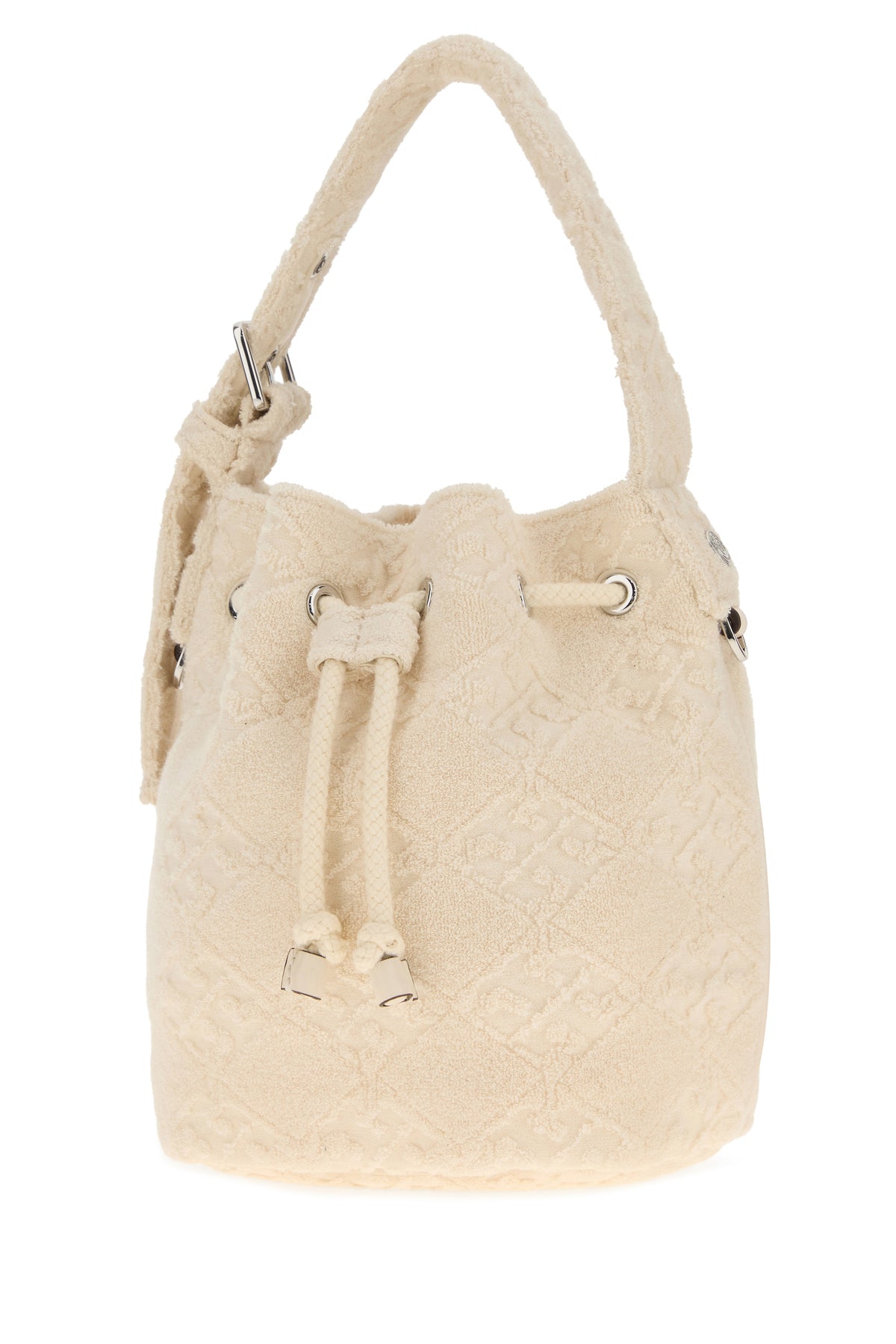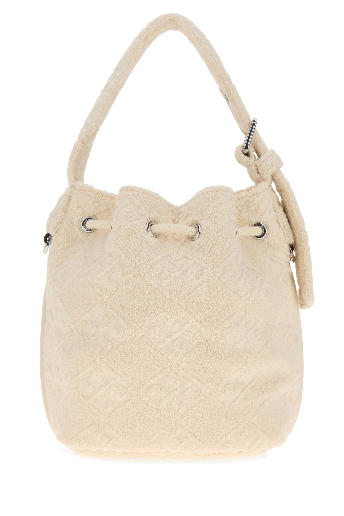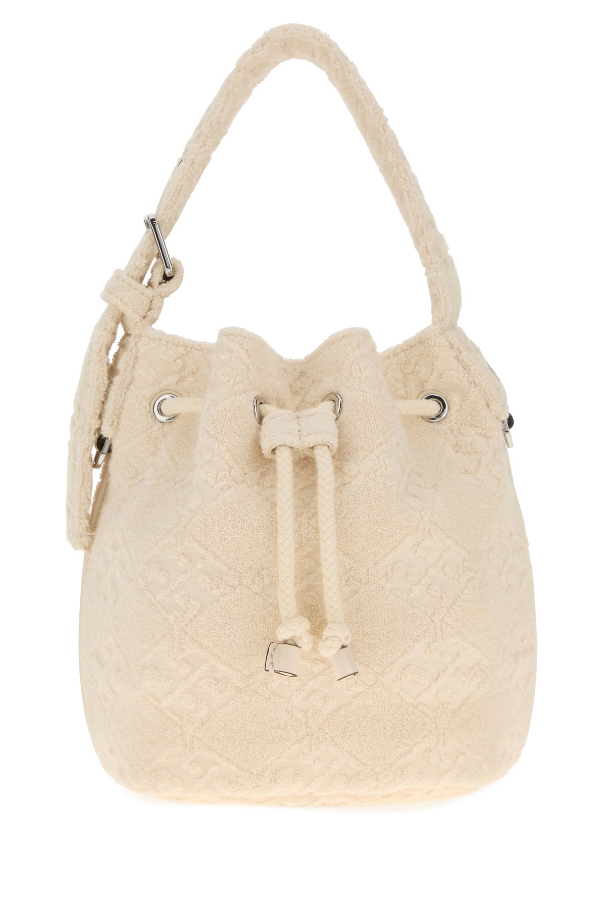 Bucket bag realized in terry fabric characterized by tonal logoed motif on the entire surface.