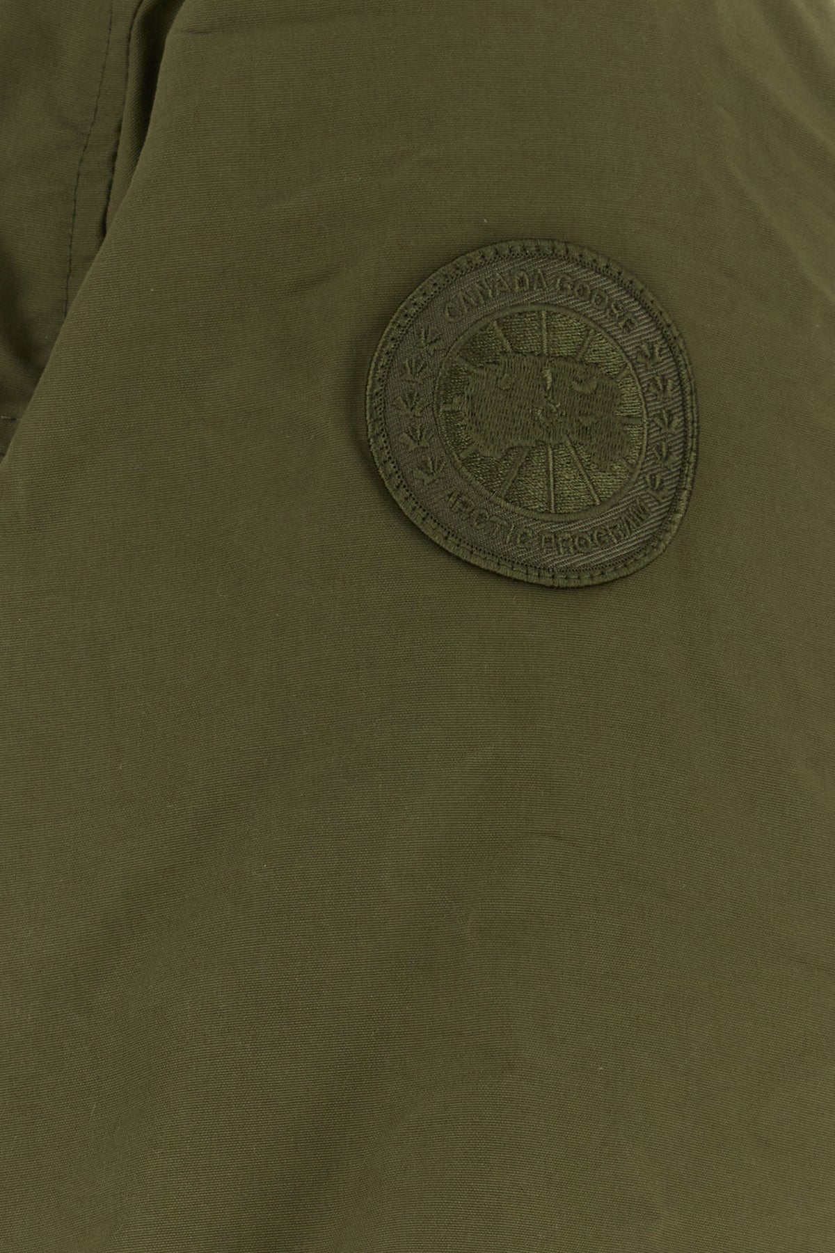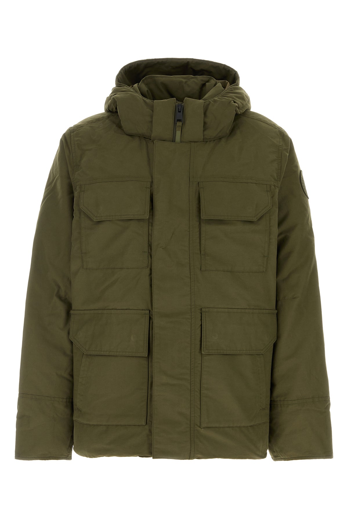 Down jacket realized in cotton blend enriched by tonal logoed patch on the sleeve.
