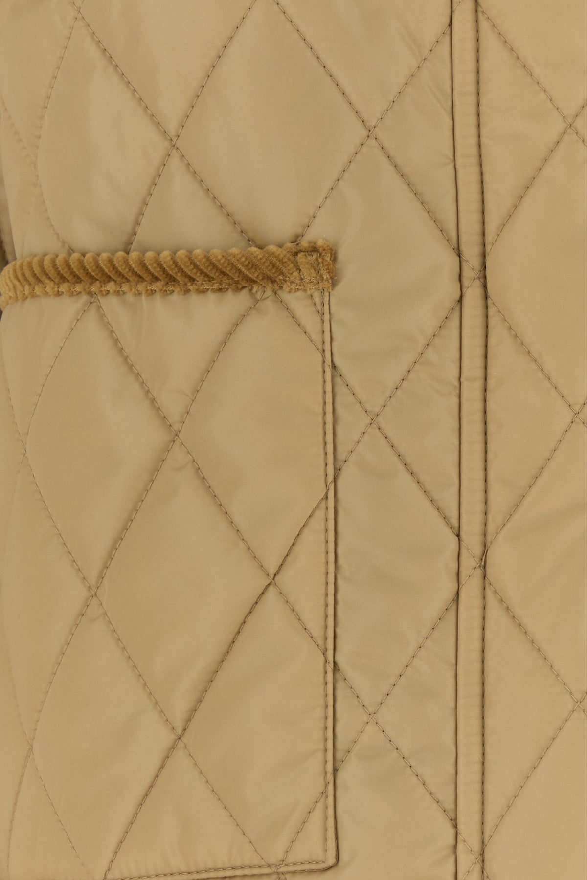 Jacket realized in quilted nylon characterized by corduroy collar.