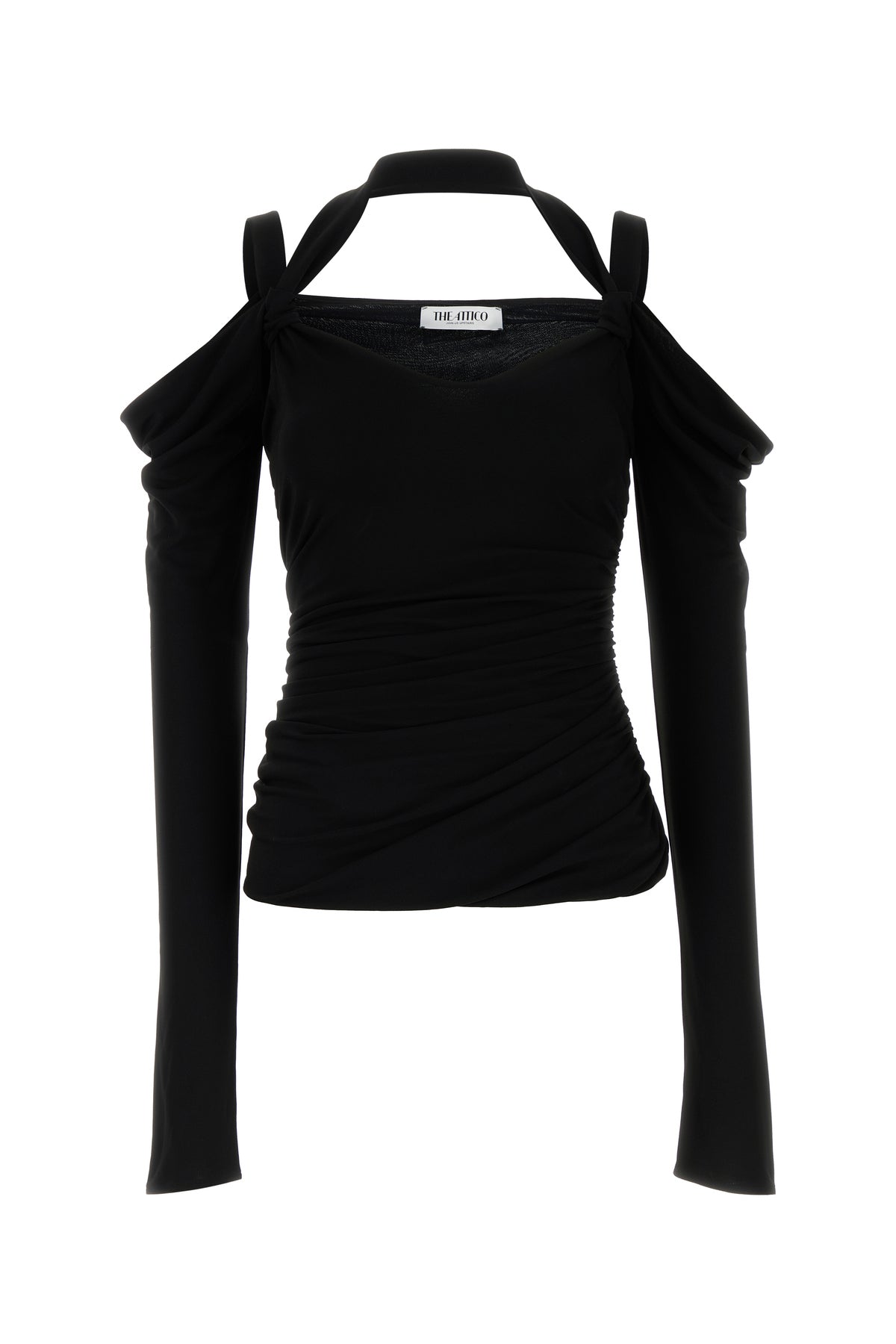 Draped top realized in crepe enriched by tonal logoed label at the back.