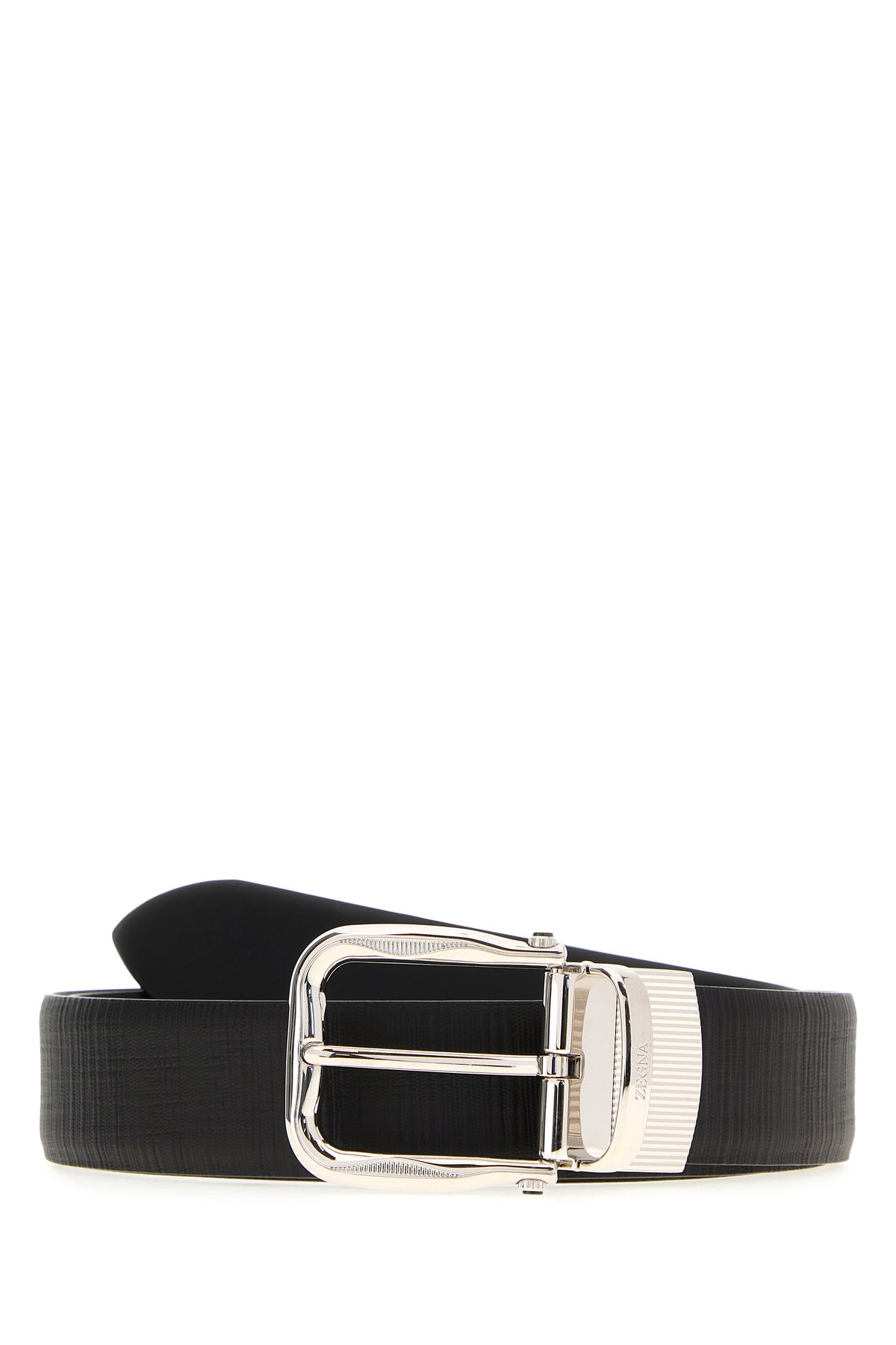 Reversible belt realized in leather characterized by embossed logo on the buckle.
