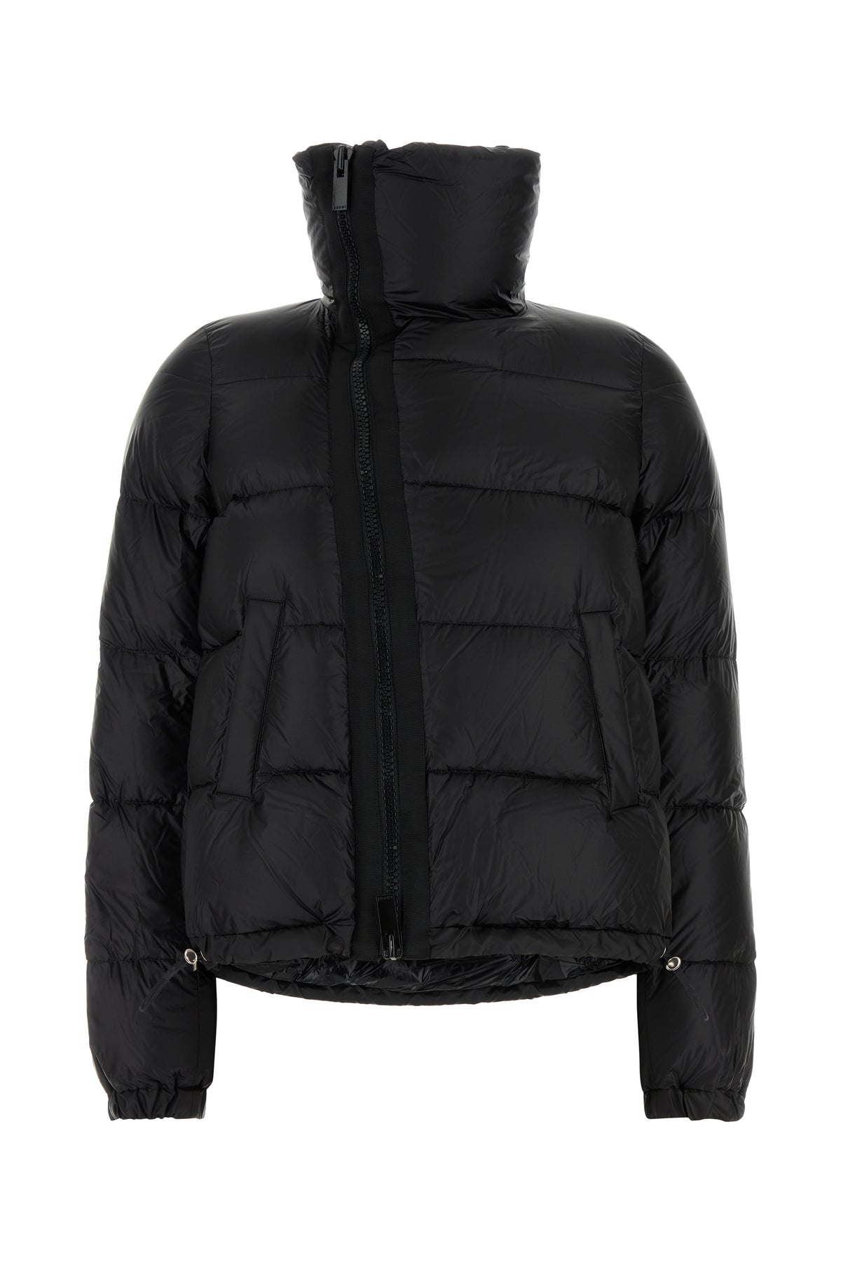 Down jacket realized in quilted nylon characterized by asymmetric closure by zip.