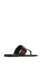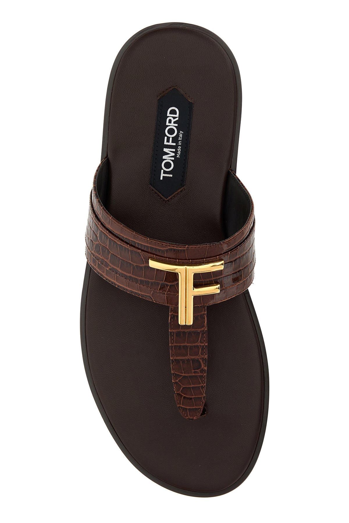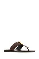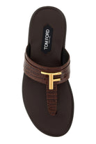 Thong slippers realized in crocodile motif embossed calf leather enriched by metal logoed detail on the band.