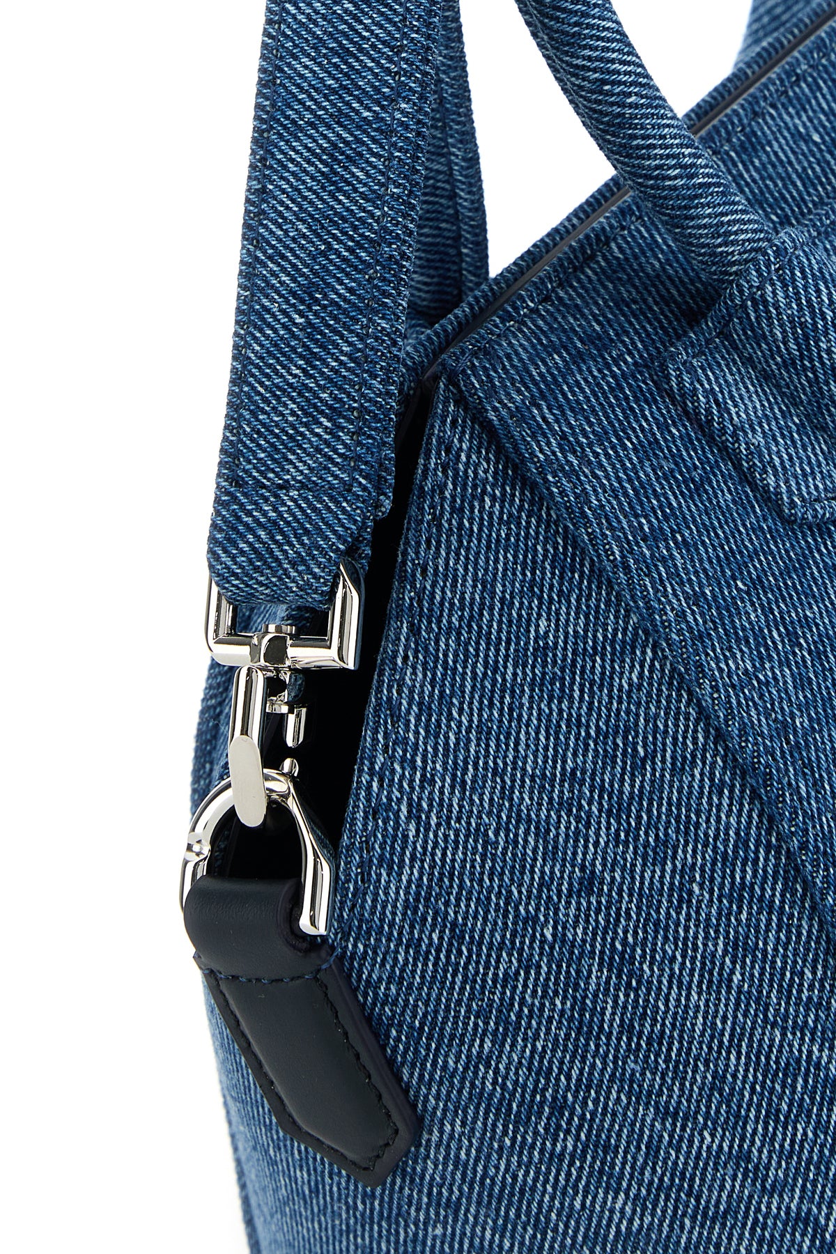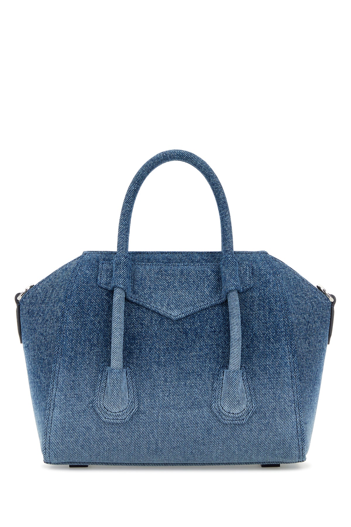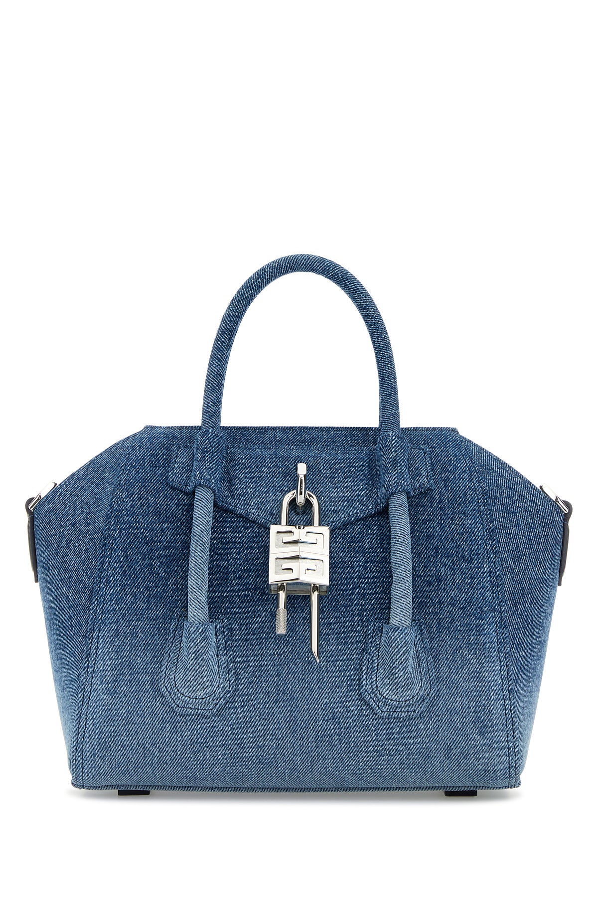 Handbag realized in shaded effect pure cotton denim characterized by peculiar embroideries on the entire surface enriched by metal Lock detail at the front.