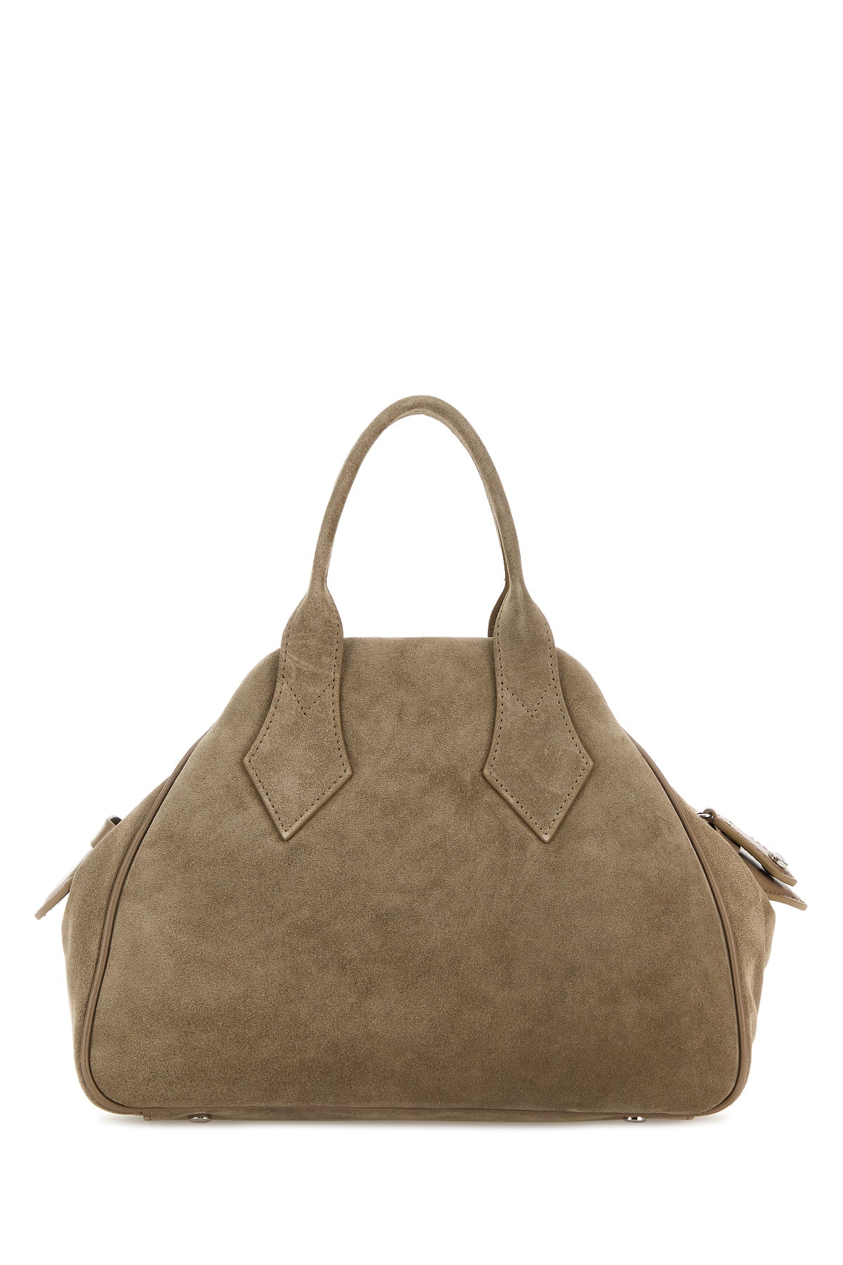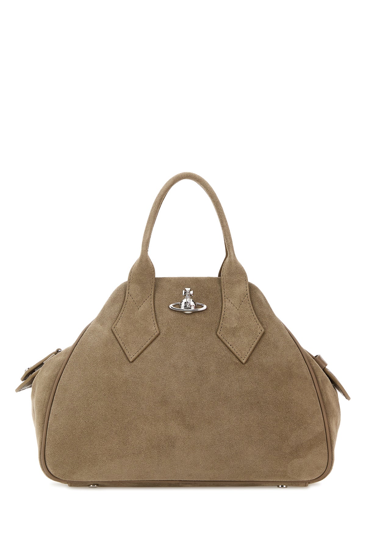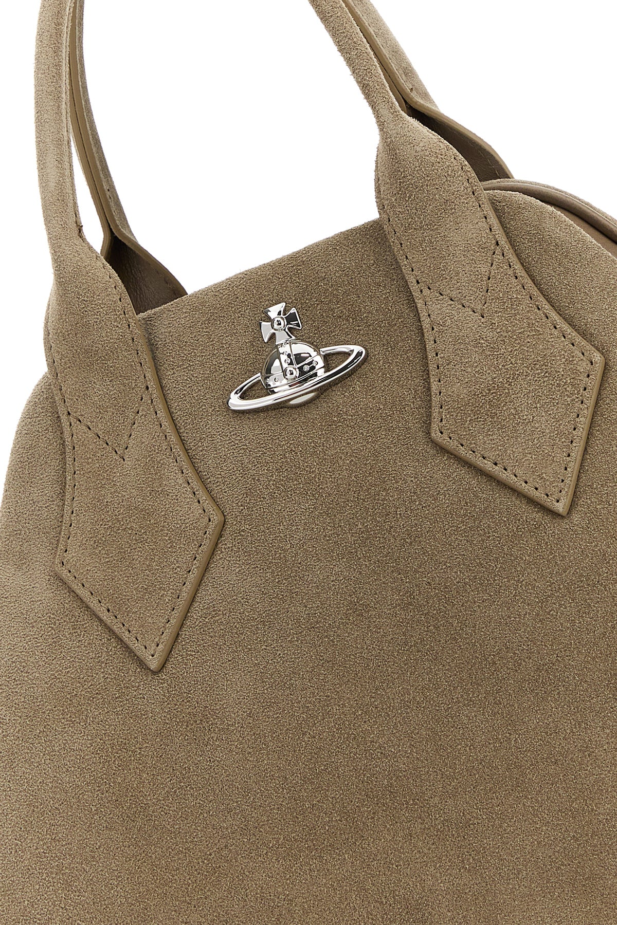 Handbag realized in calf suede enriched by metal Orb detail at the front.