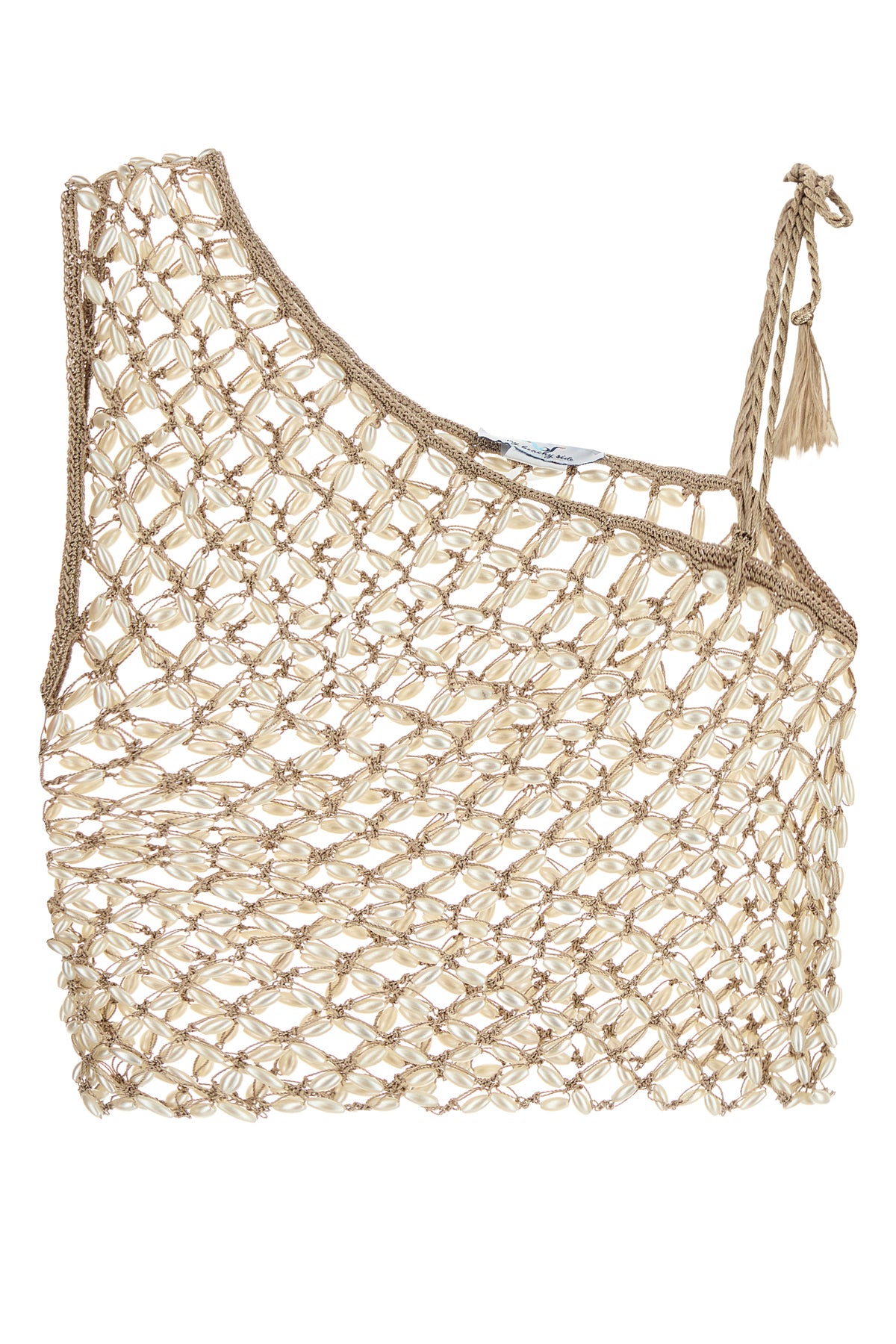 One-shoulder top realized in crochet enriched by pearls embellishment on the entire surface.
