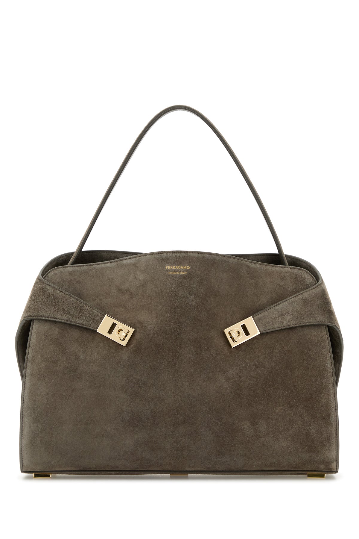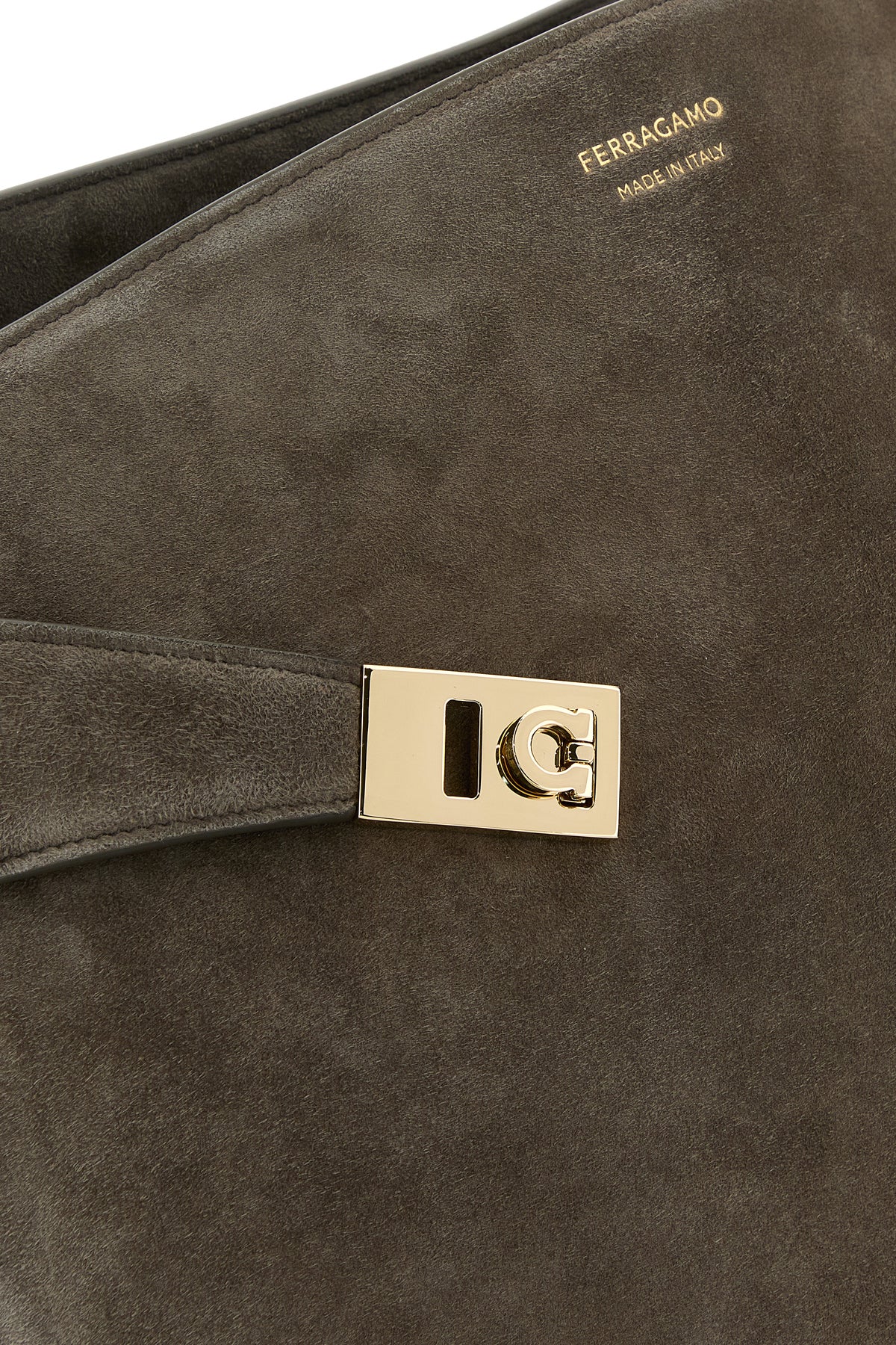 Handbag realized in calf suede characterized by laminated printed logo at the front enriched by tonal leather straps with metal Gancini details at the front.