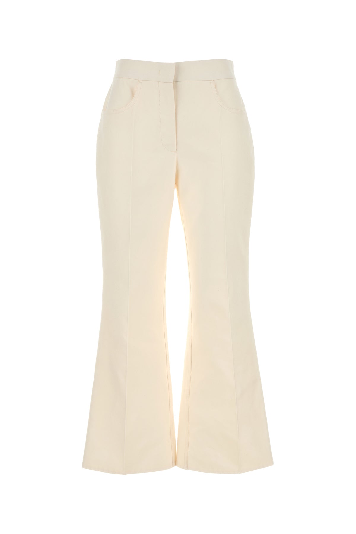 Flared pant realized in pure cotton characterized by central ironed pleats.