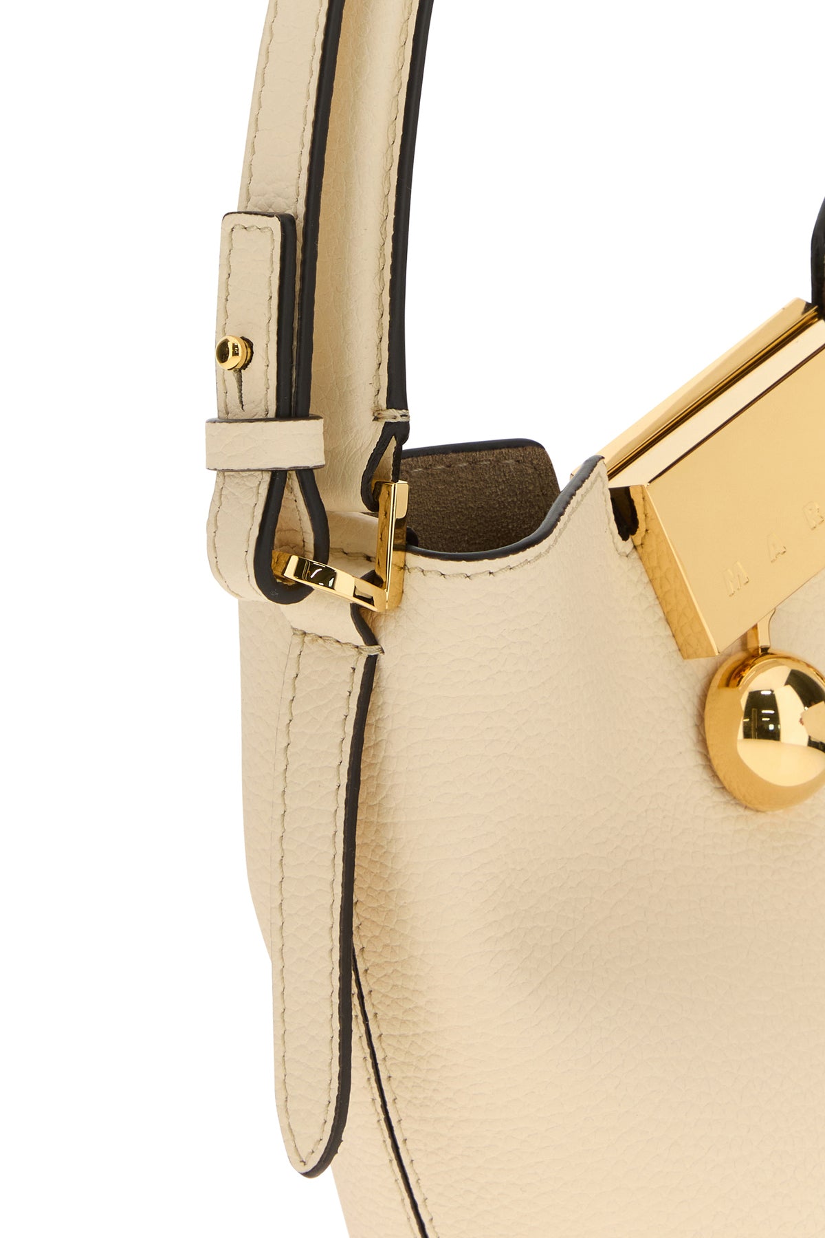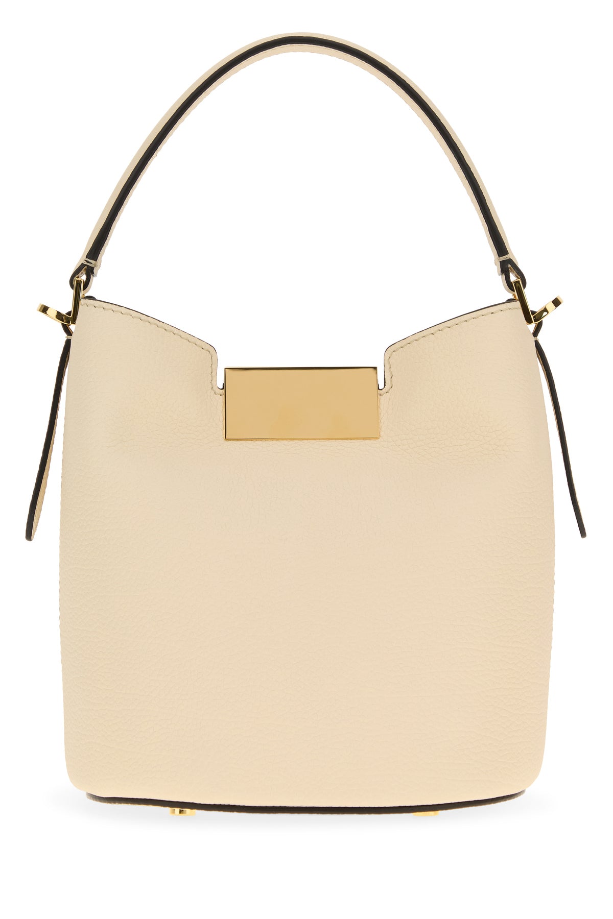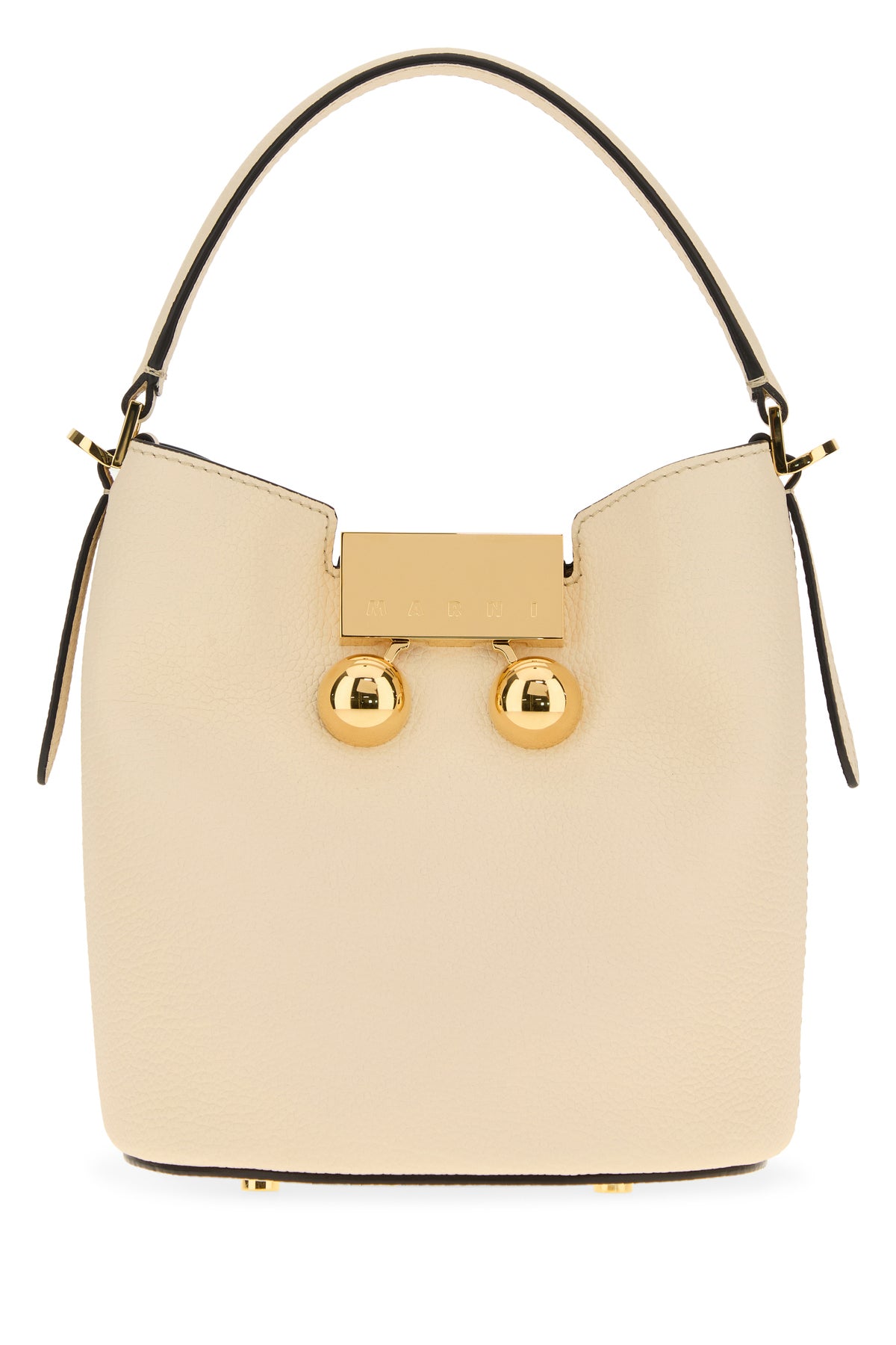 Handbag realized in pebble bovine leather characterized by embossed logo on the snap-fit closure.