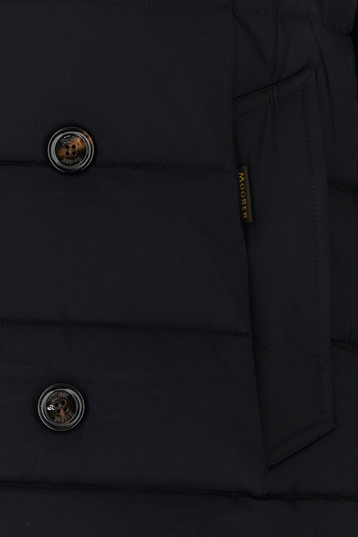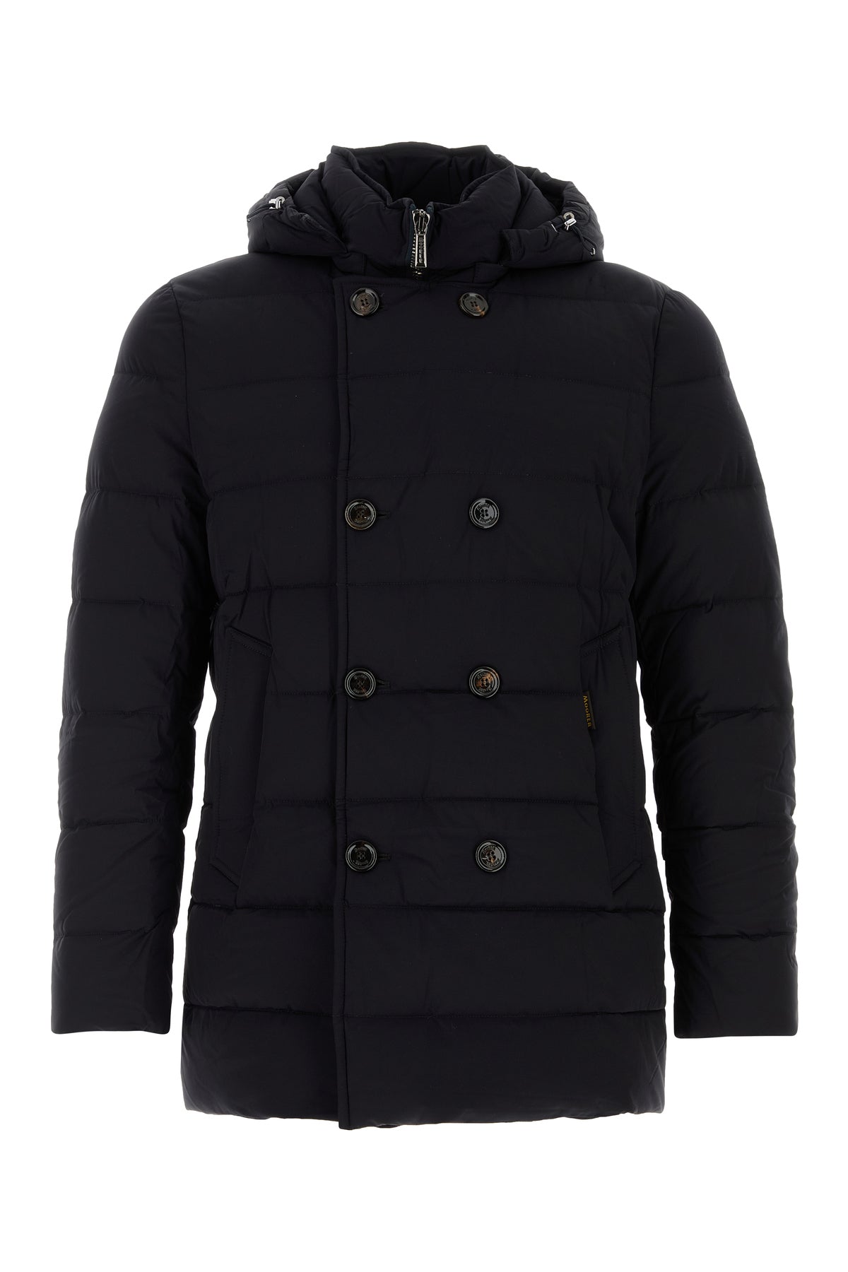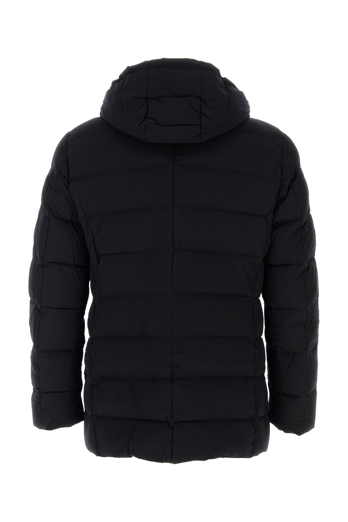 Down jacket realized in quilted nylon blend characterized by drawstring hood.