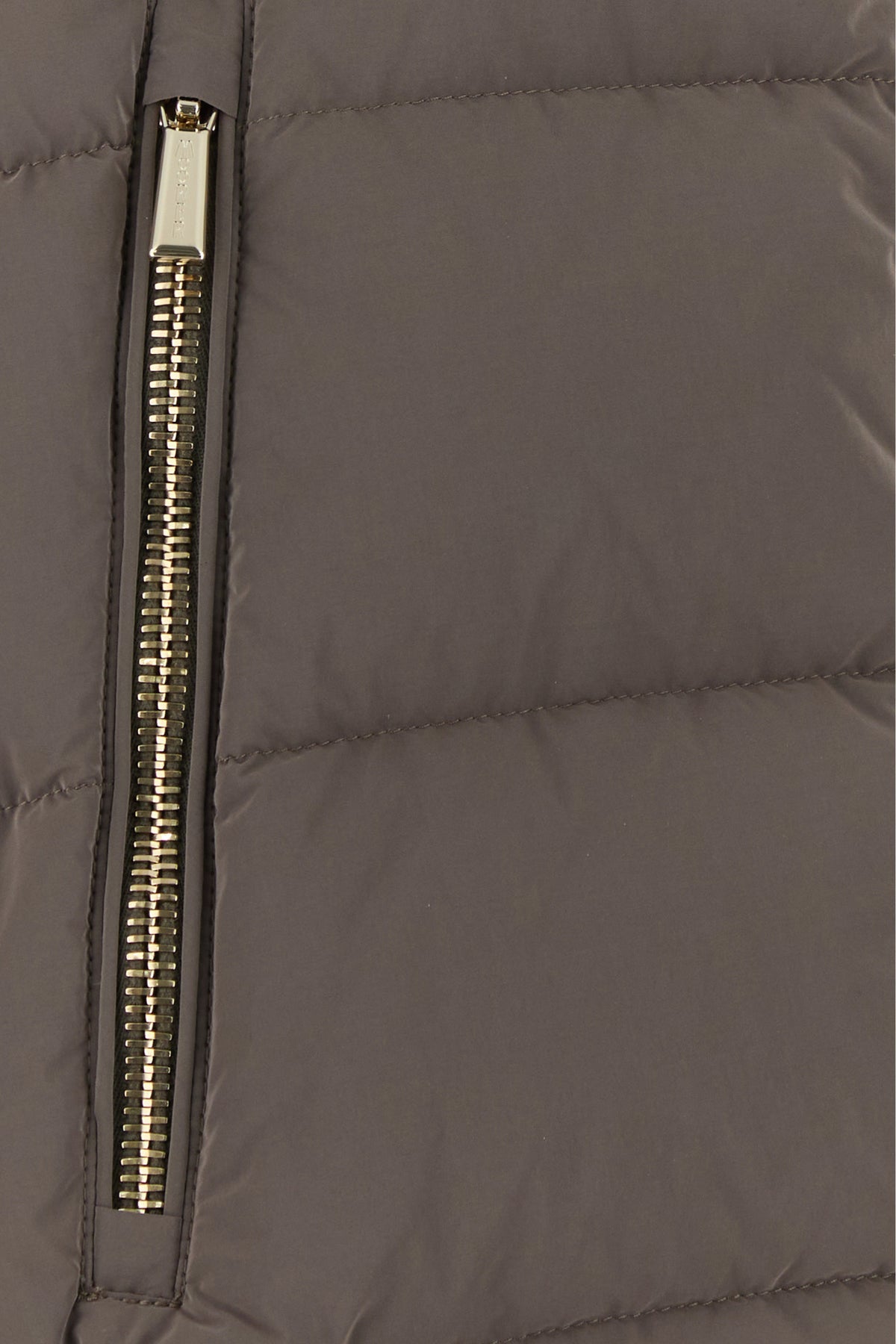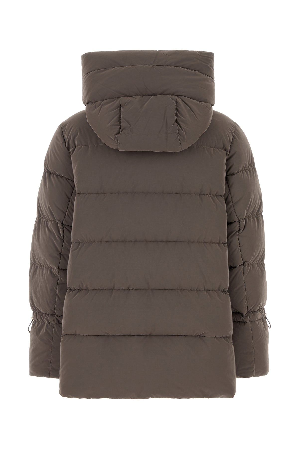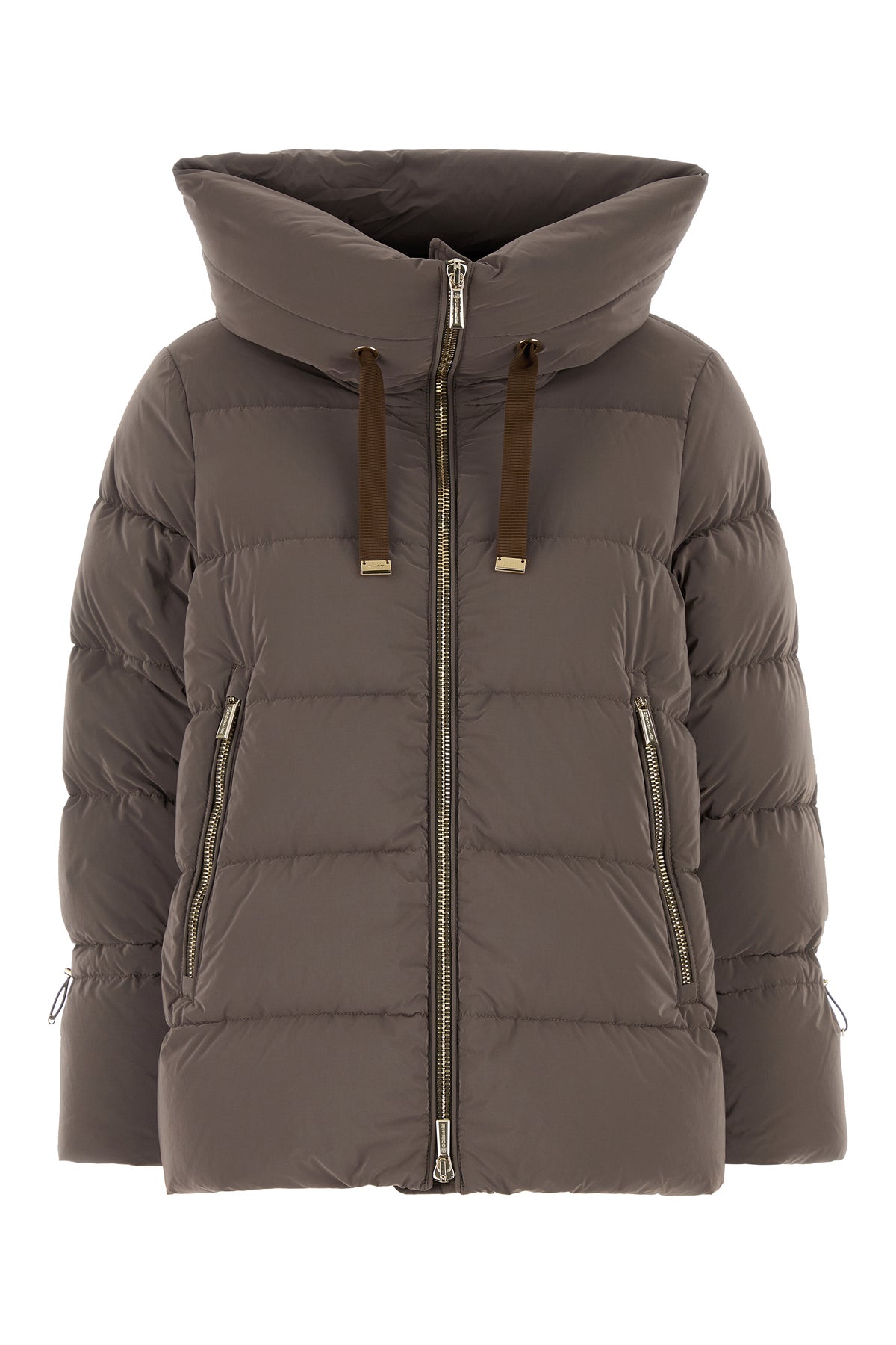 Down jacket realized in quilted nylon blend characterized by drawstring hood.