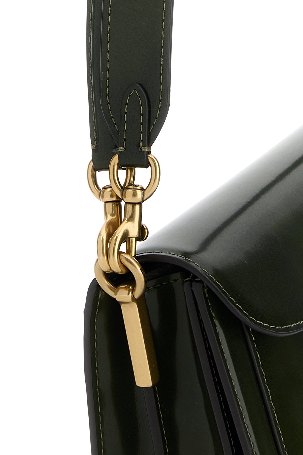 Handbag realized in pebble leather enriched by logoed metal detail at the front.