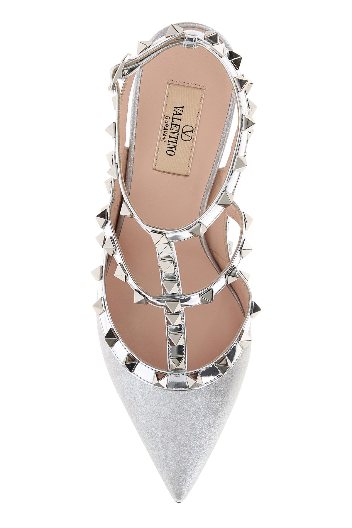Slingback realized in laminated fabric and leather enriched by metal studs on the trimmings.