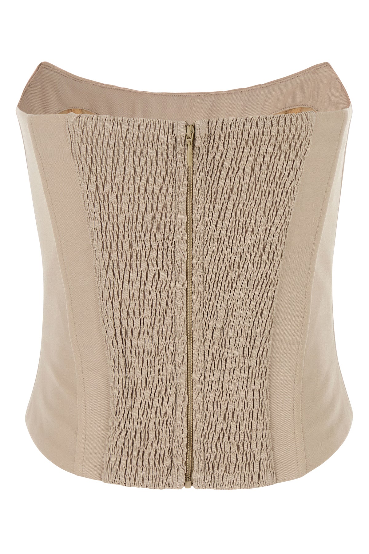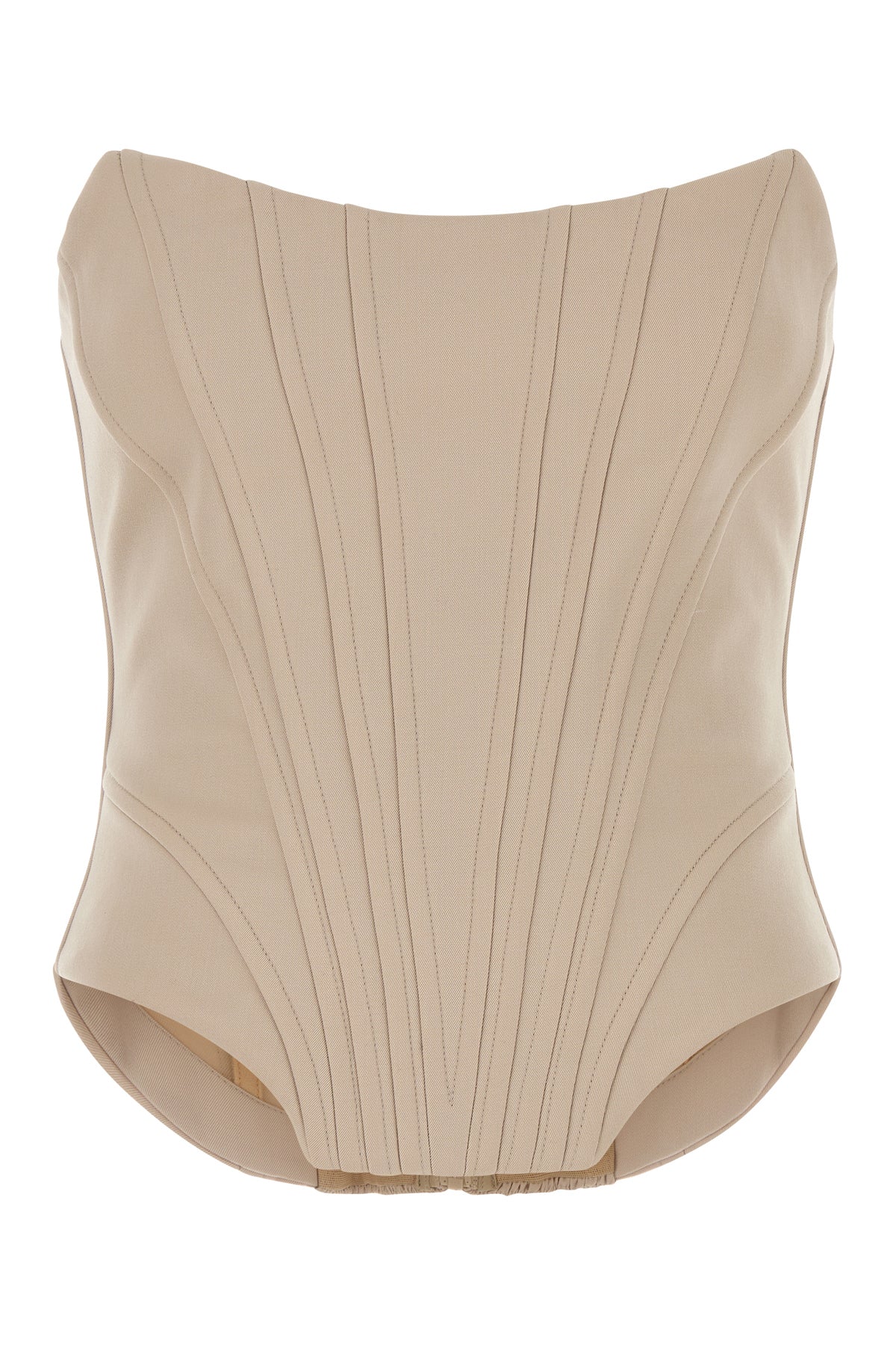 Boned bodice realized in pure virgin wool charactered by peculiar neckline.