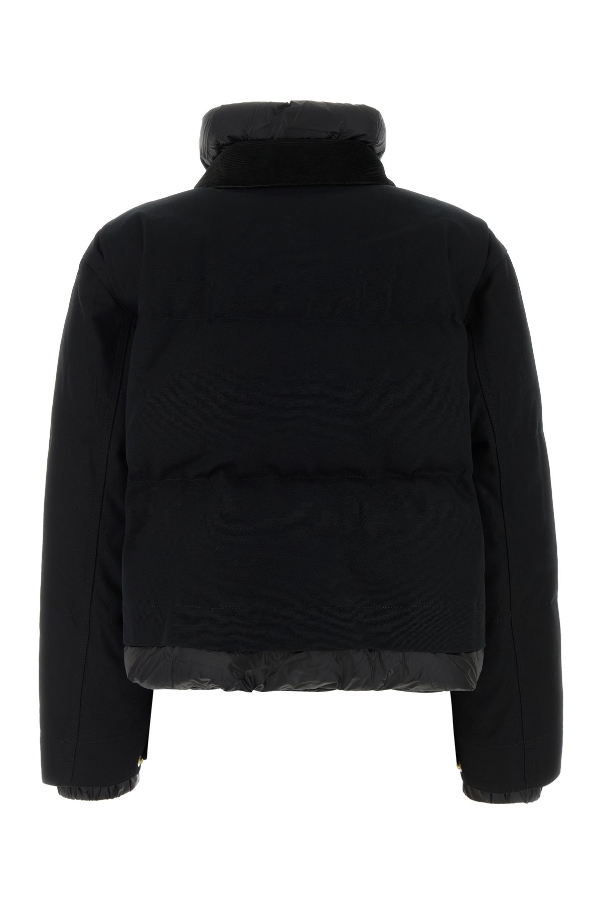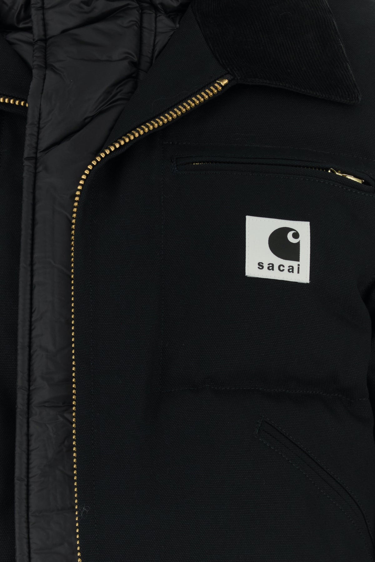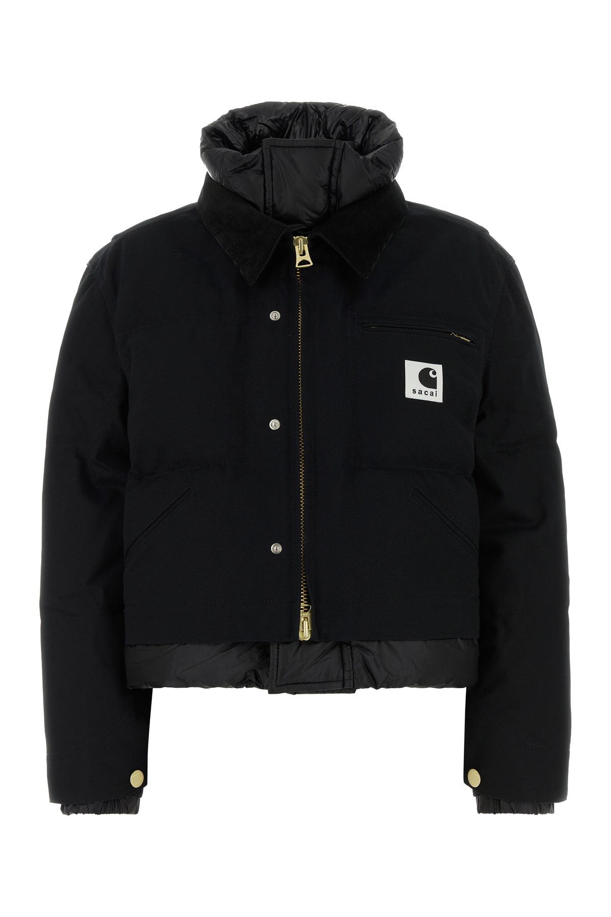 Short-cut down jacket realized in pure cotton and nylon enriched by Sacai by Carhartt label on the chest.