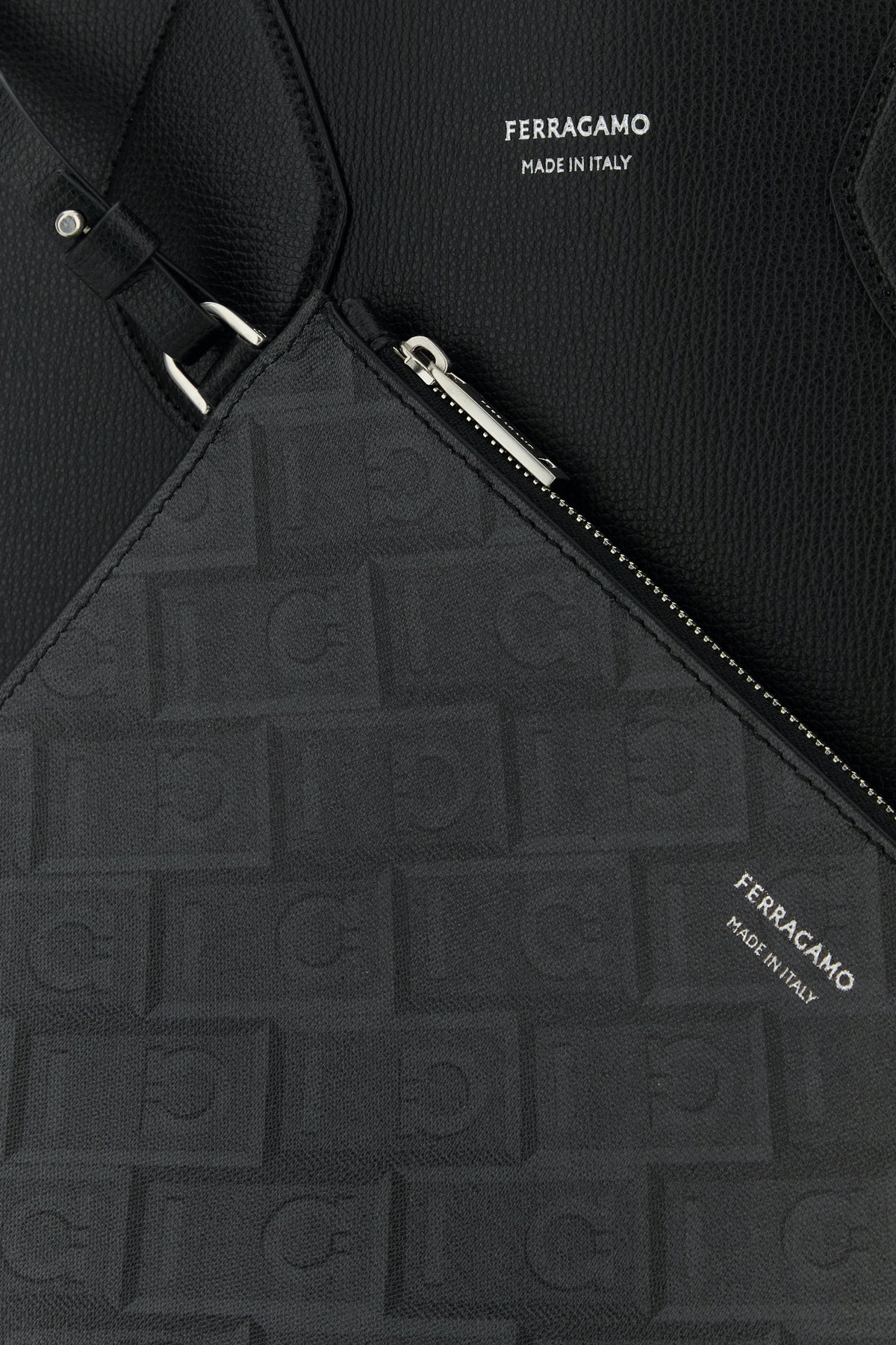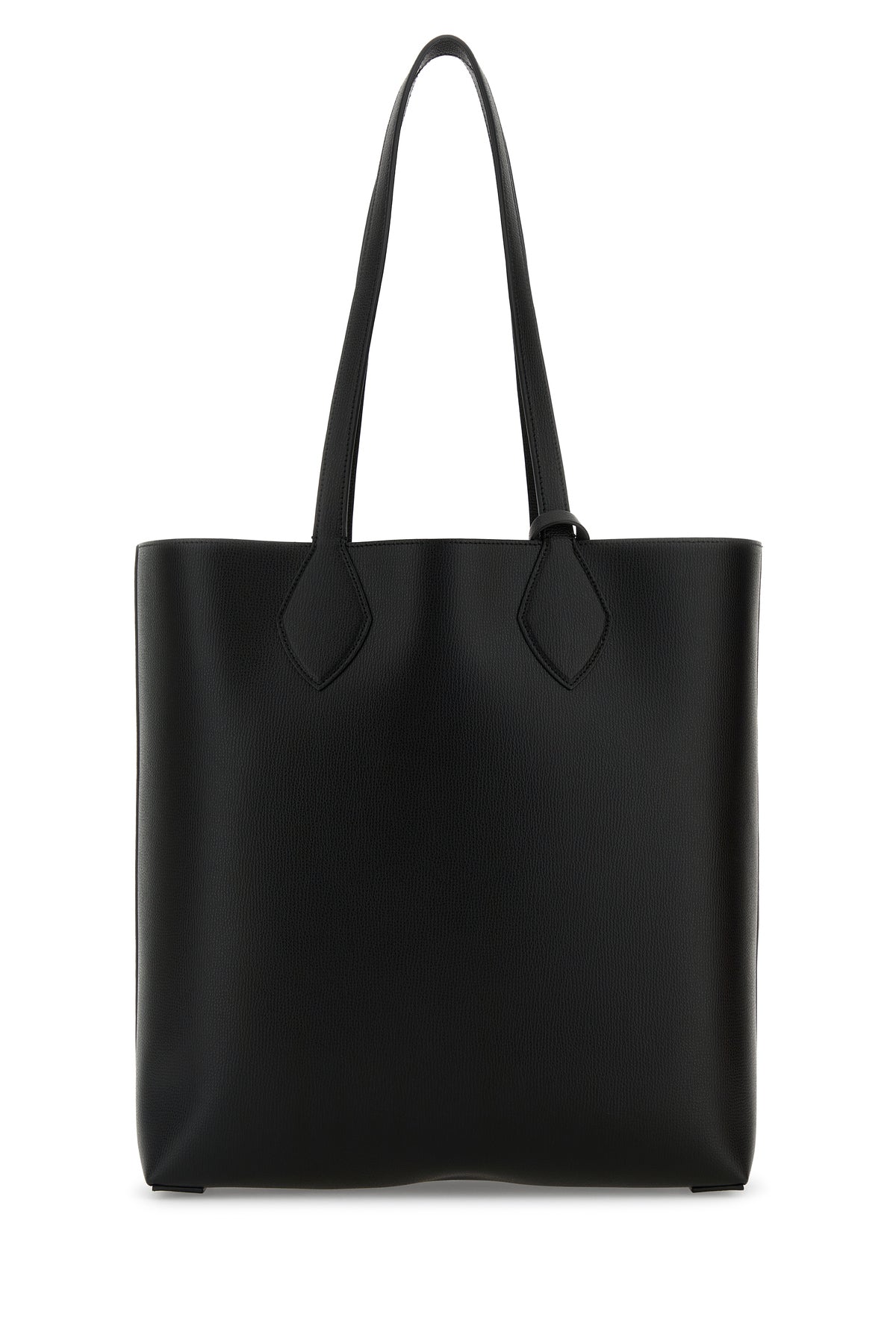 Shopping bag realized in pebble calf leather characterized by laminated printed logo at the front.