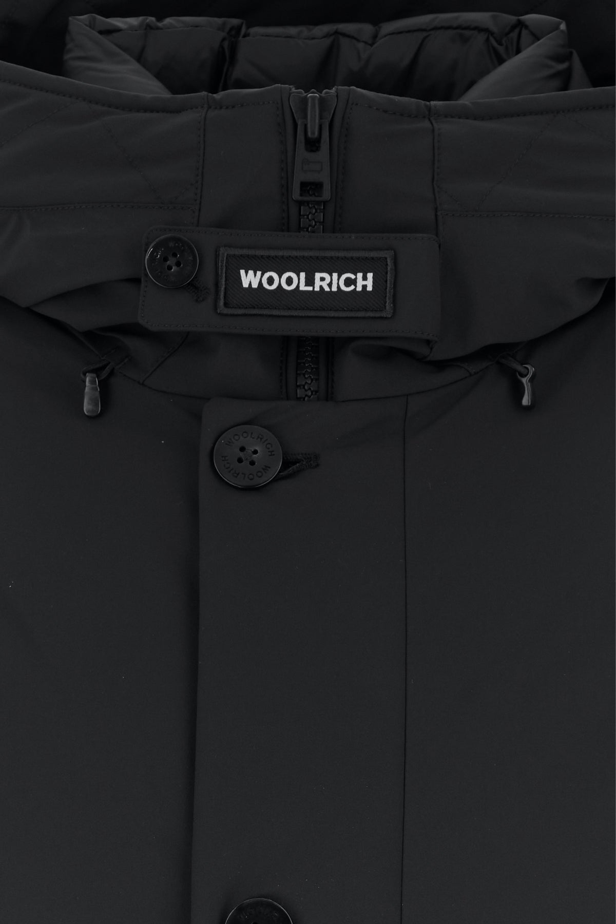 Down jacket realized in stretch nylon enriched by logoed label at the top.