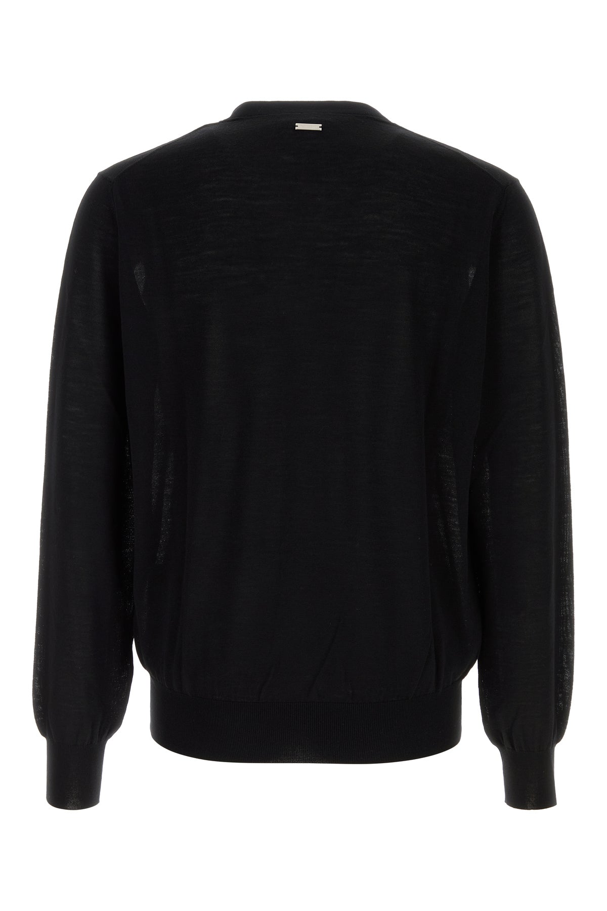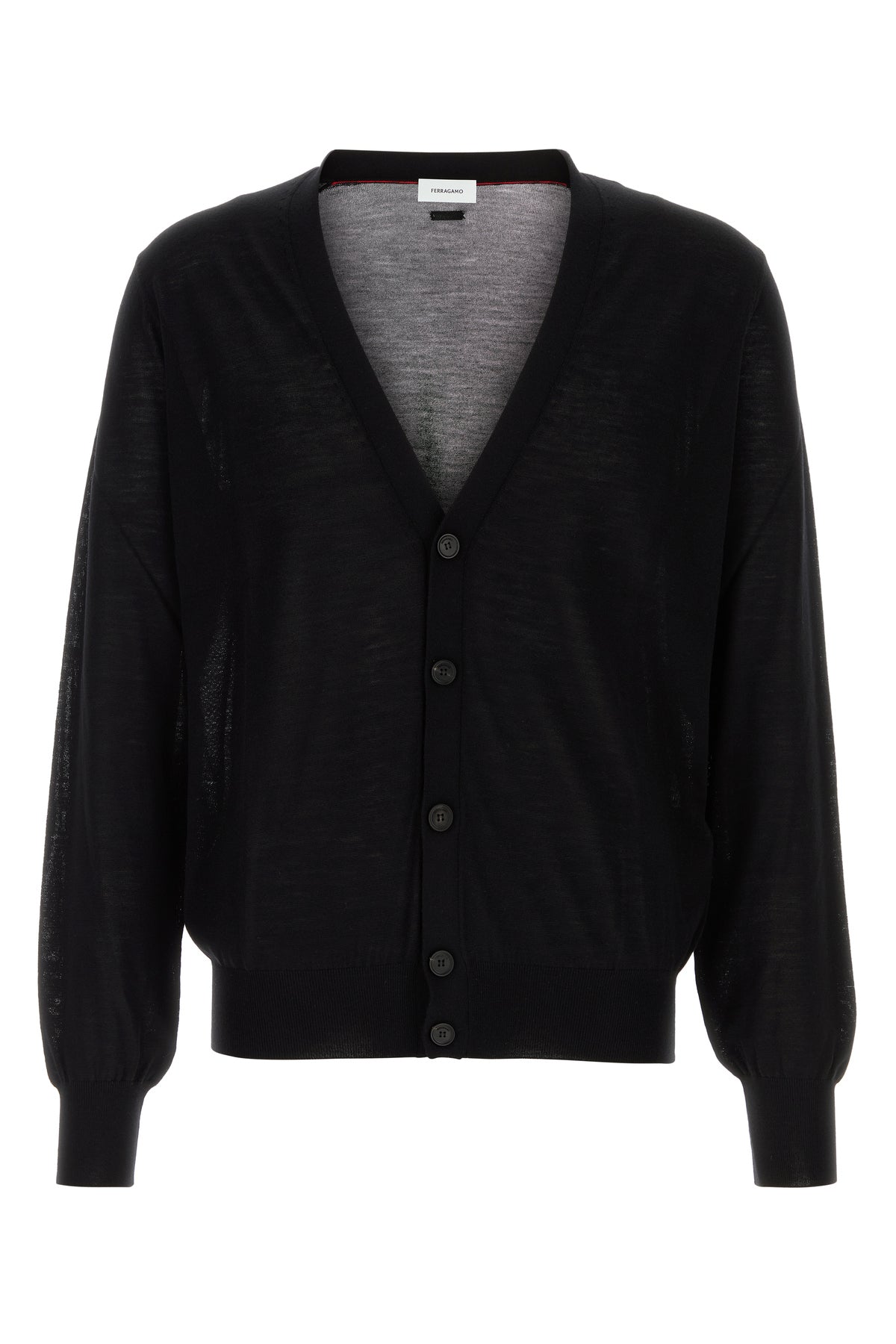 Cardigan realized in virgin wool blend enriched by logoed metal plate at the back.