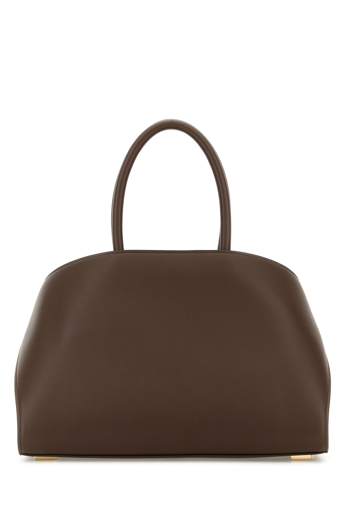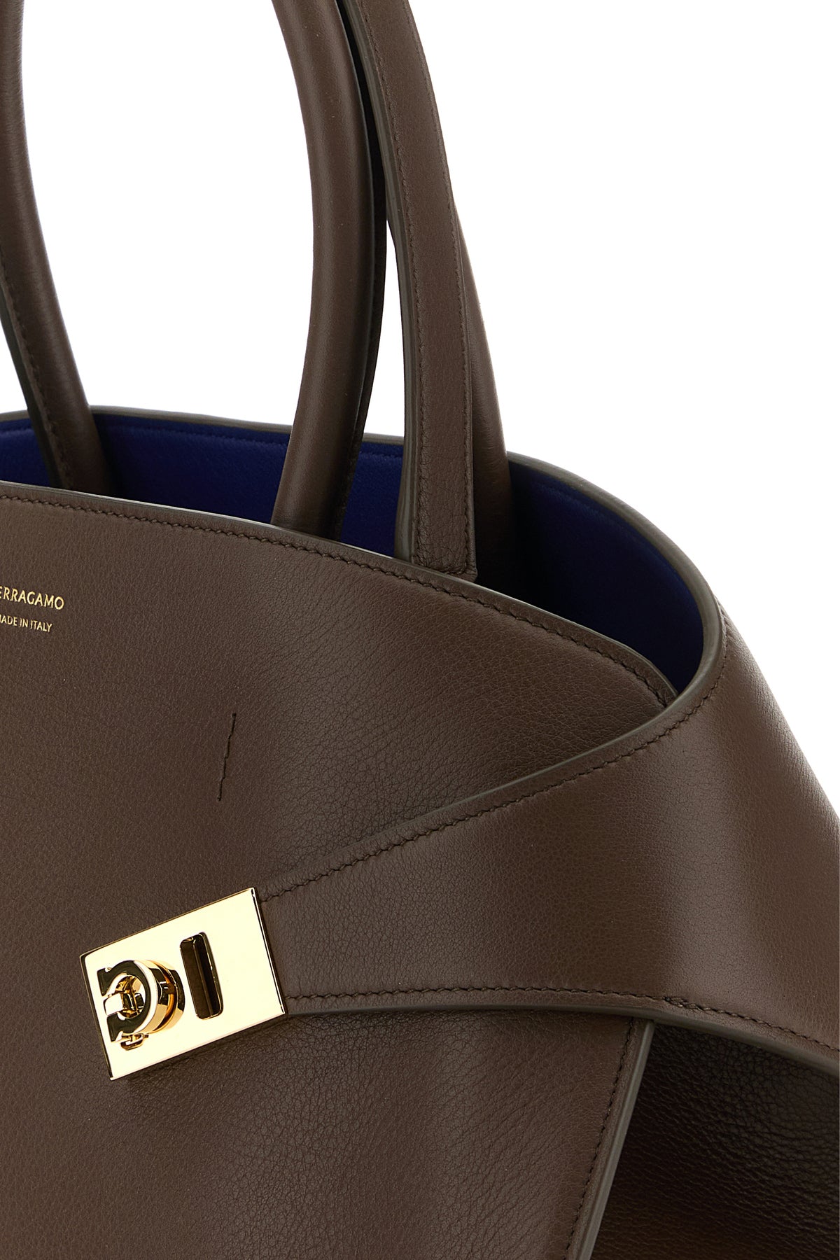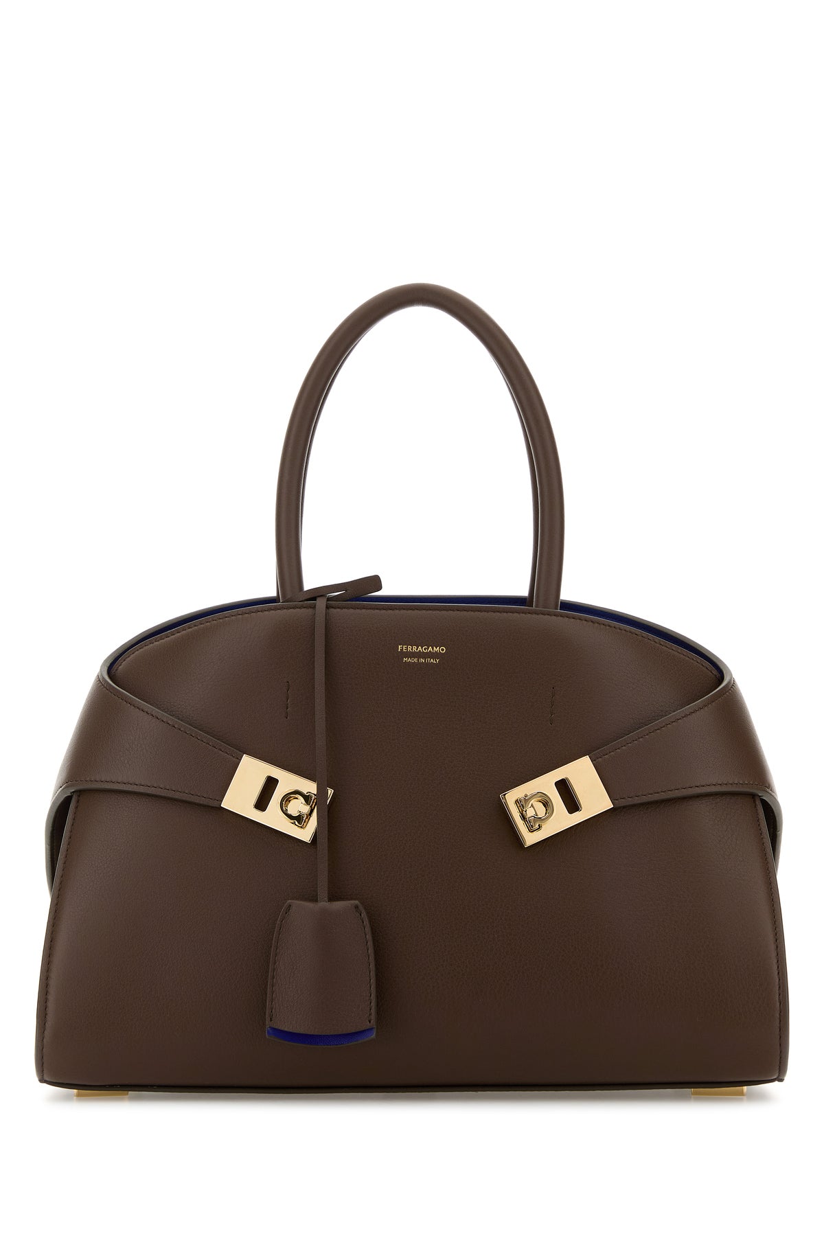 Handbag realized in pebble calf leather characterized by laminated printed logo at the front enriched by leather straps with metal Gancini details at the front and detachable keyring accessory.