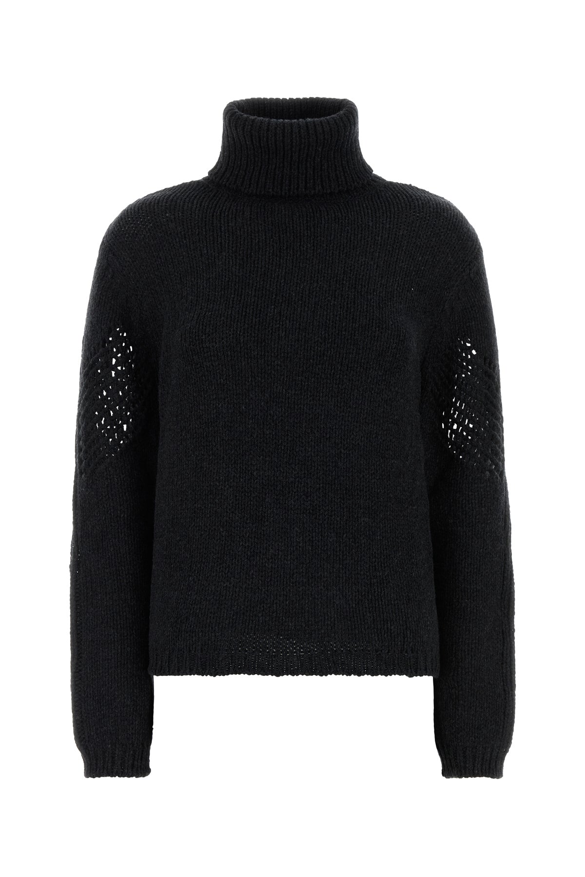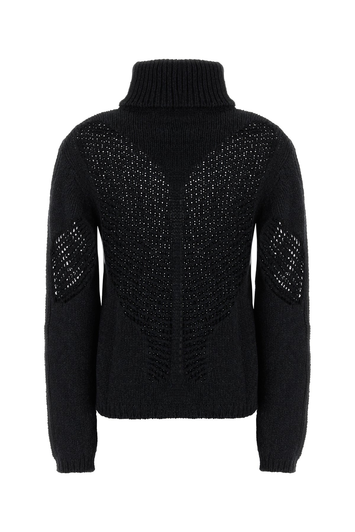 Sweater realized in pure merino wool characterized by knitted embellishment on the sleeves and at the back.
