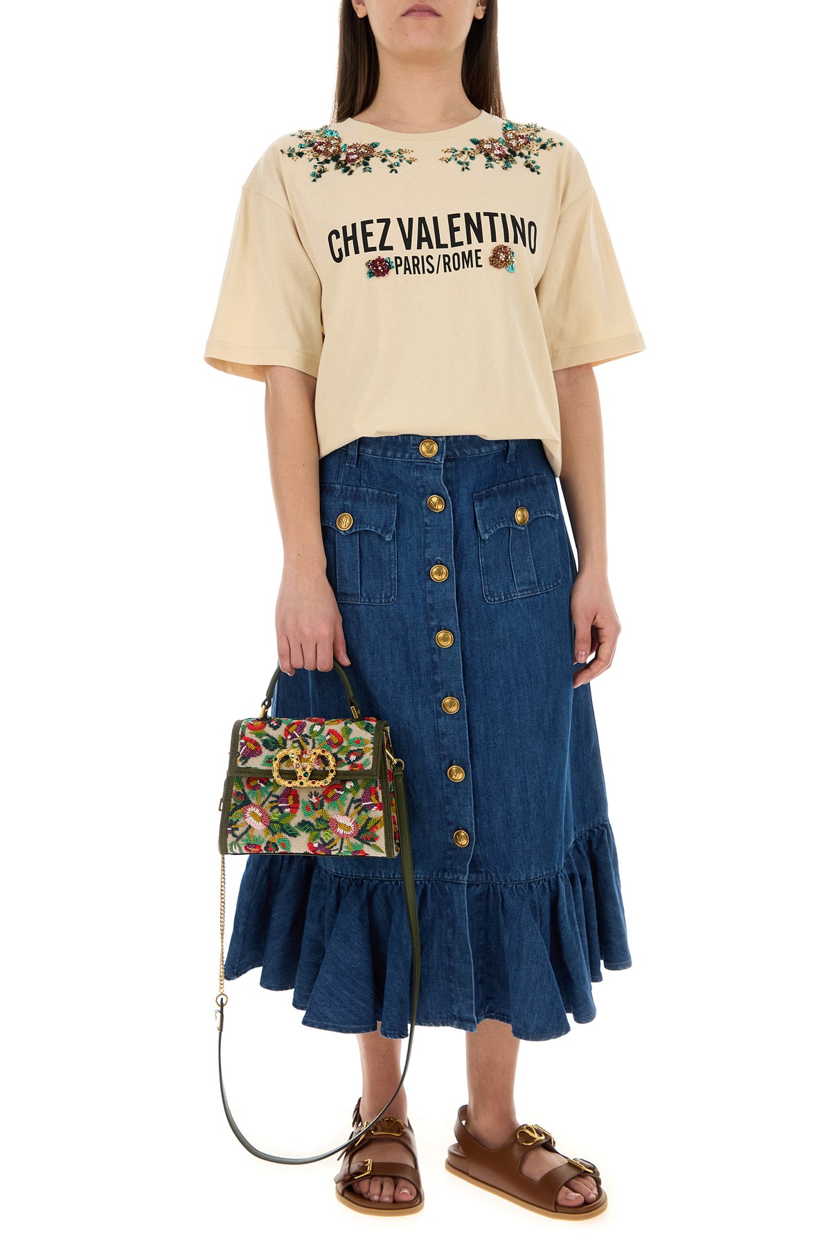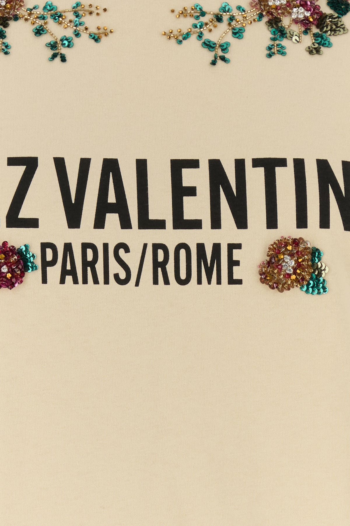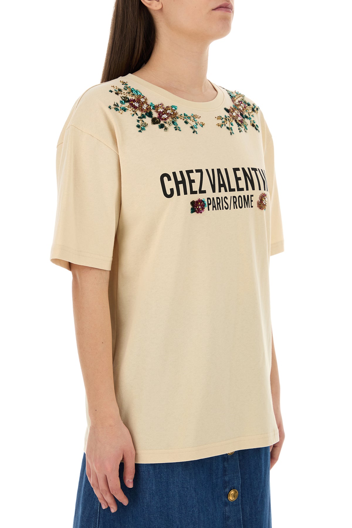 T-shirt realized in pure cotton characterized by Chez Valentino print at the front enriched by jewel floral embellishment at the top.