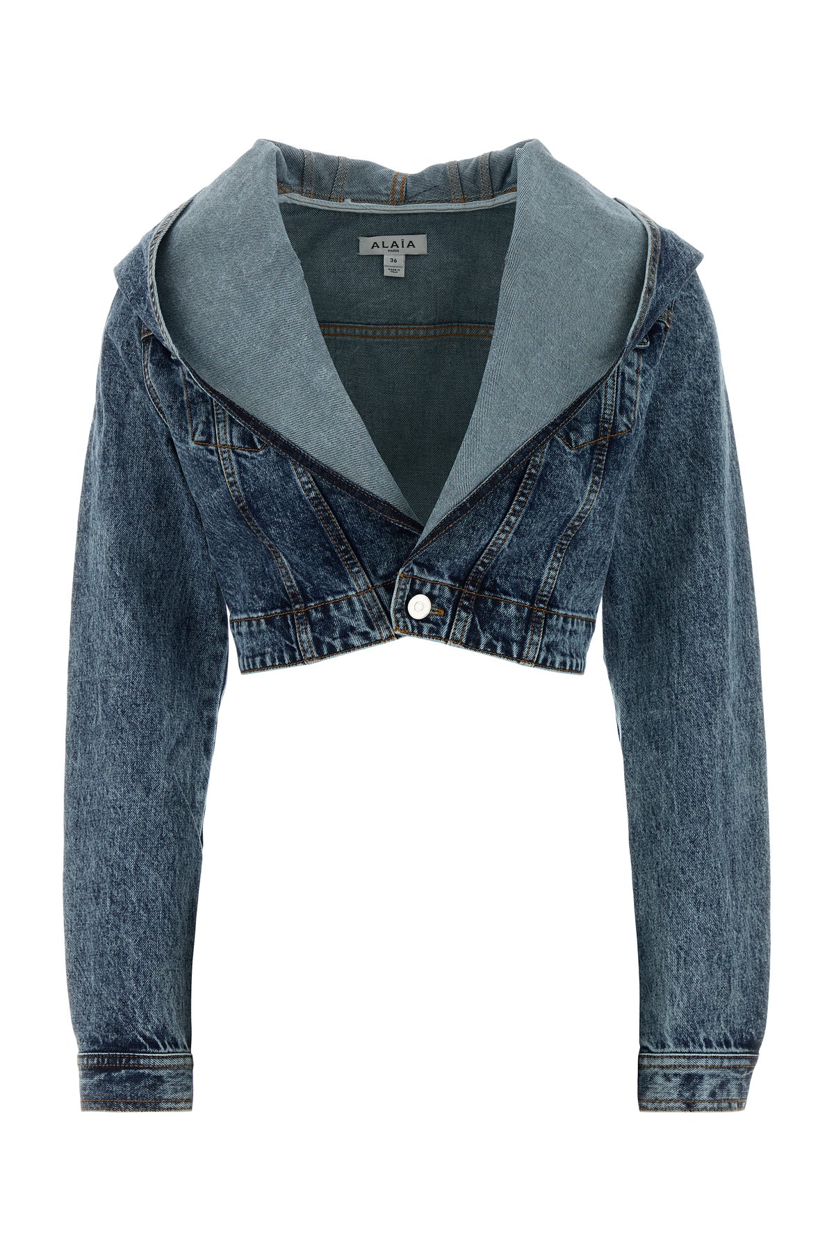 Cropped-cut jacket realized in stonewashed pure cotton denim characterized by hood.