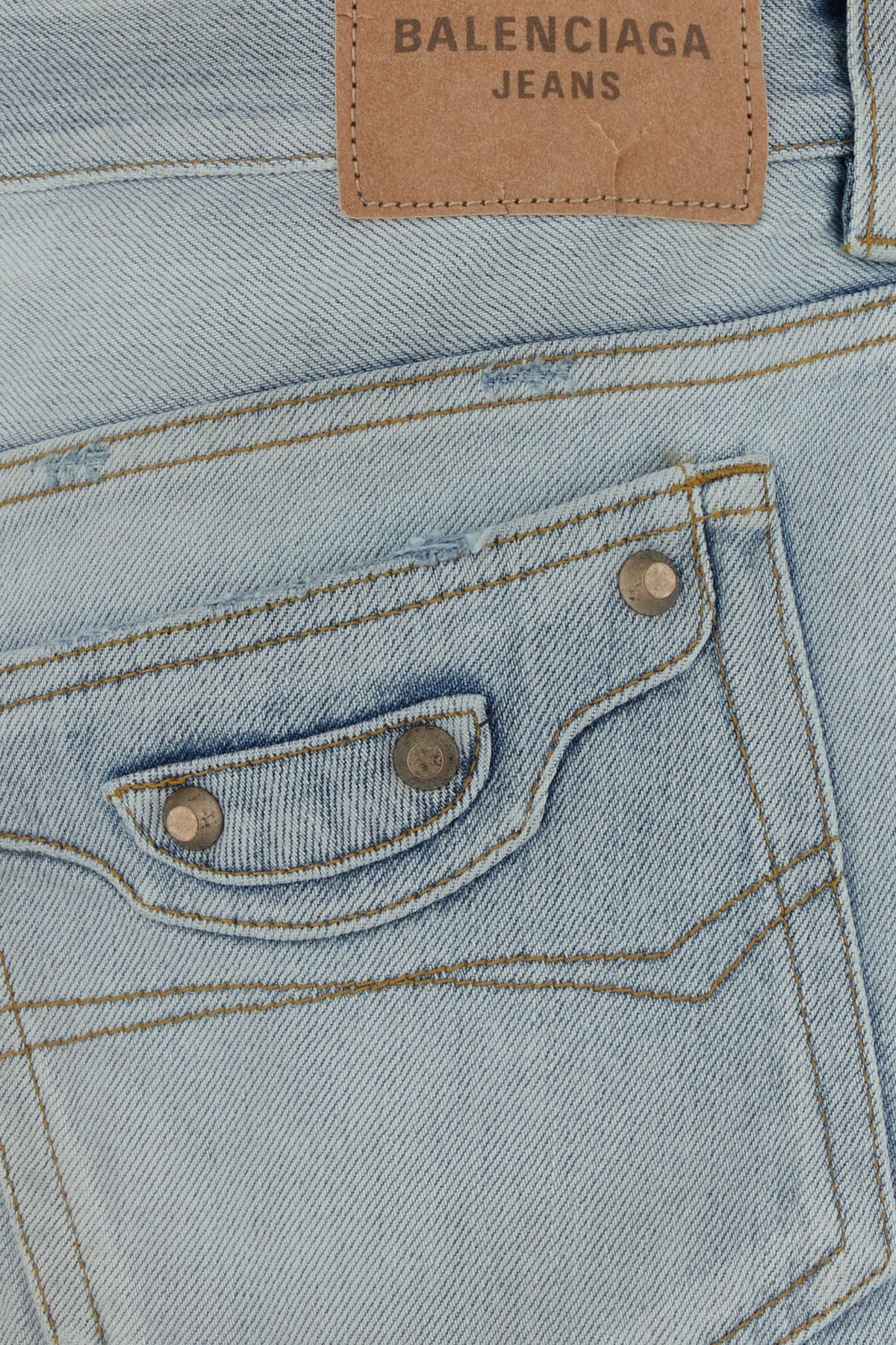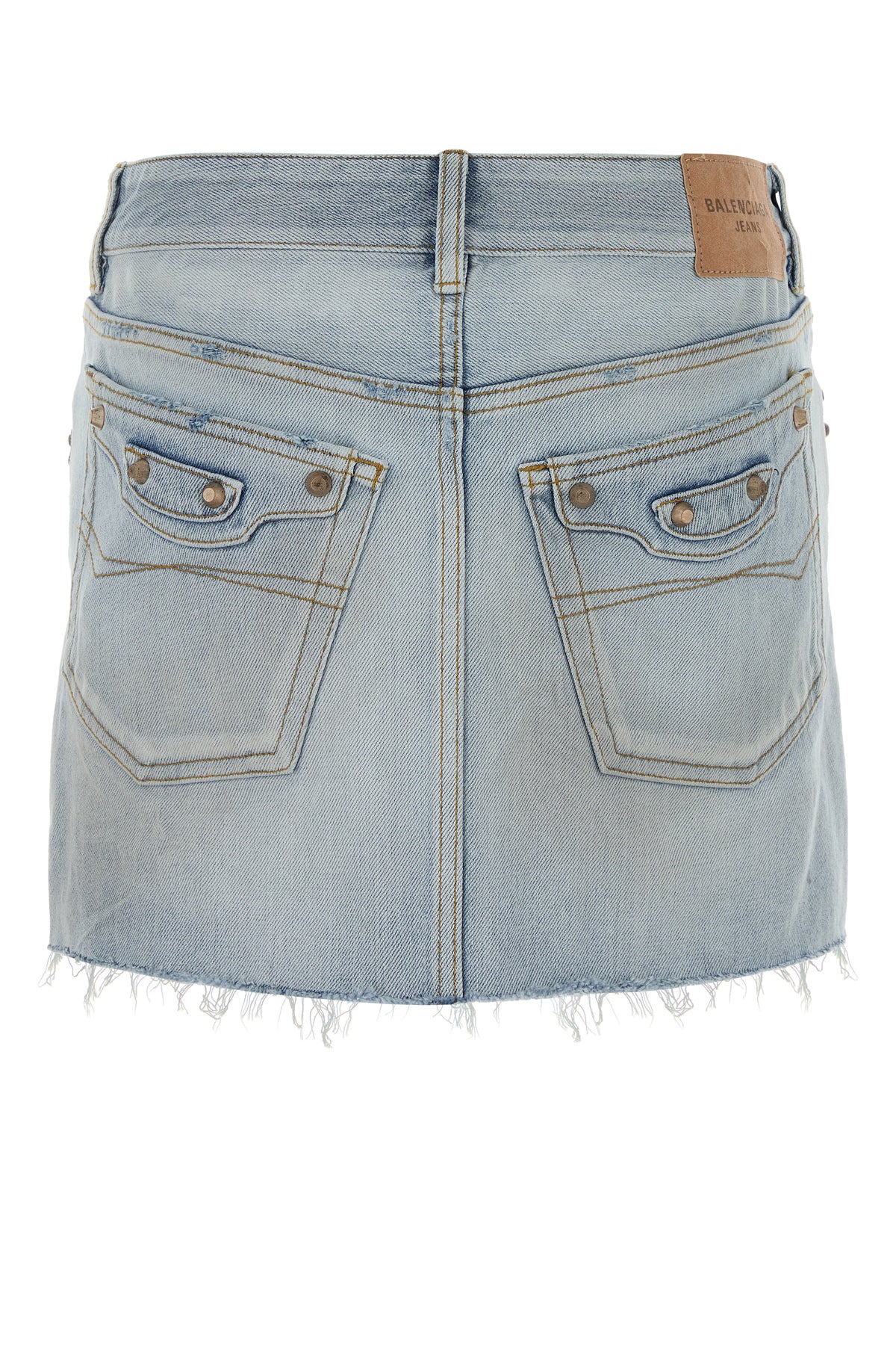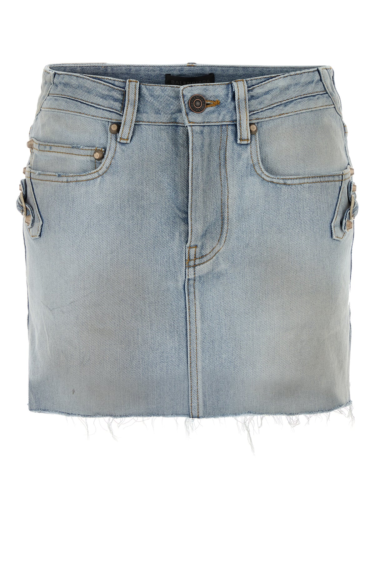 Mini skirt realized in stonewashed and slightly distressed pure cotton denim with intentional dirties on the entire surface enriched by metal studs at the front and at the back.