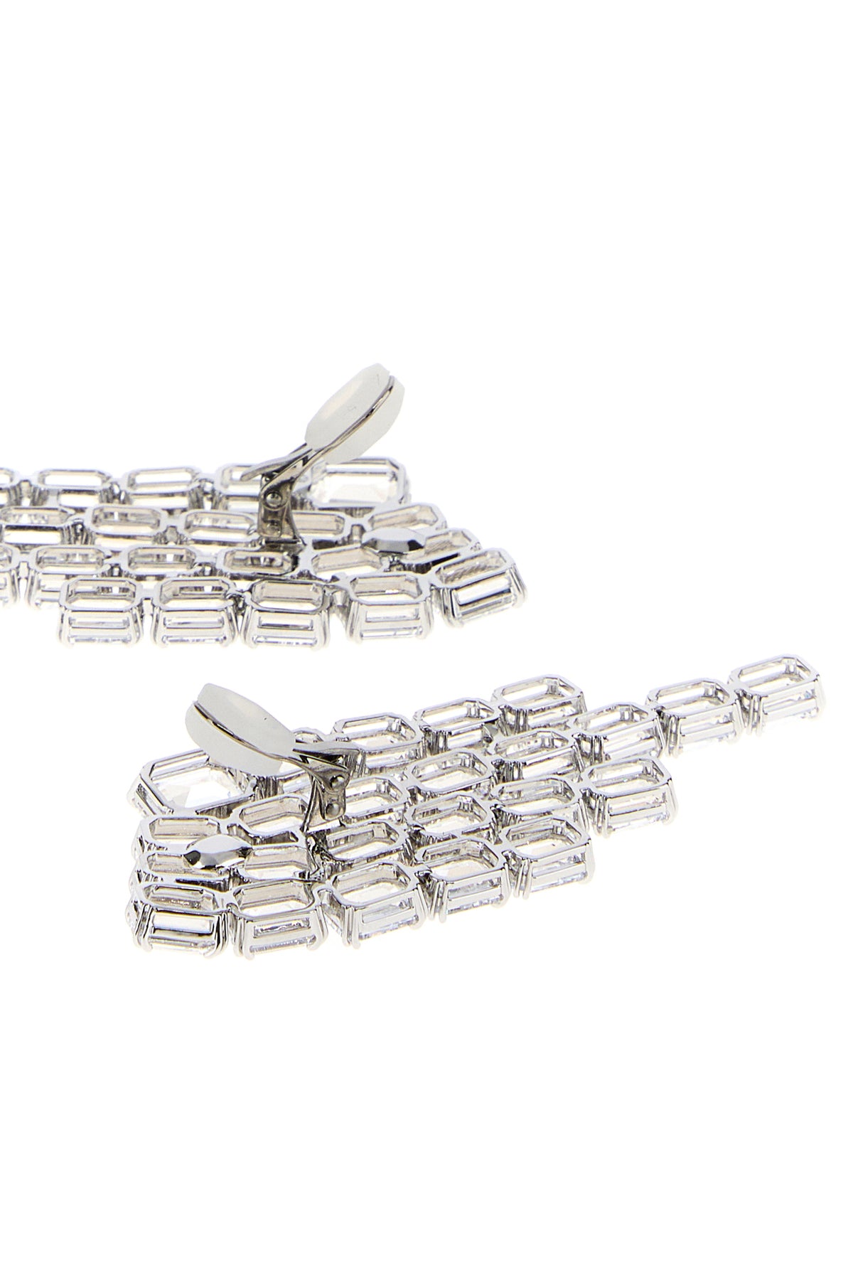 Clip earrings realized in silver-tone pleated metal enriched by rhinestones.