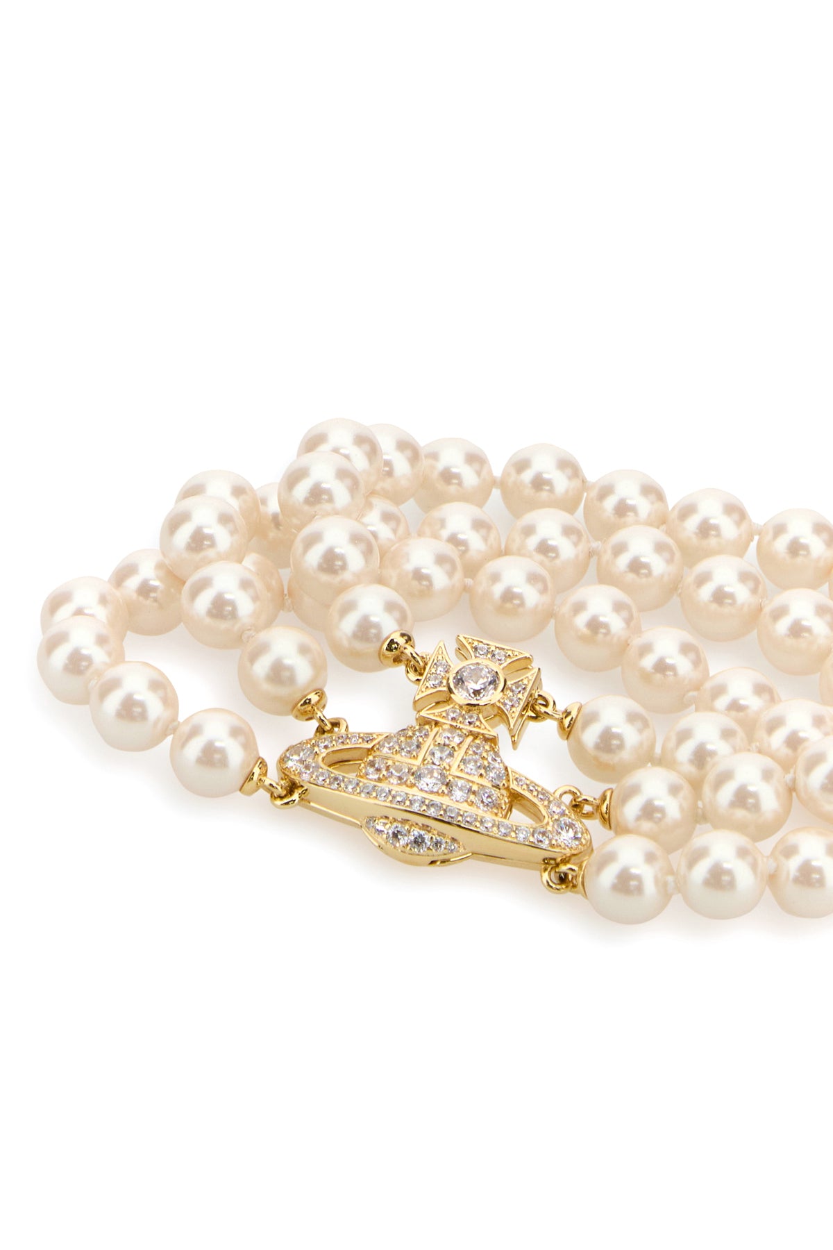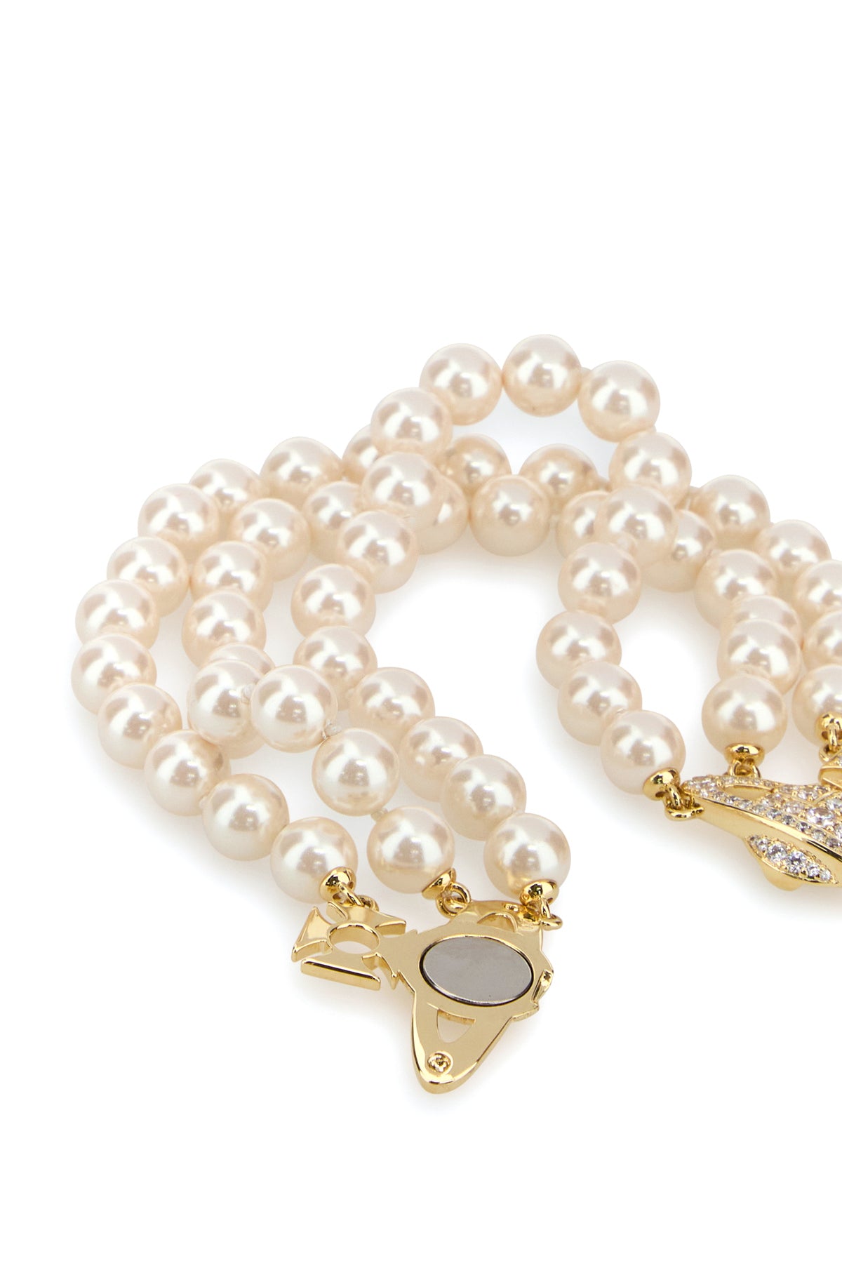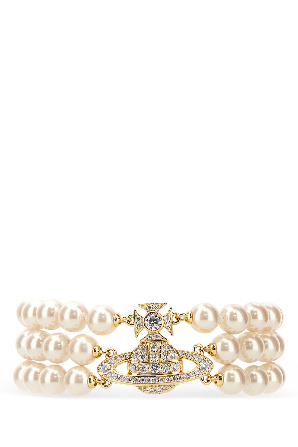 Bracelet realized in pearls enriched by metal Orb detail with rhinestones.
