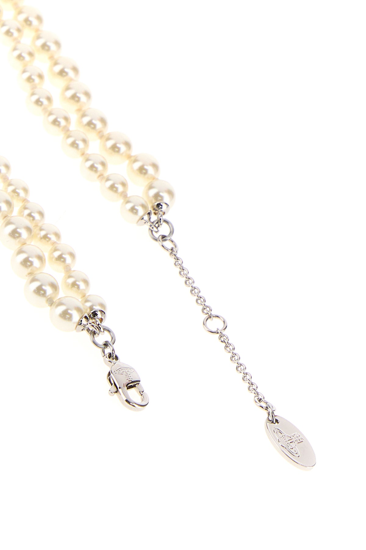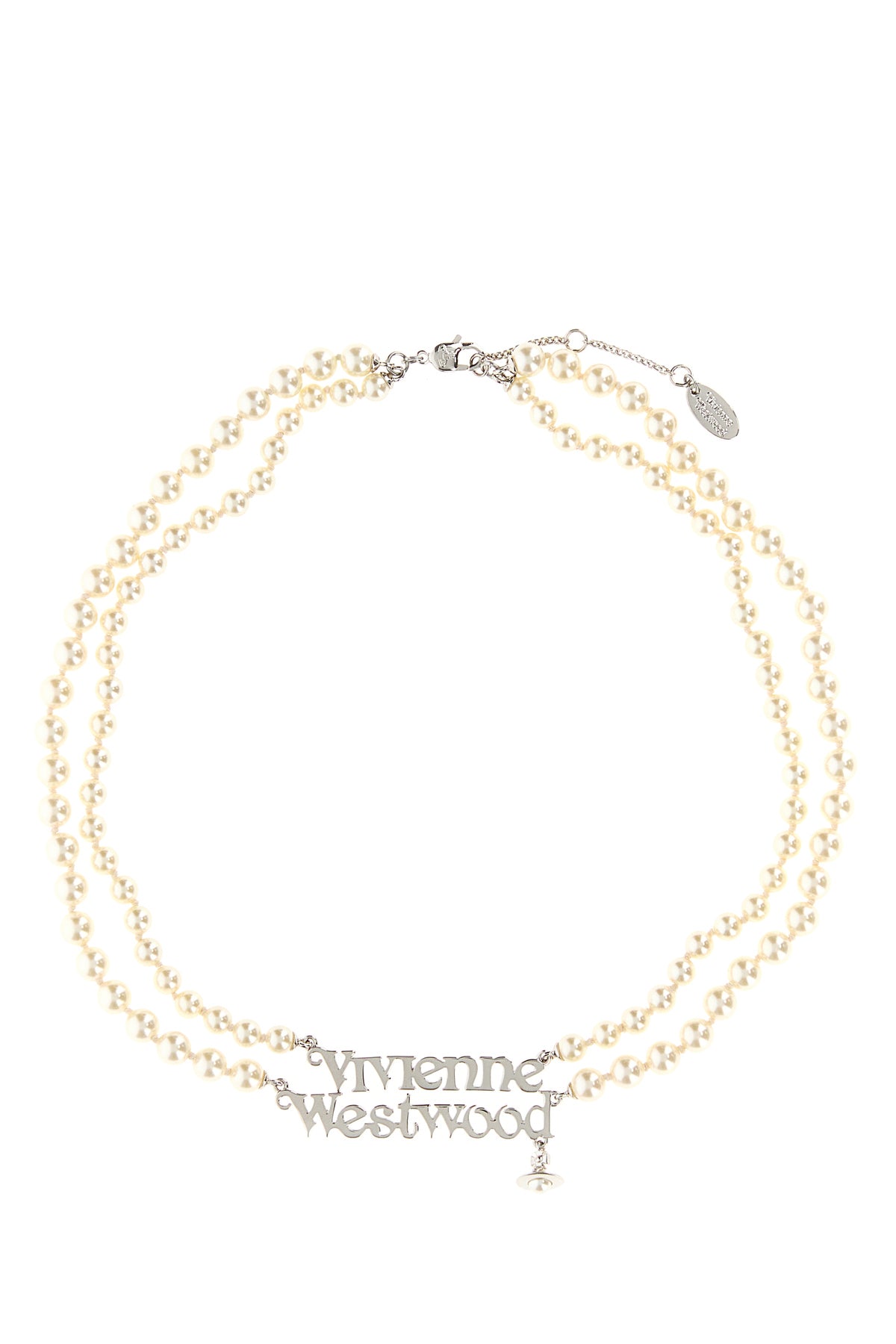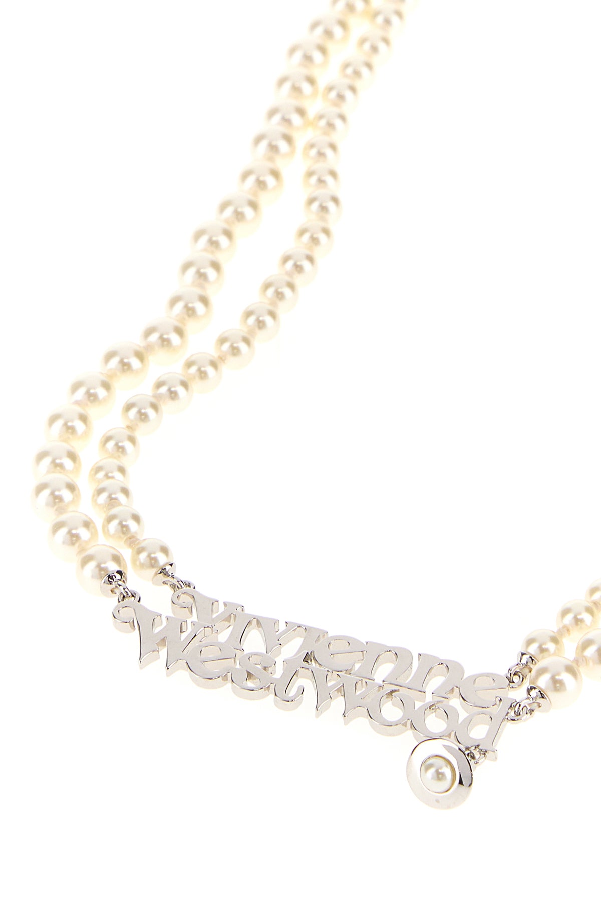 Necklace realized in pearls enriched by metal lettering logo.
