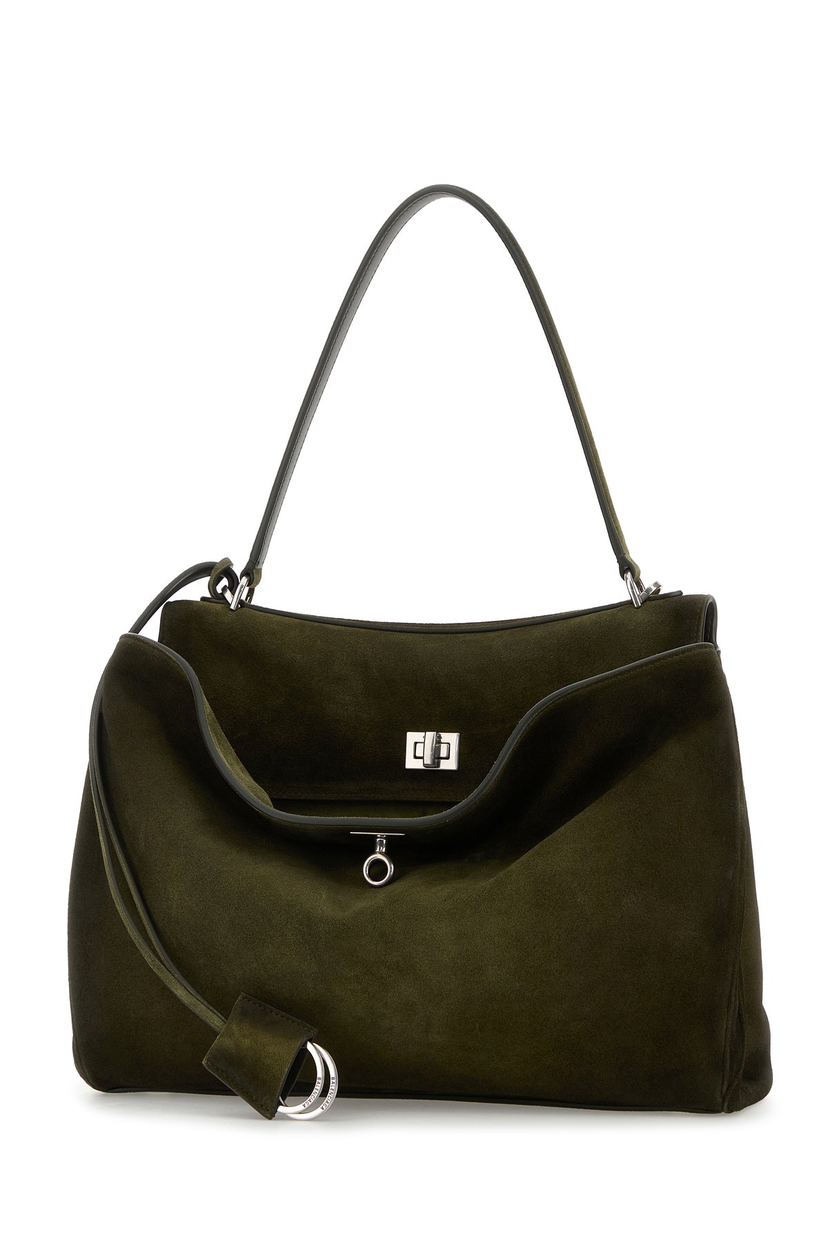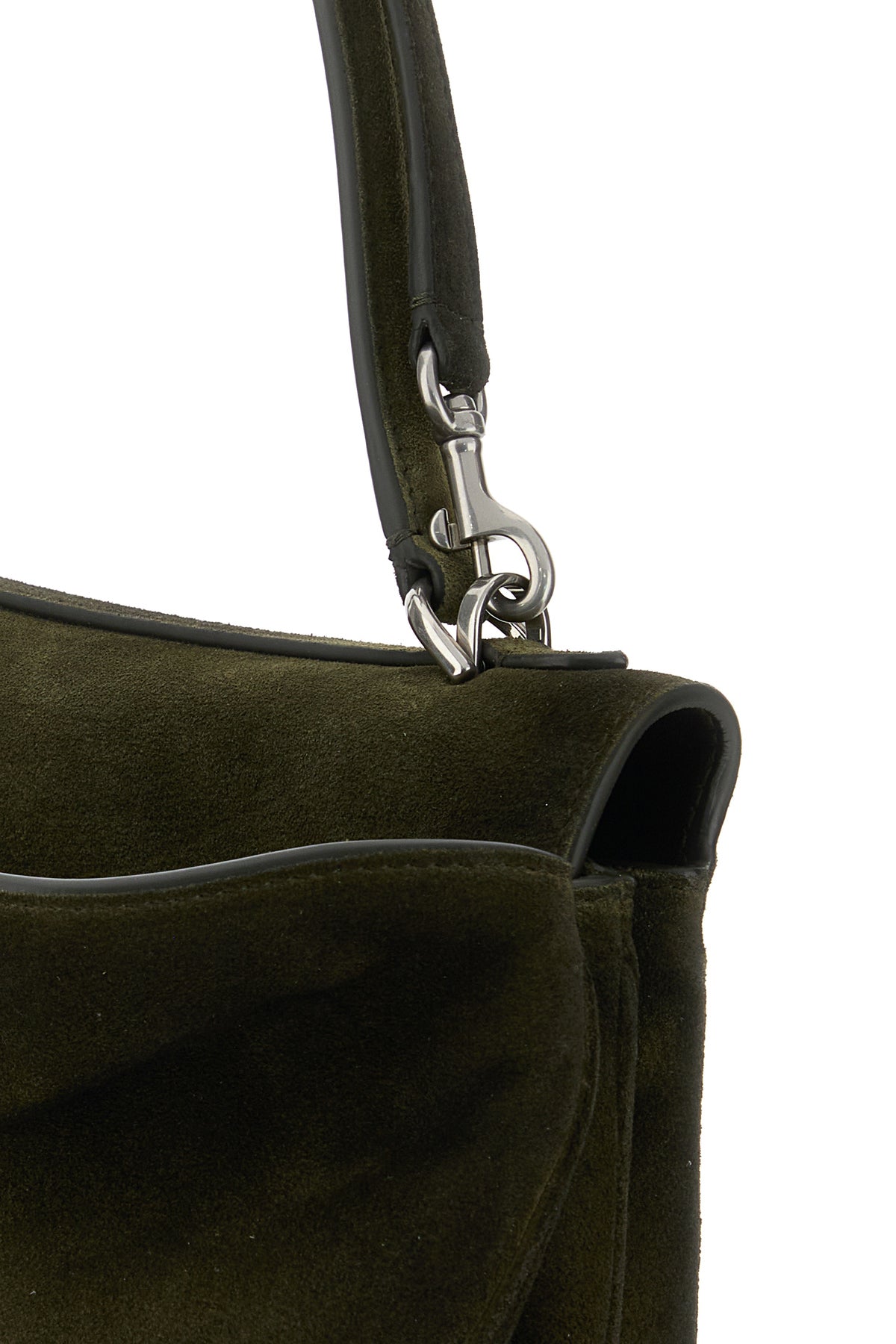 Handbag realized in vintage effect calf suede enriched by detachable tonal leather accessory with metal rings.