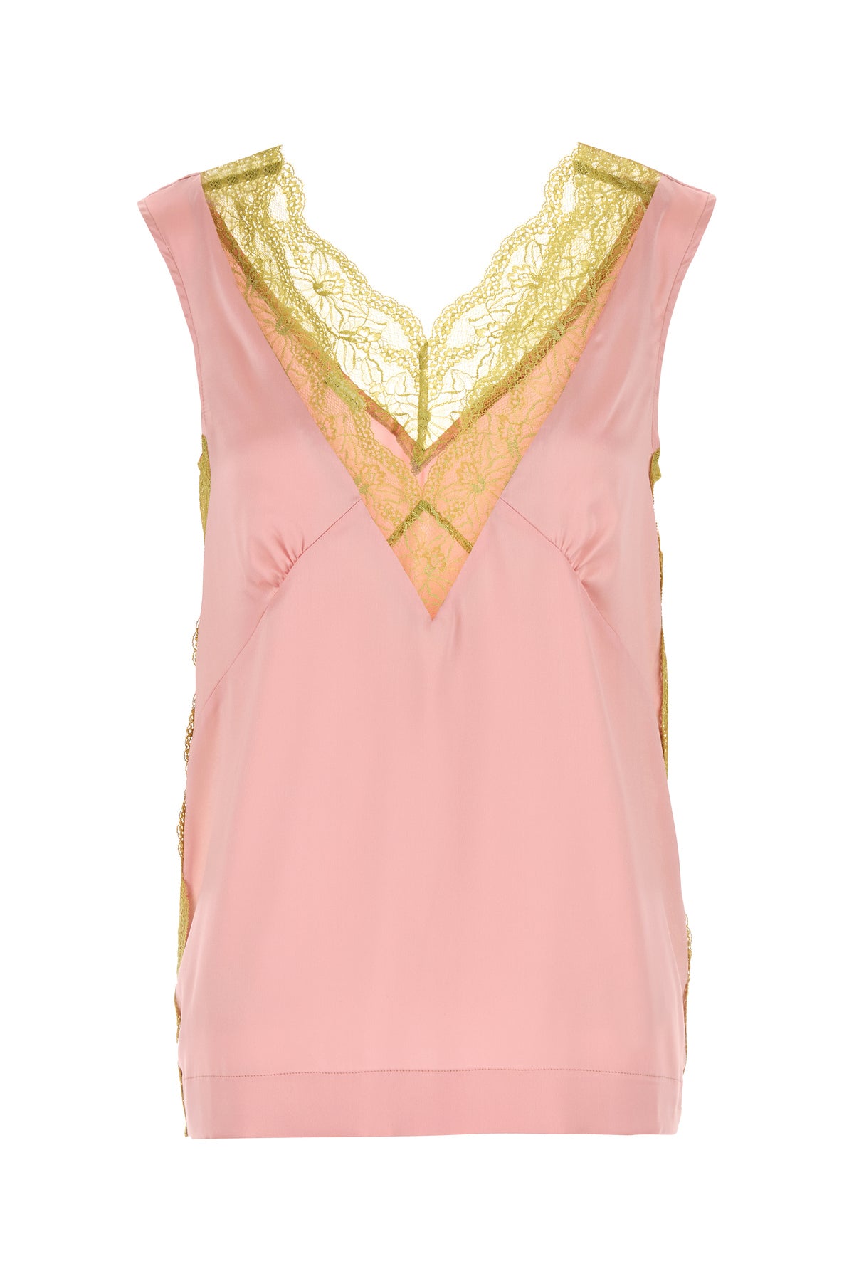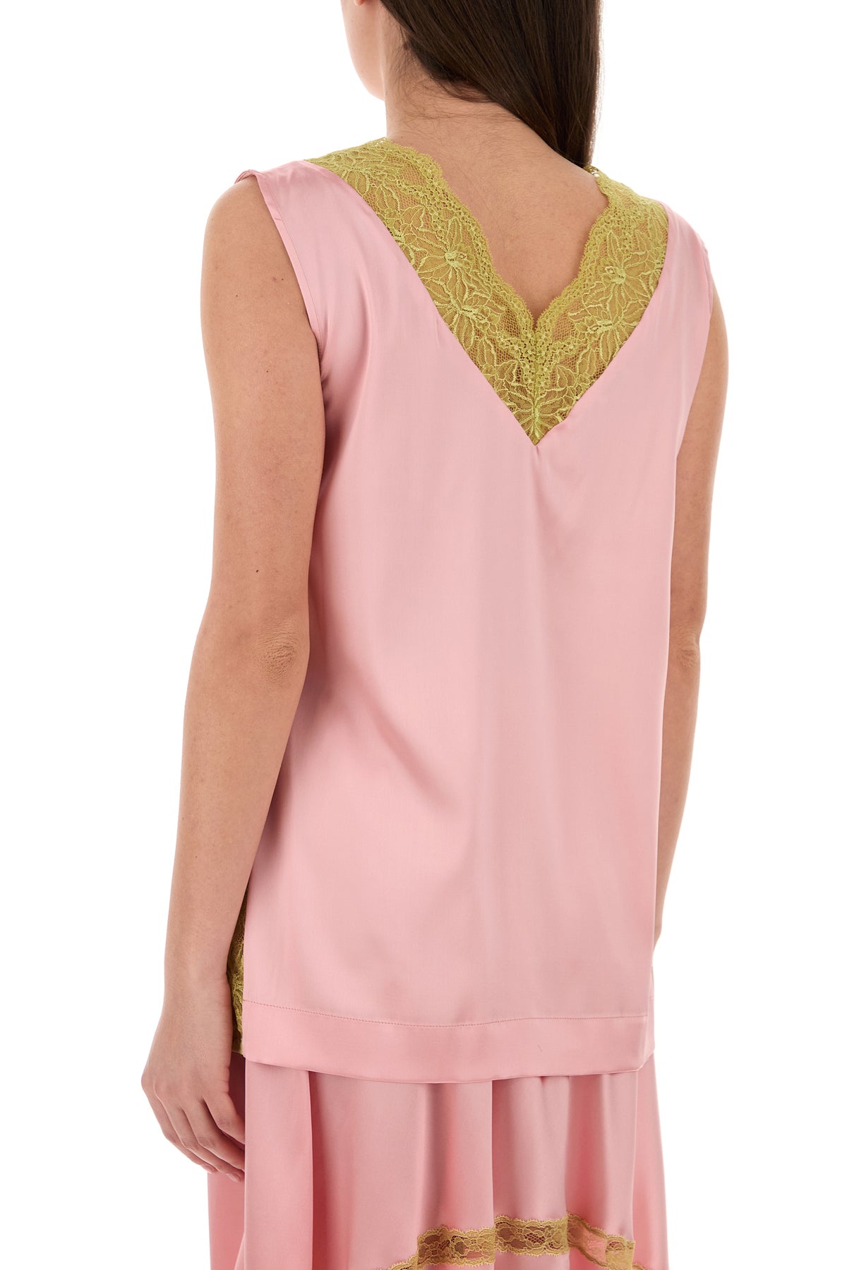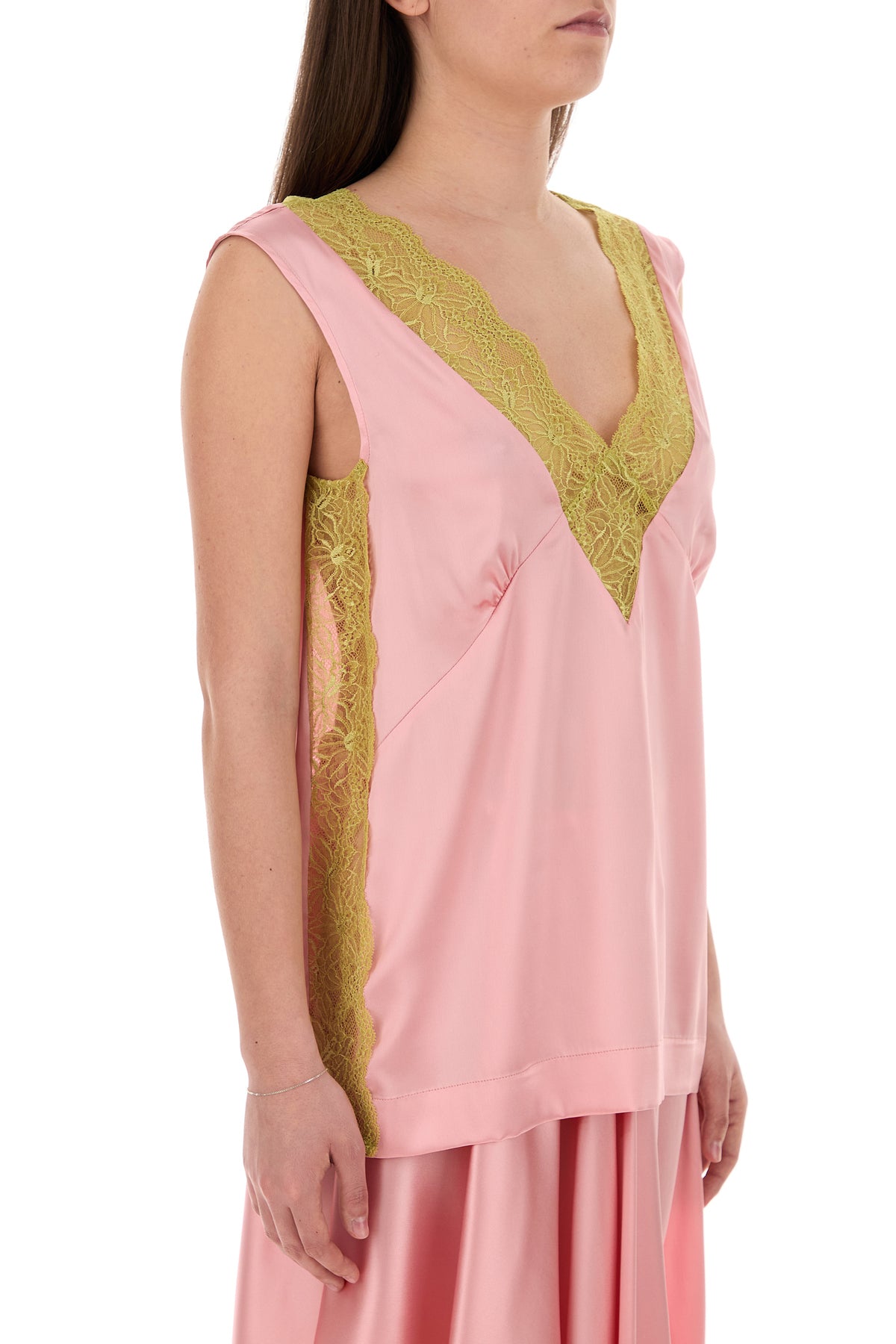 Top realized in stretch silk satin with contrasting lace on the side, on the V neckline and at the back.