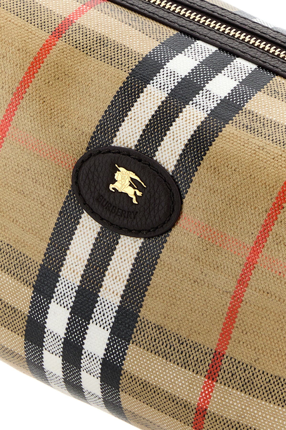 Beauty case realized in coated canvas characterized by Burberry Check print on the entire surface enriched by Equestrian Knight patch at the front.