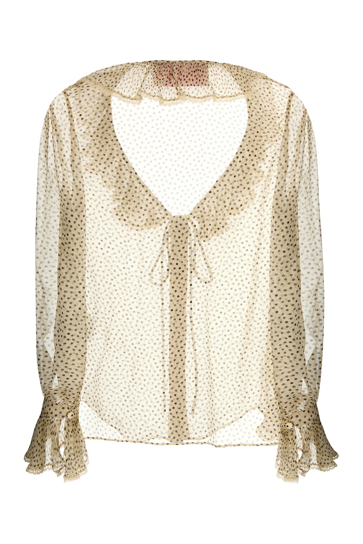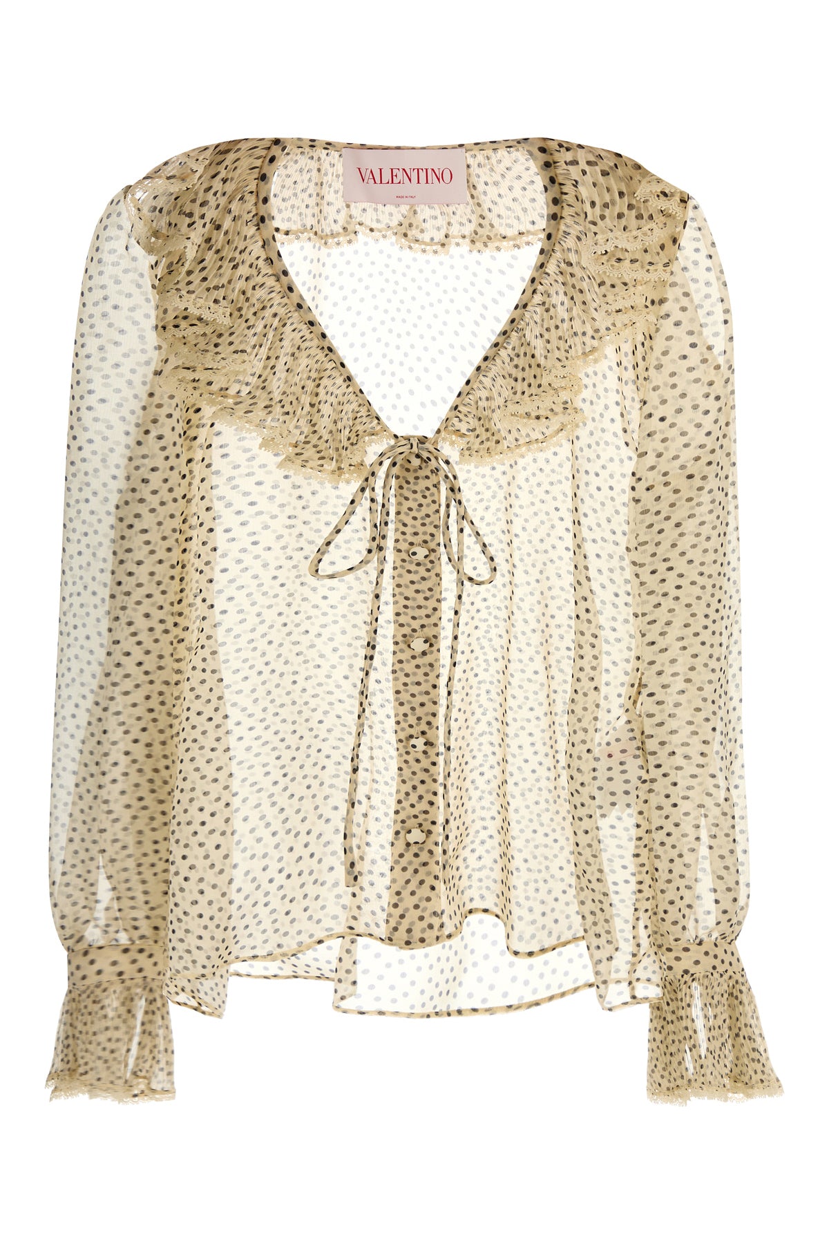 Semi-transparent shirt realized in pure silk georgette characterized by Plusdepois print on the entire surface.