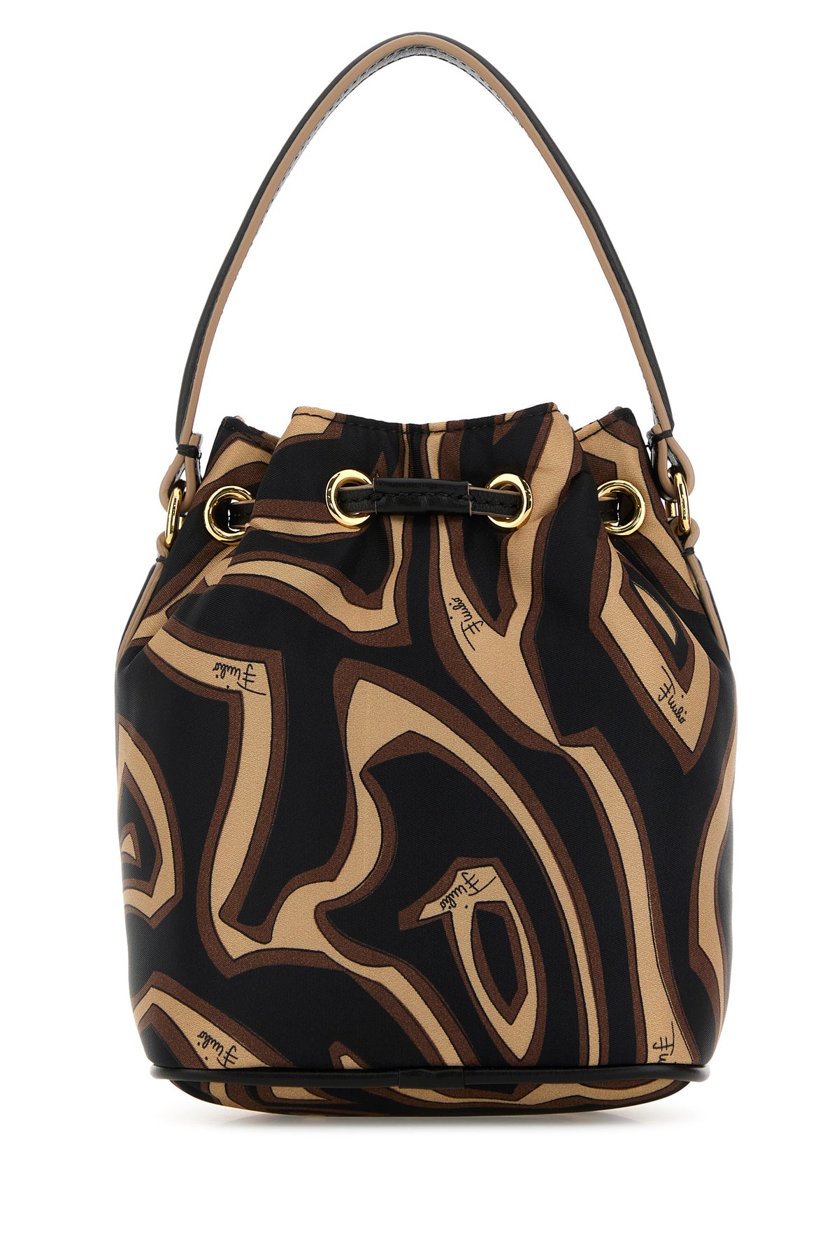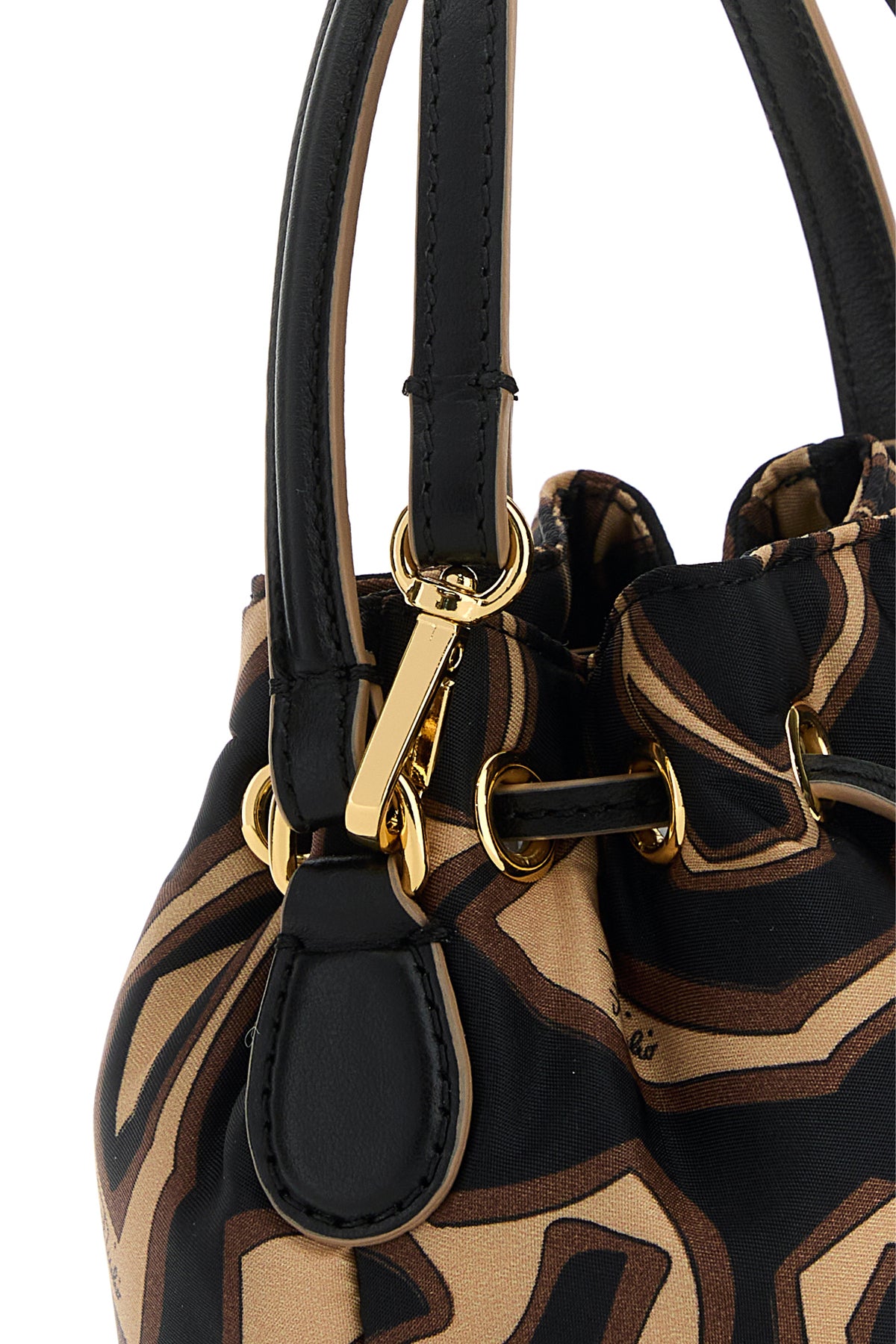 Bucket bag realized in padded nylon characterized by Labyrinth print on the entire surface enriched by metal logoed detail at the front.