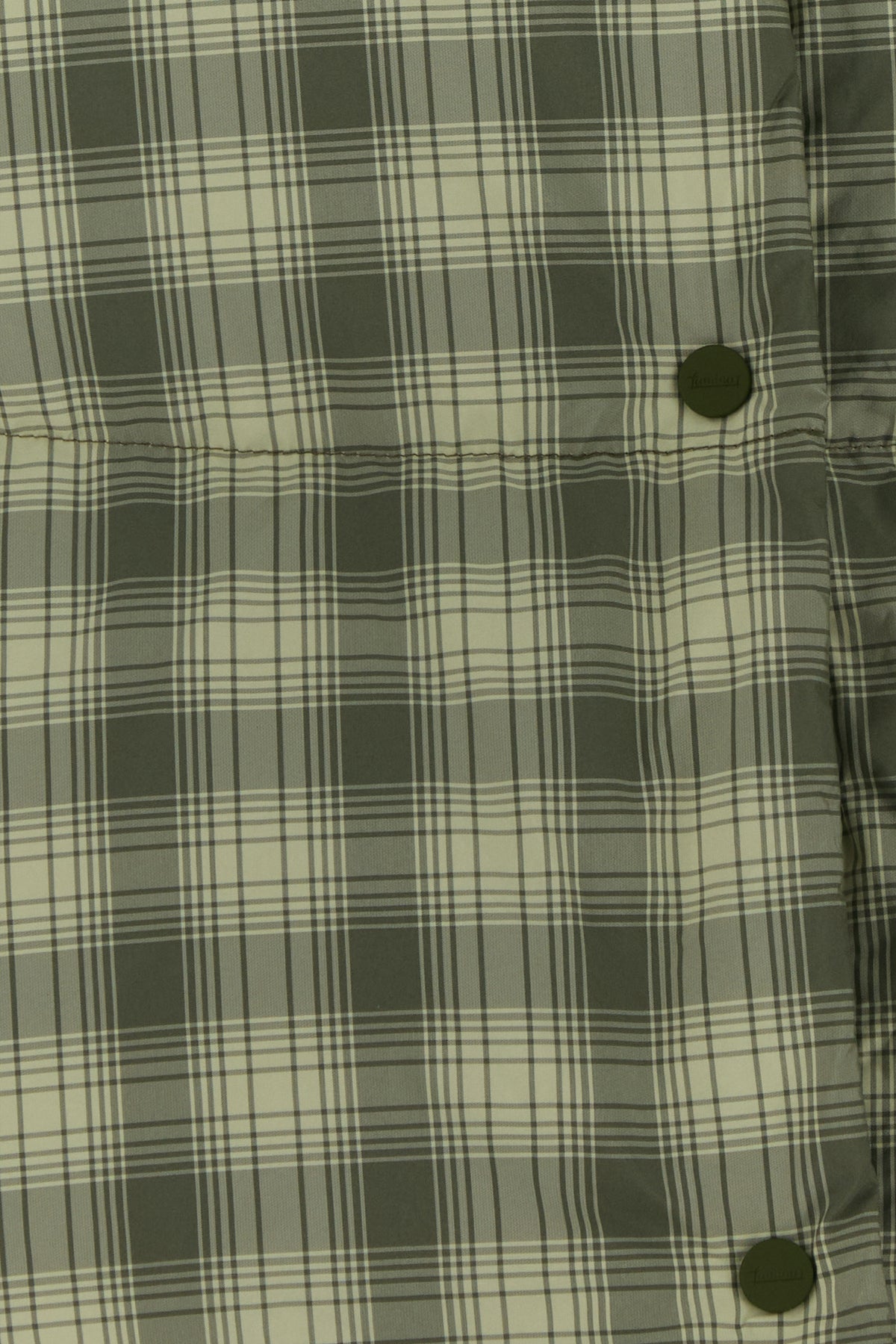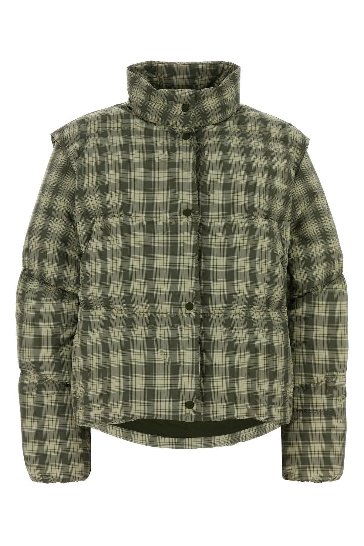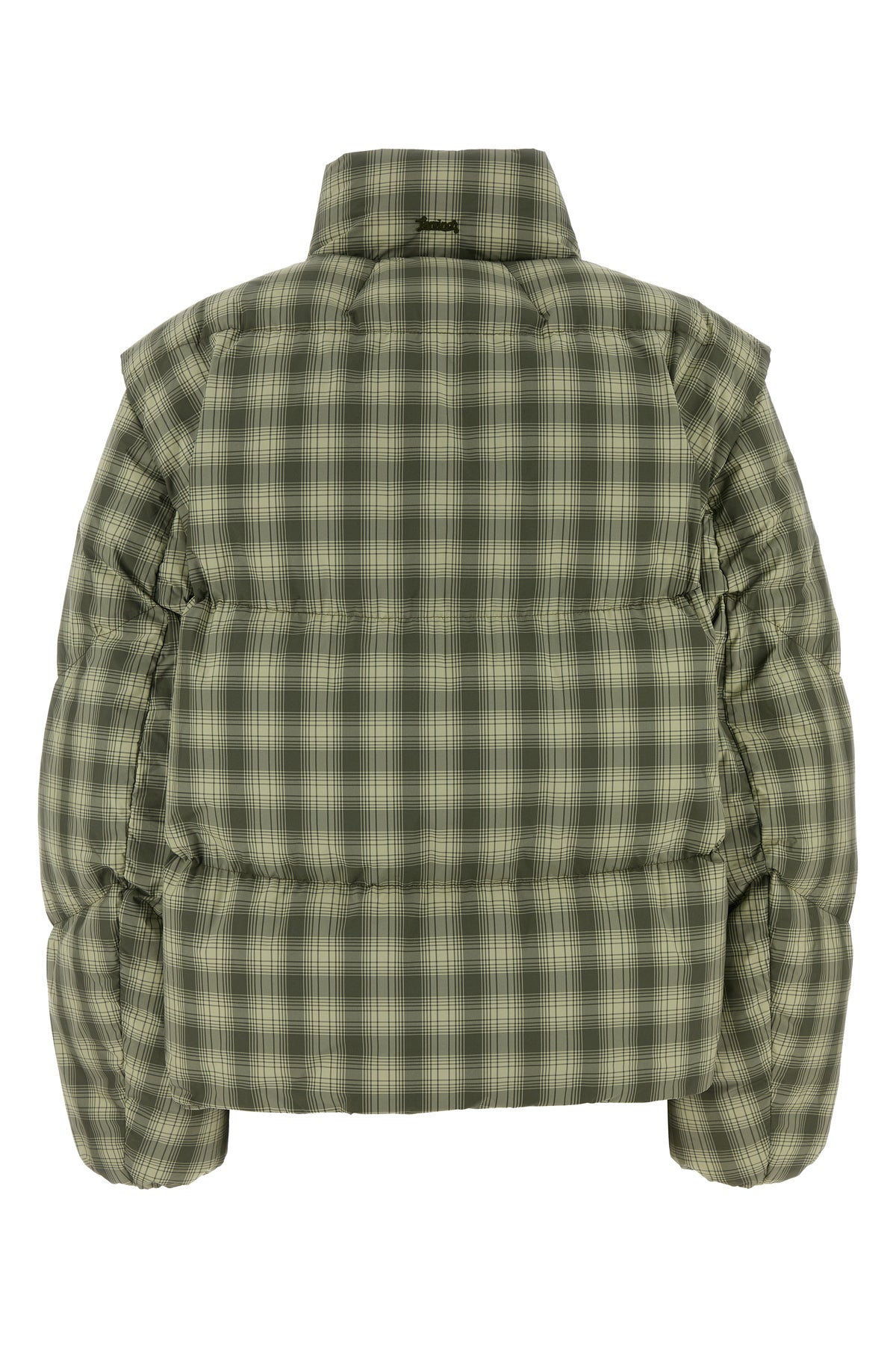 Down jacket realized in quilted polyester characterized by checked print on the entire surface.