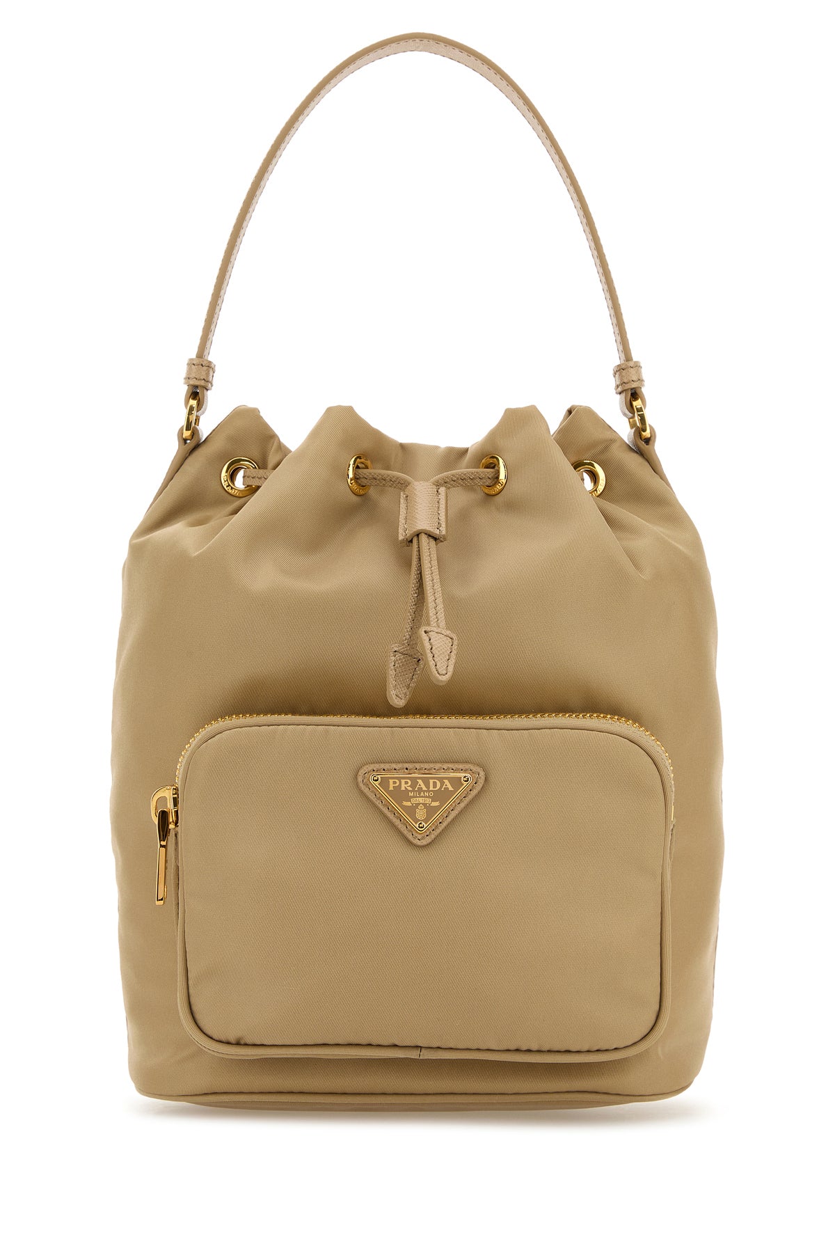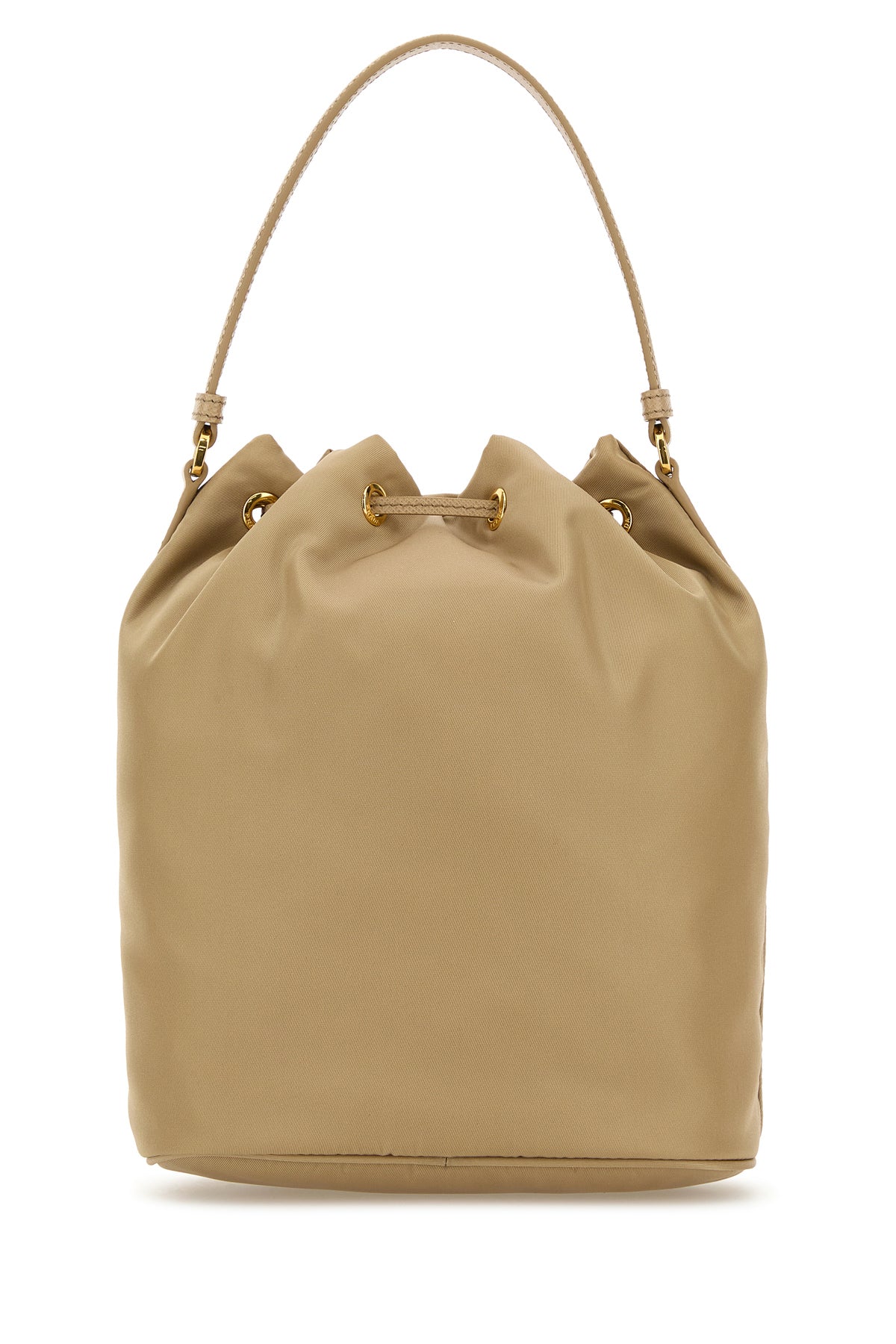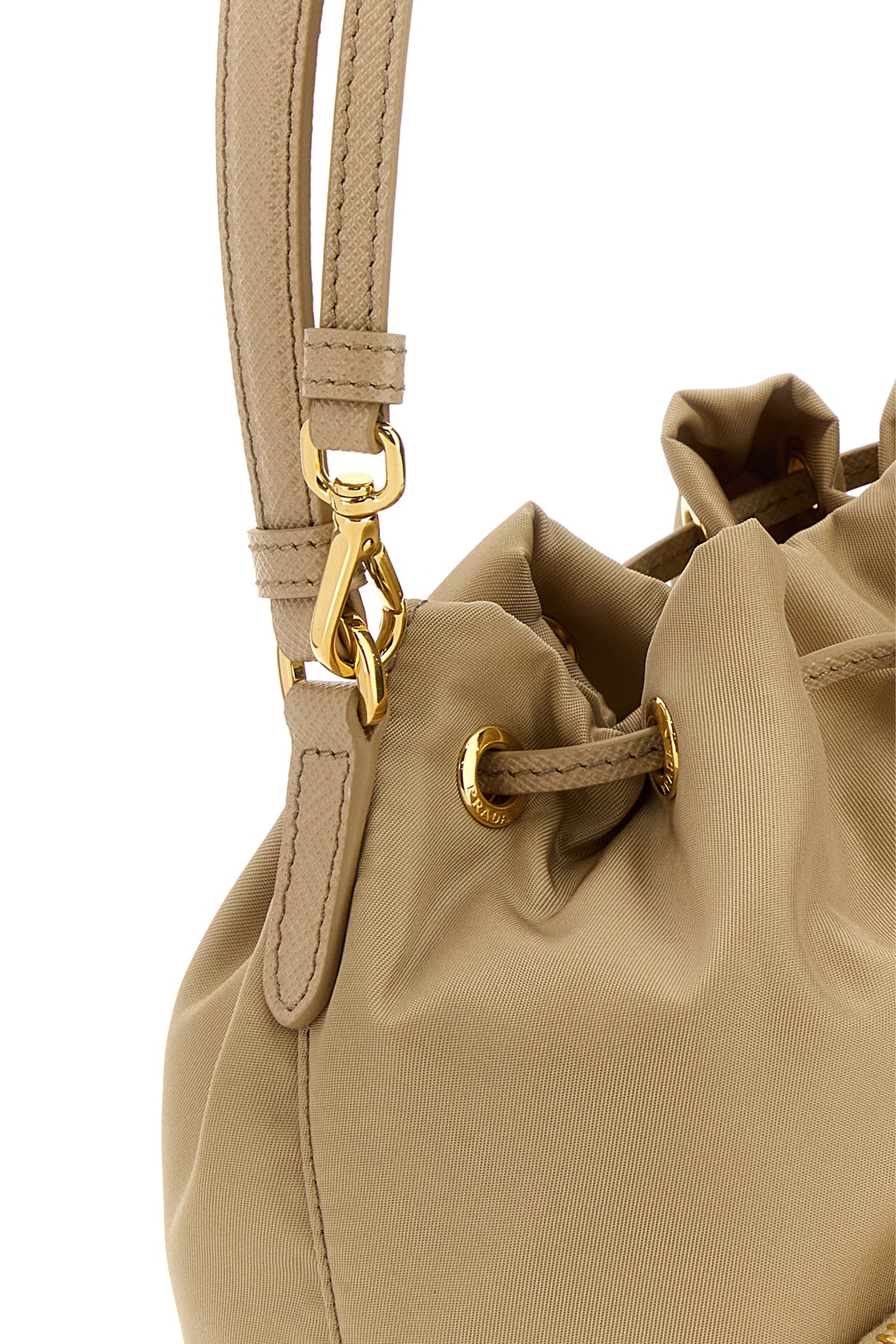 Bucket bag realized in Re-Nylon with Saffiano leather enriched by iconic logoed triangle at the front.