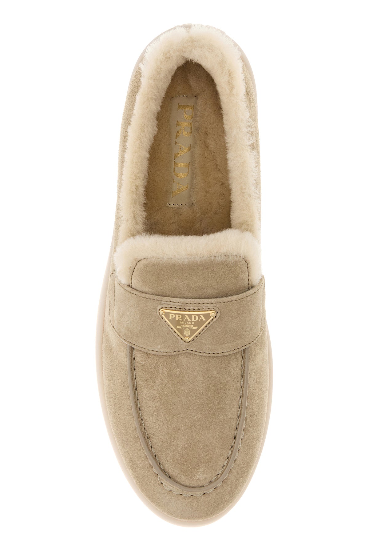 Loafers realized in suede enriched by iconic logoed metal triangle on the vamp.